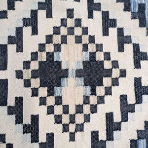 Squares of chunky, looped wool and raised stitching combine to create the rich, textural pattern the Checkerboard Diamond Dhurrie rug by West Elm. Using a special technique, artisans dye the fibers of the rug for a muted spectrum of blues. 80% wool, 20% cotton in Midnight.
