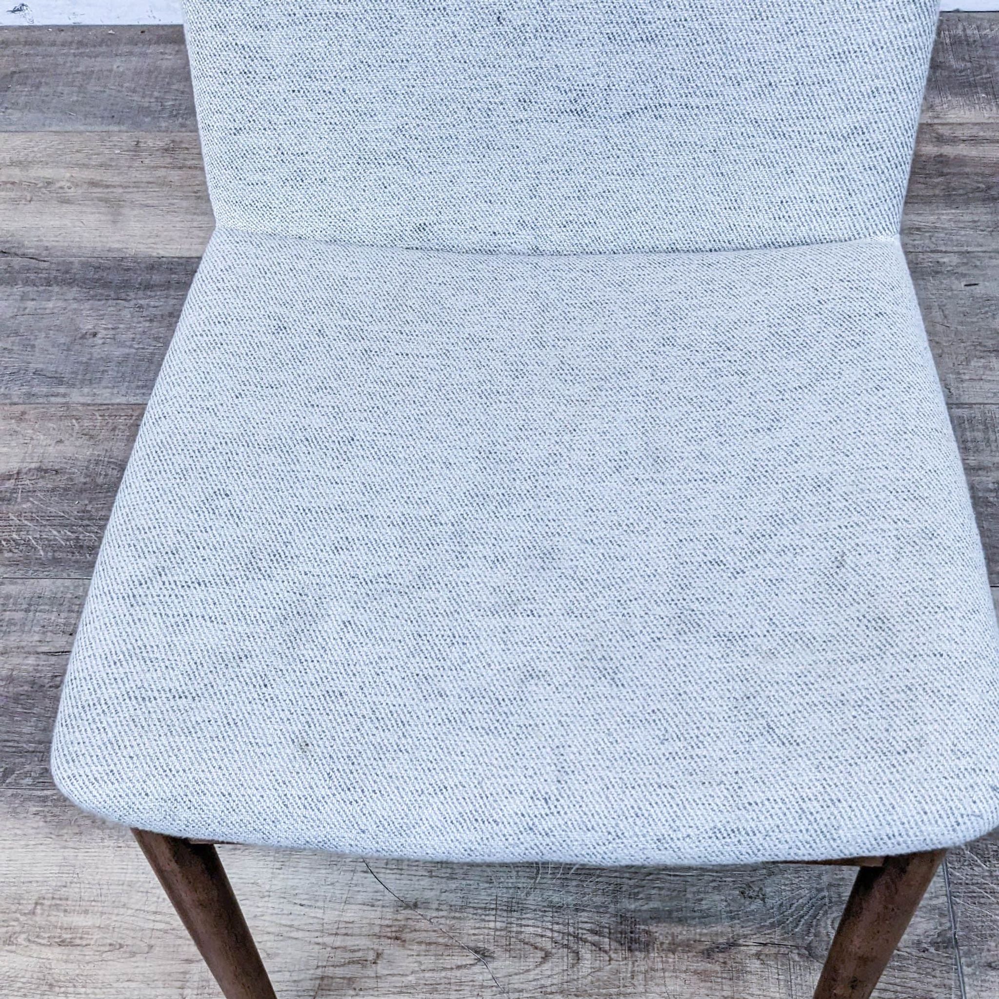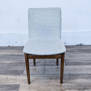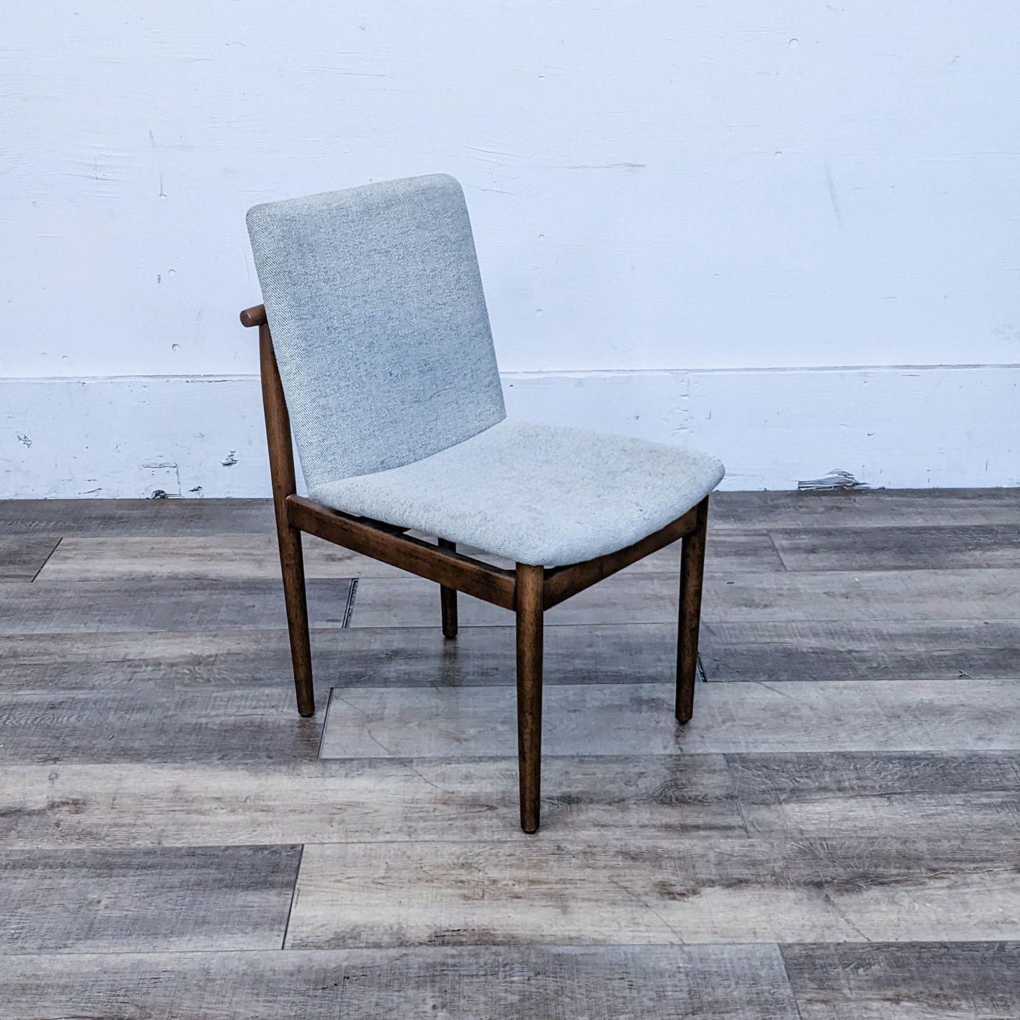 The Framework Dining chair by West Elm has contemporary design with a wood frame in a walnut finish and an upholstered padded seat and back.