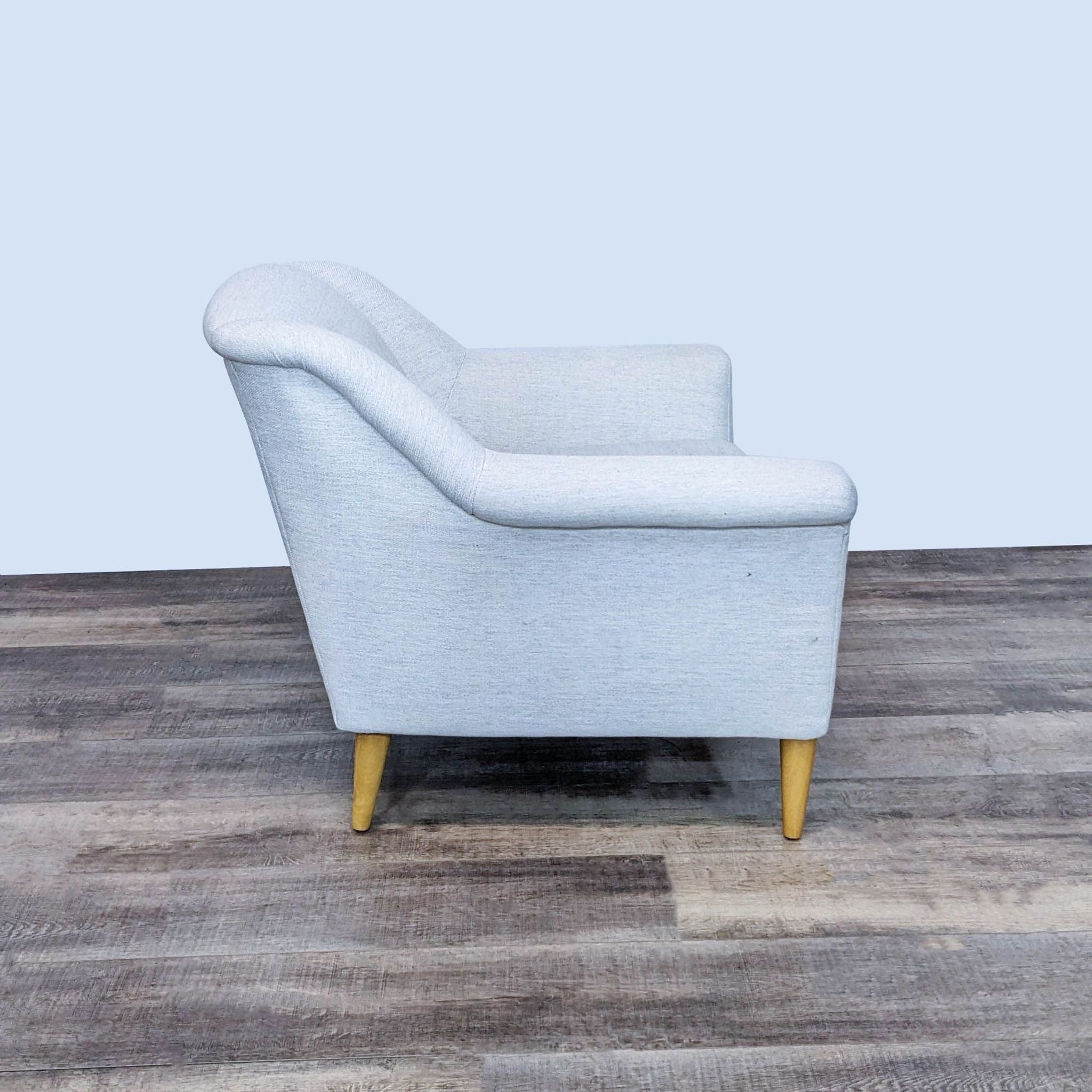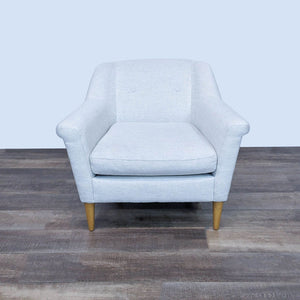 Experience comfort and style with this cozy lounge chair from West Elm. Its sturdy build, angled backrest, and soft fabric offer the perfect nook for relaxation.