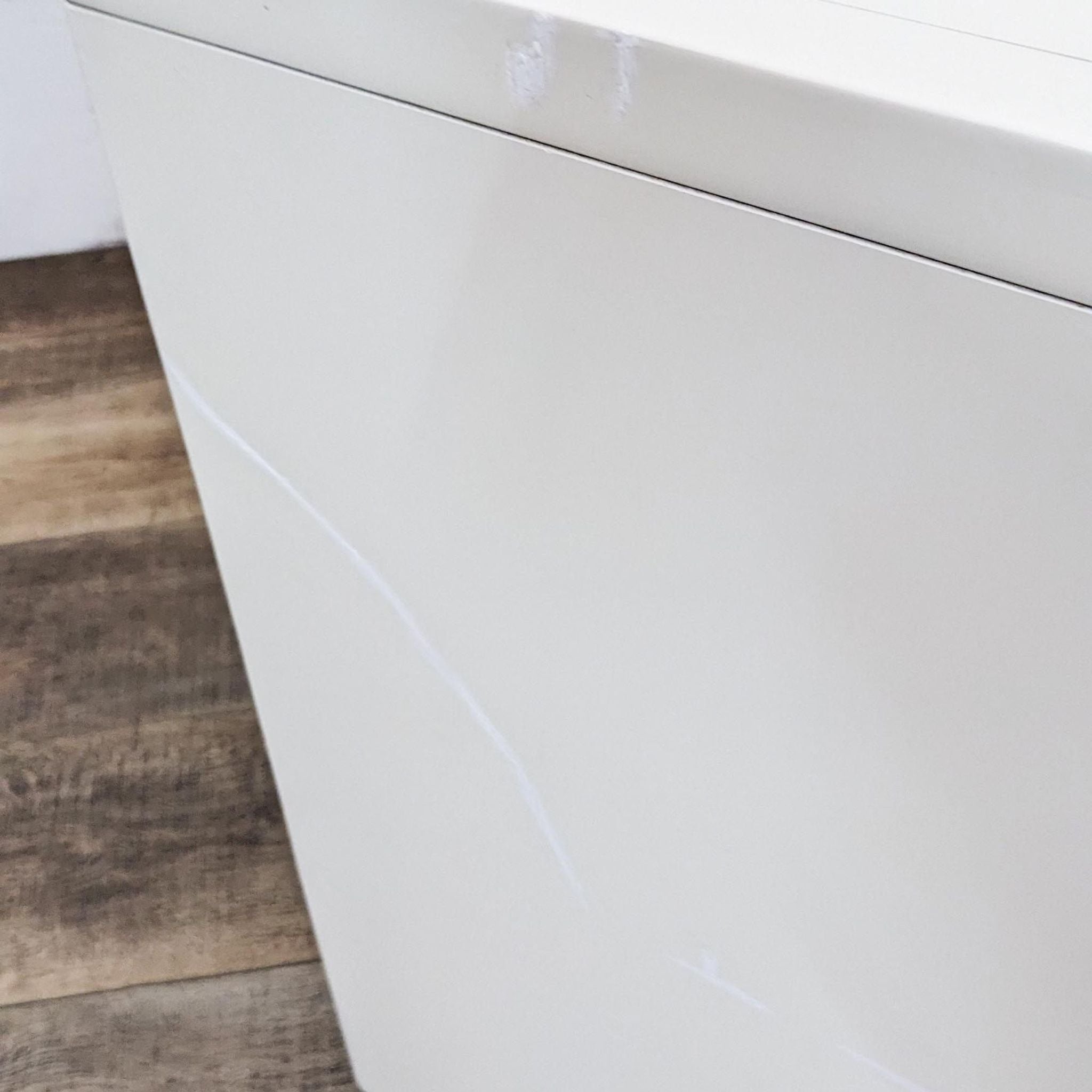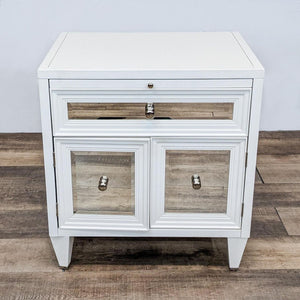 Drawer fronts and cabinet doors feature stepped moulding and beveled mirrors.