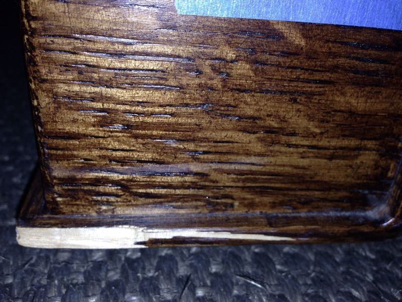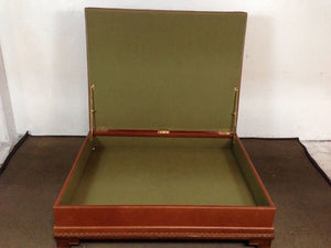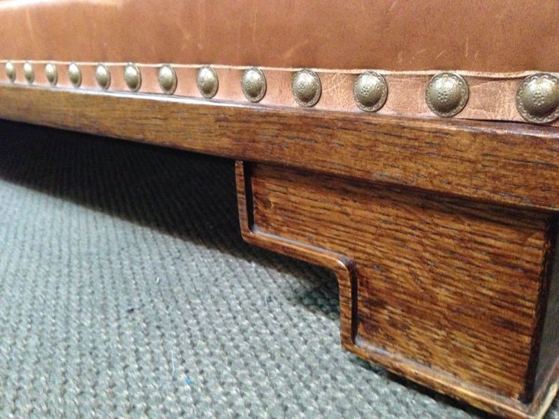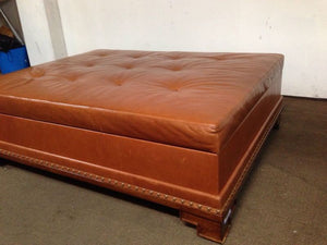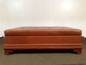 Raised on geometric form feet. One with condition issues (see photo). Bearing nailhead trim. Top lifts to reveal interior storage.