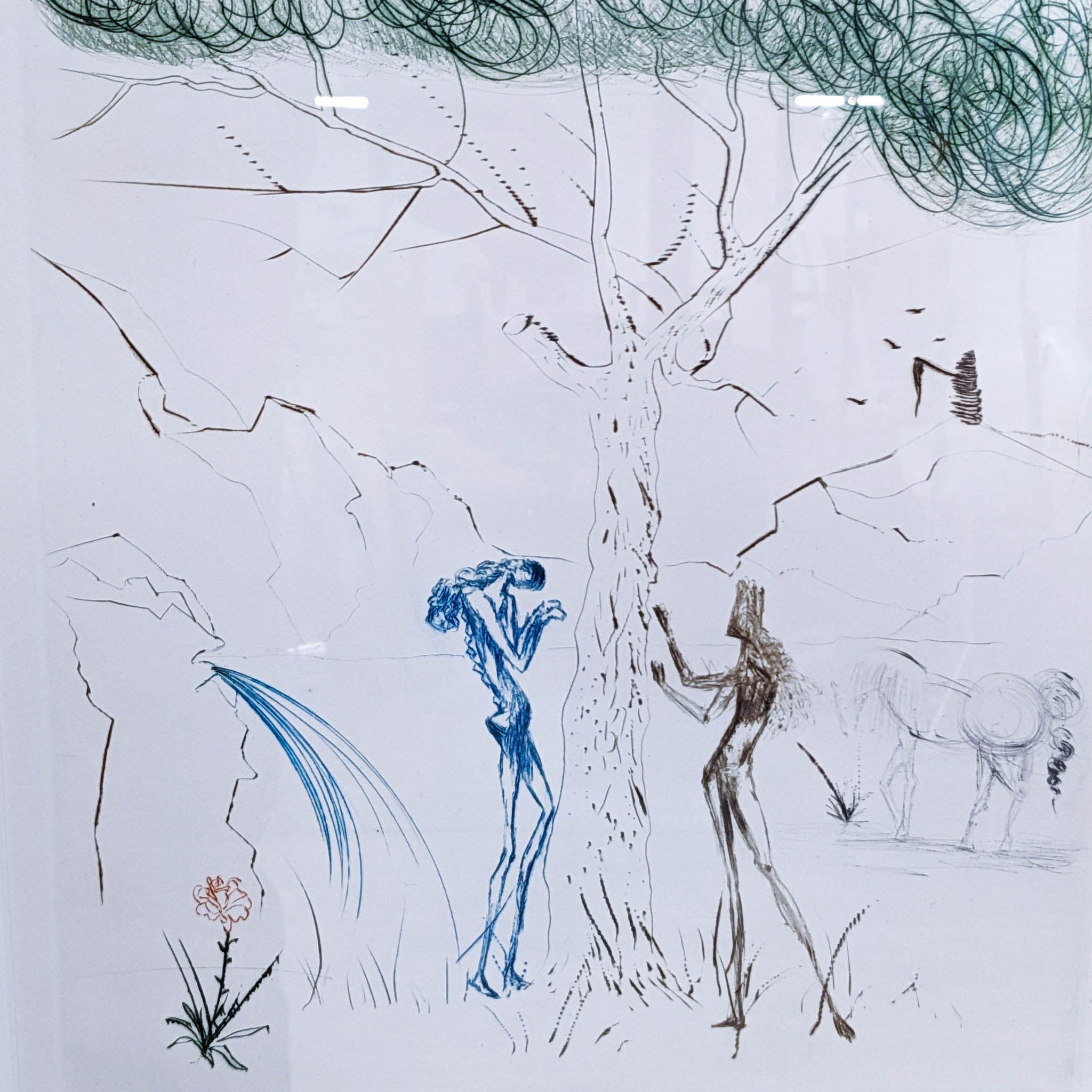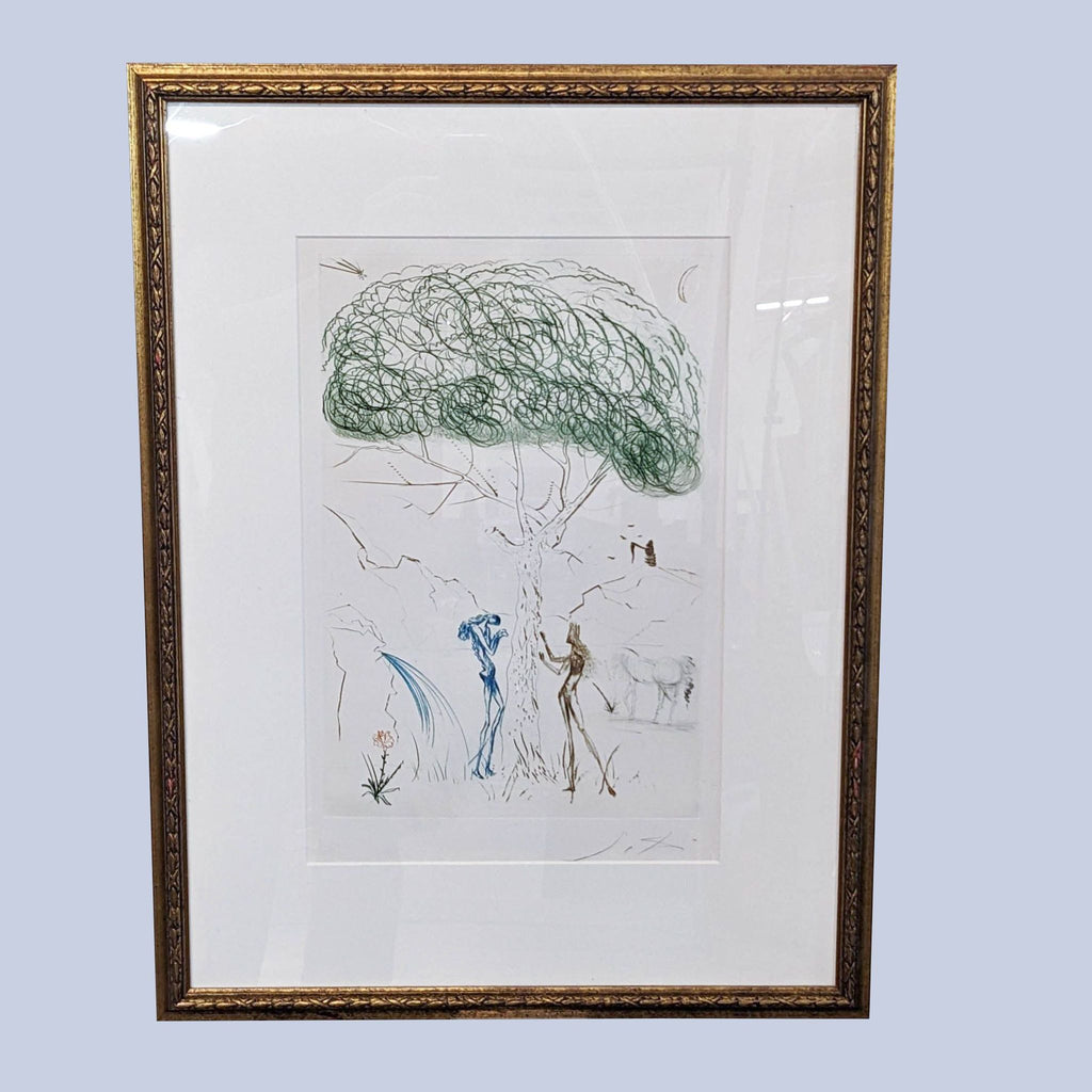 Original Drypoint Engraving by Salvador Dali titled "A Ruse And A Shadow Beneath A Pine". Signed by Artist. Appraised at $4200. New mat, new plexiglas, purchased Dec 2023.
