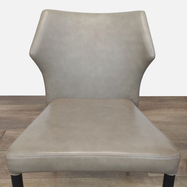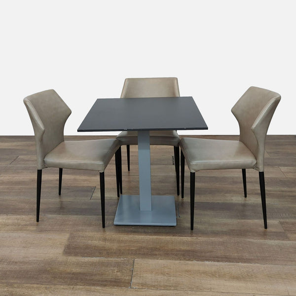 This dining set features a glass top round table with a single pedestal metal base from Room & Board and 2 upholstered high back dining chairs from EQ3
