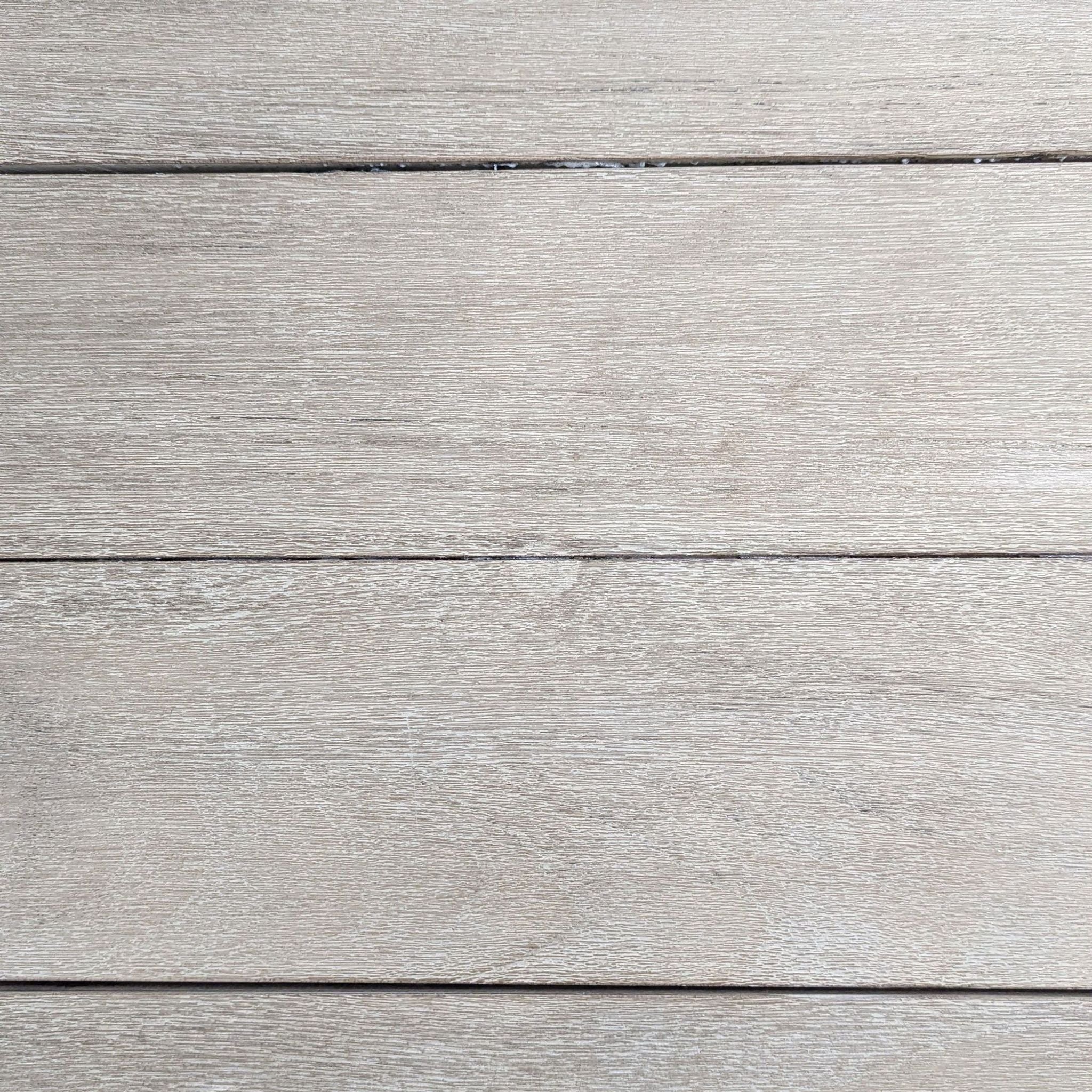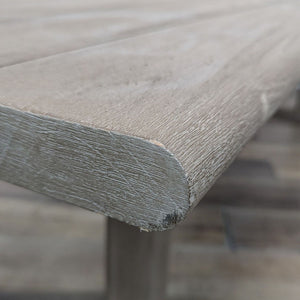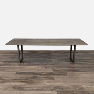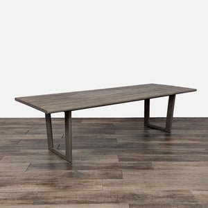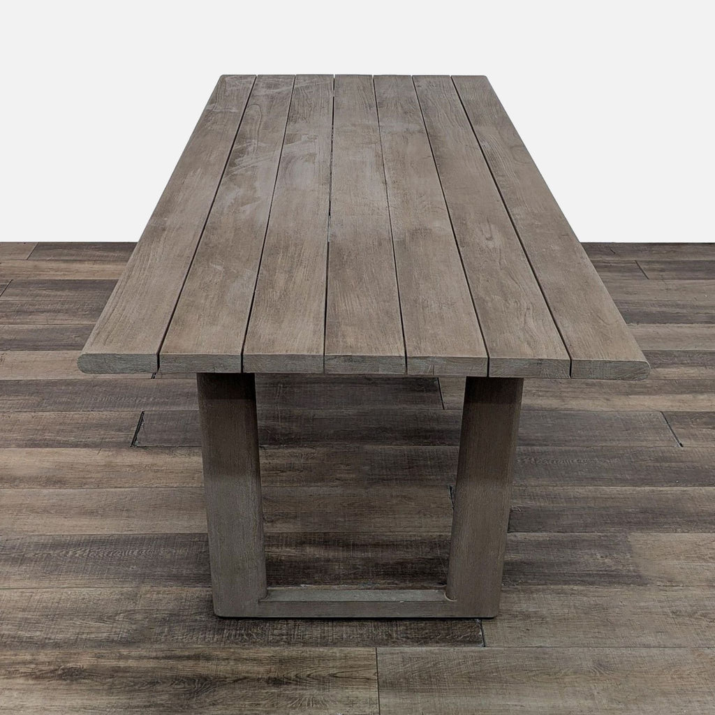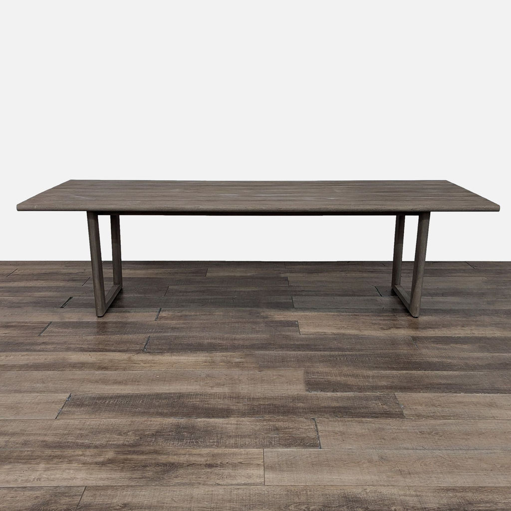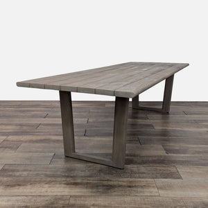 The Mesa outdoor dining table has mid century style constructed of weathered teak with a pair of open, architectural stirrup bases that supports the table's slatted top.