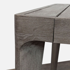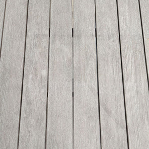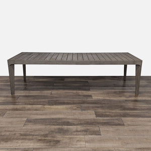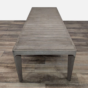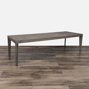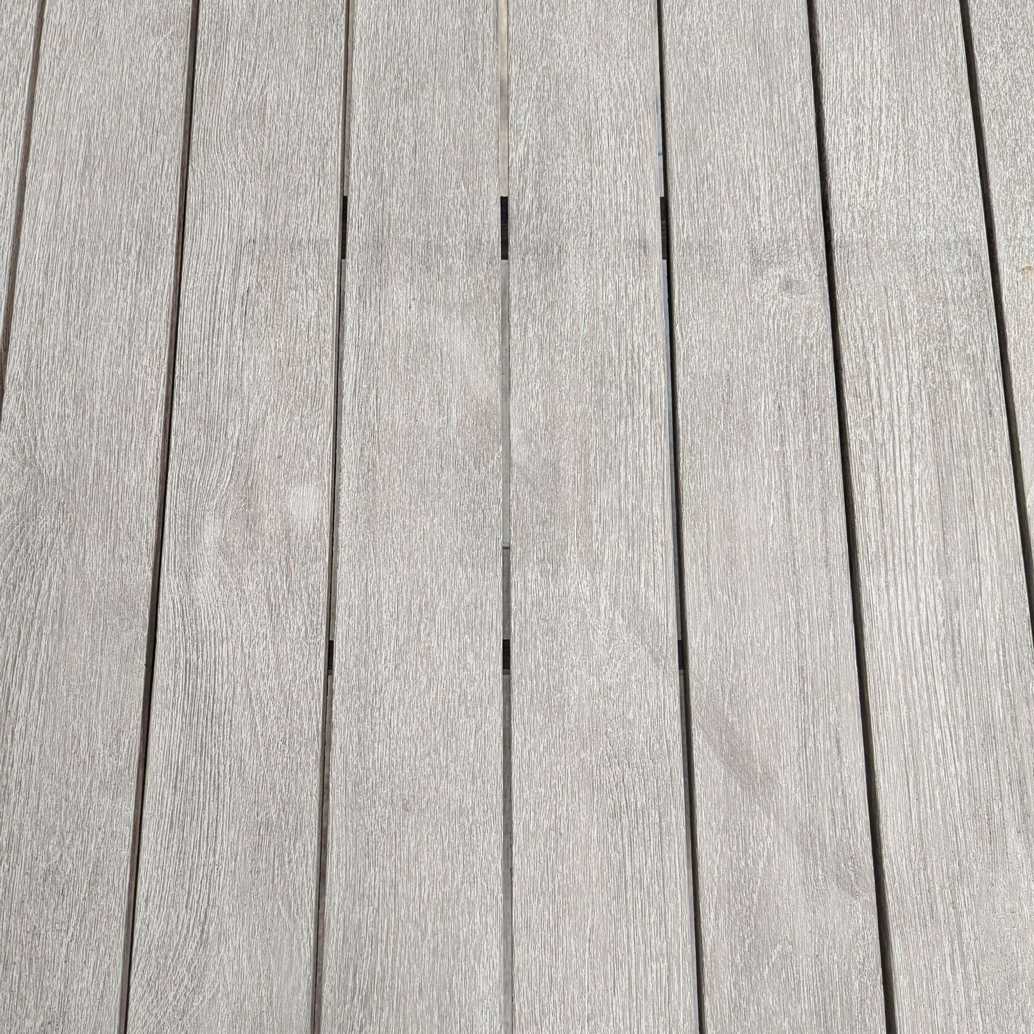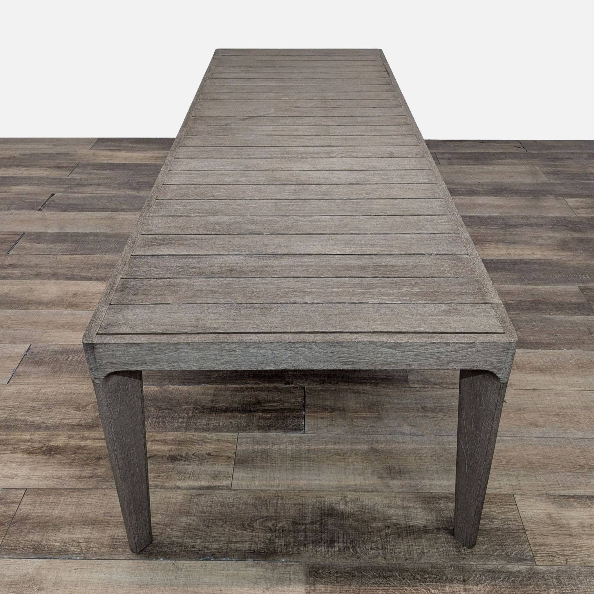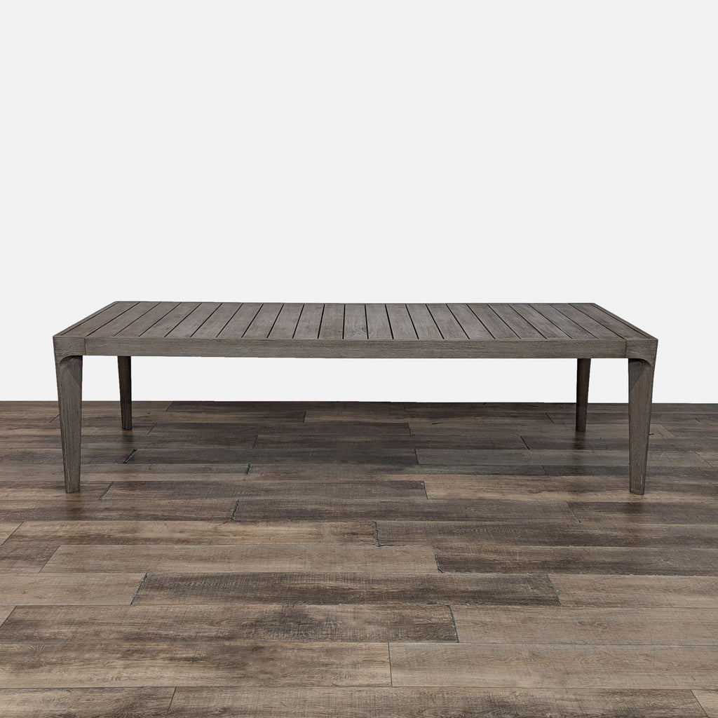 The Malta outdoor dining table features mid century style and is constructed of weathered teak with angled tapered legs.
