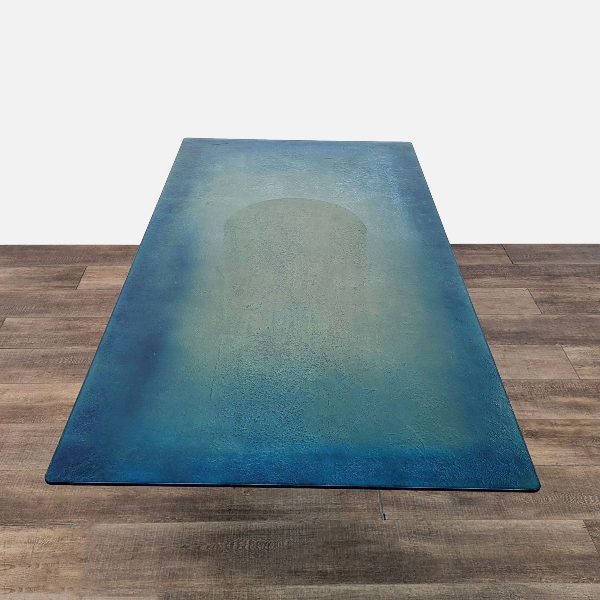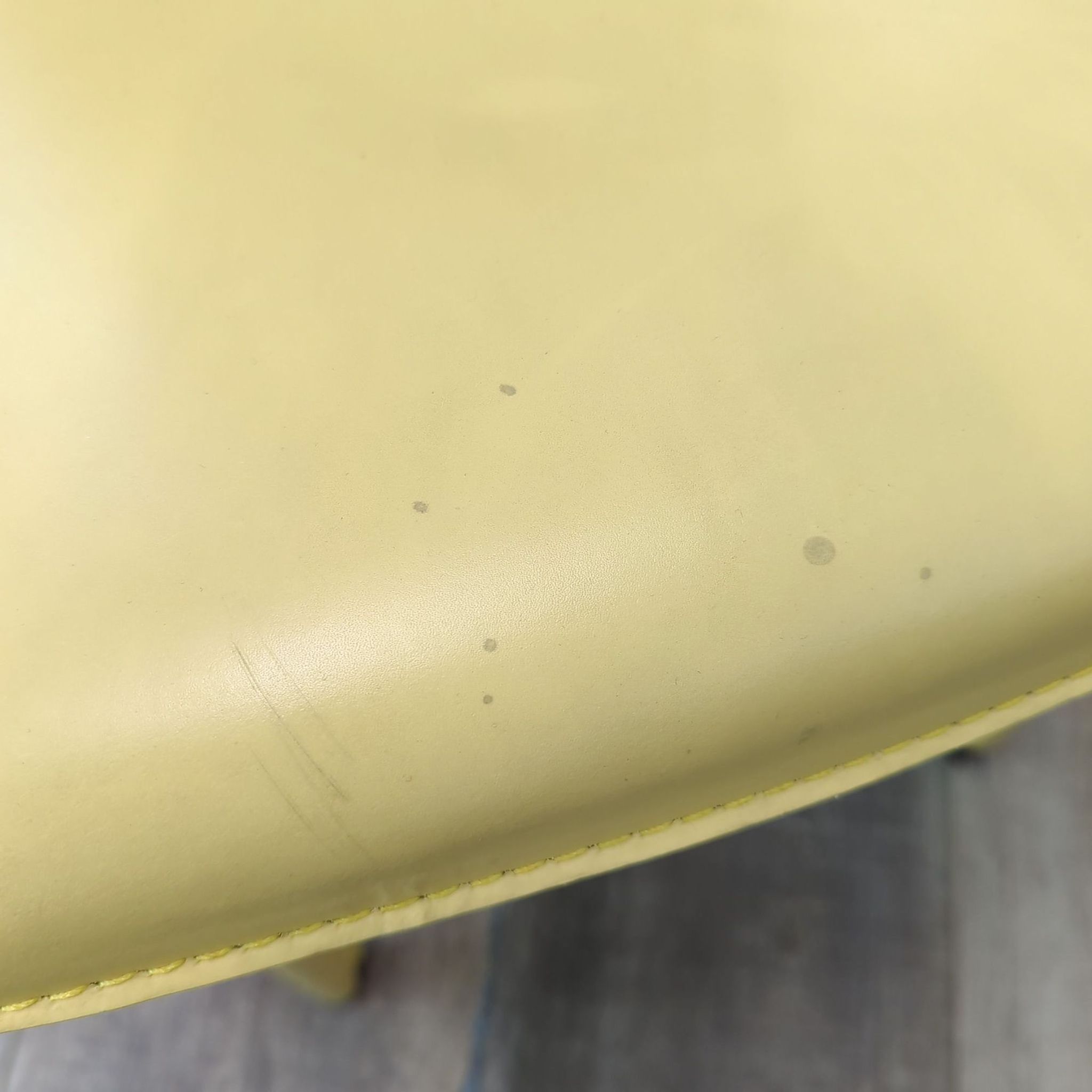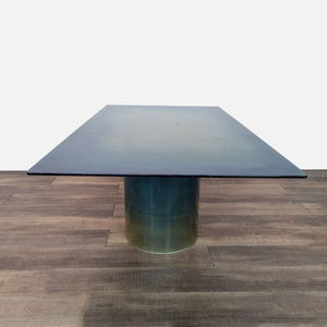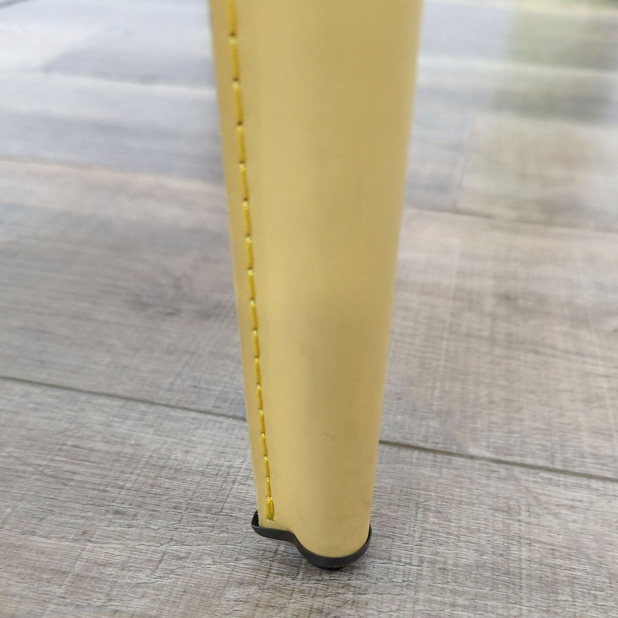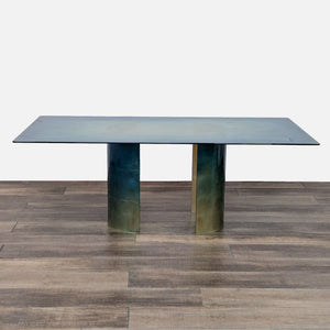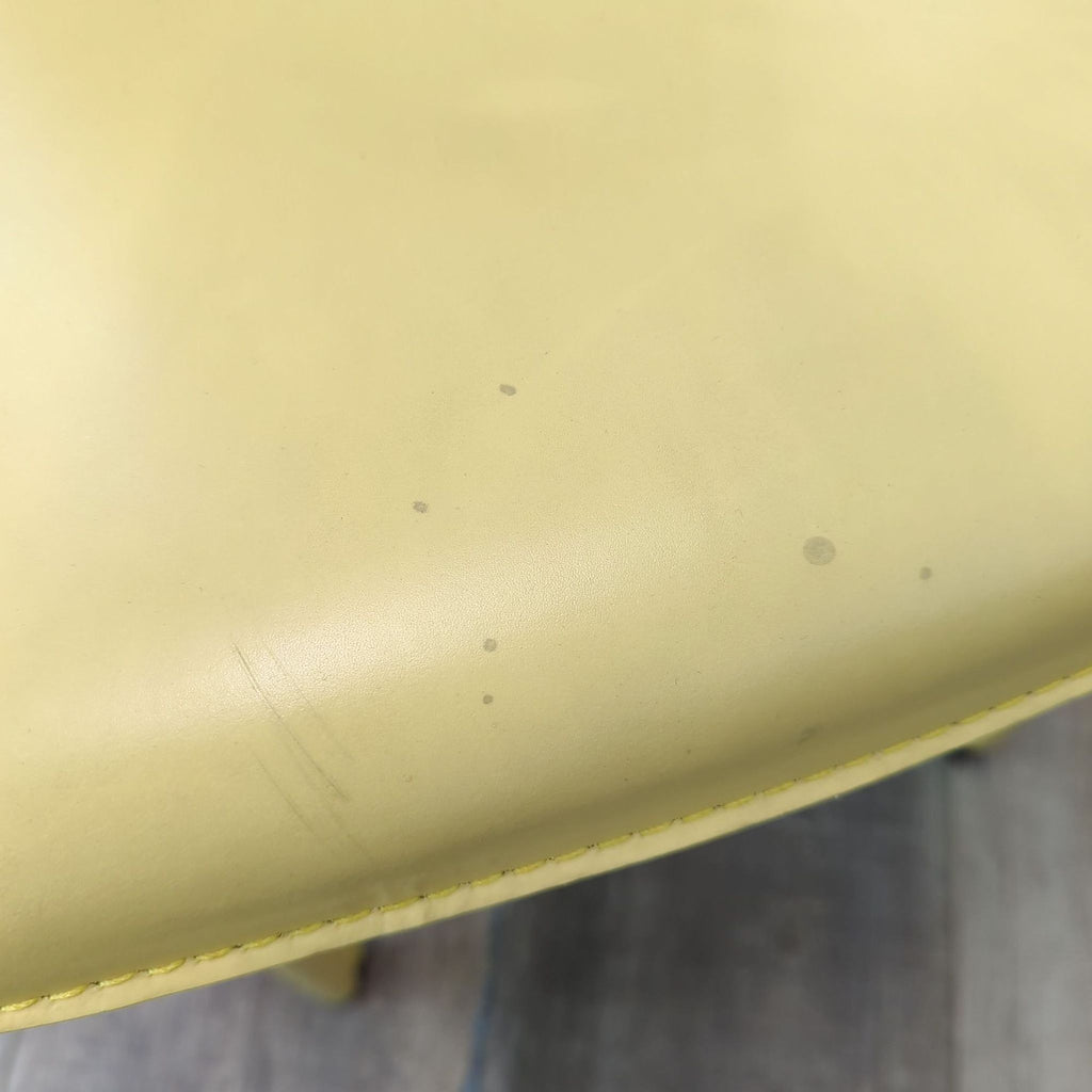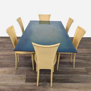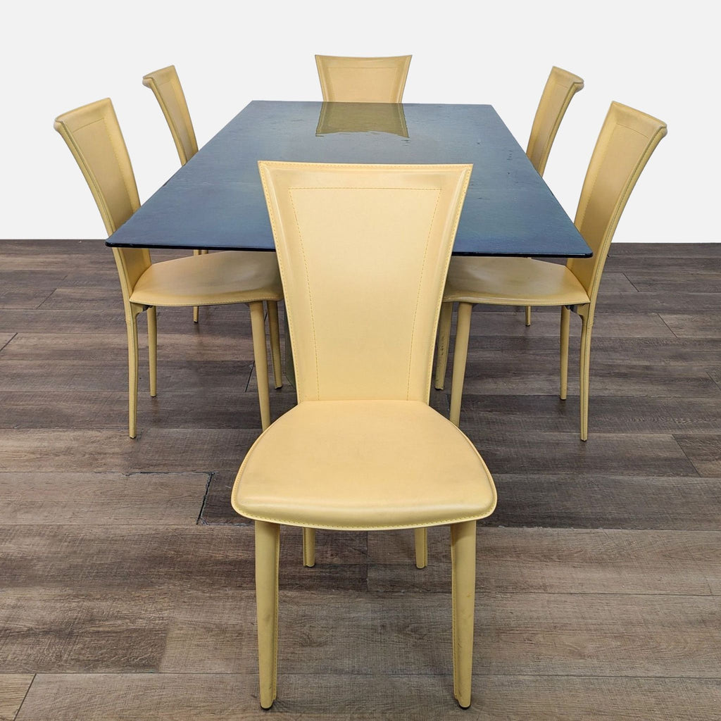 Rectangle glass top dining table with metal double pedestal base and 6 yellow leather dining chairs.