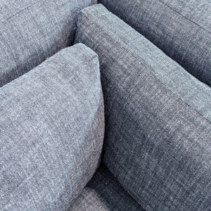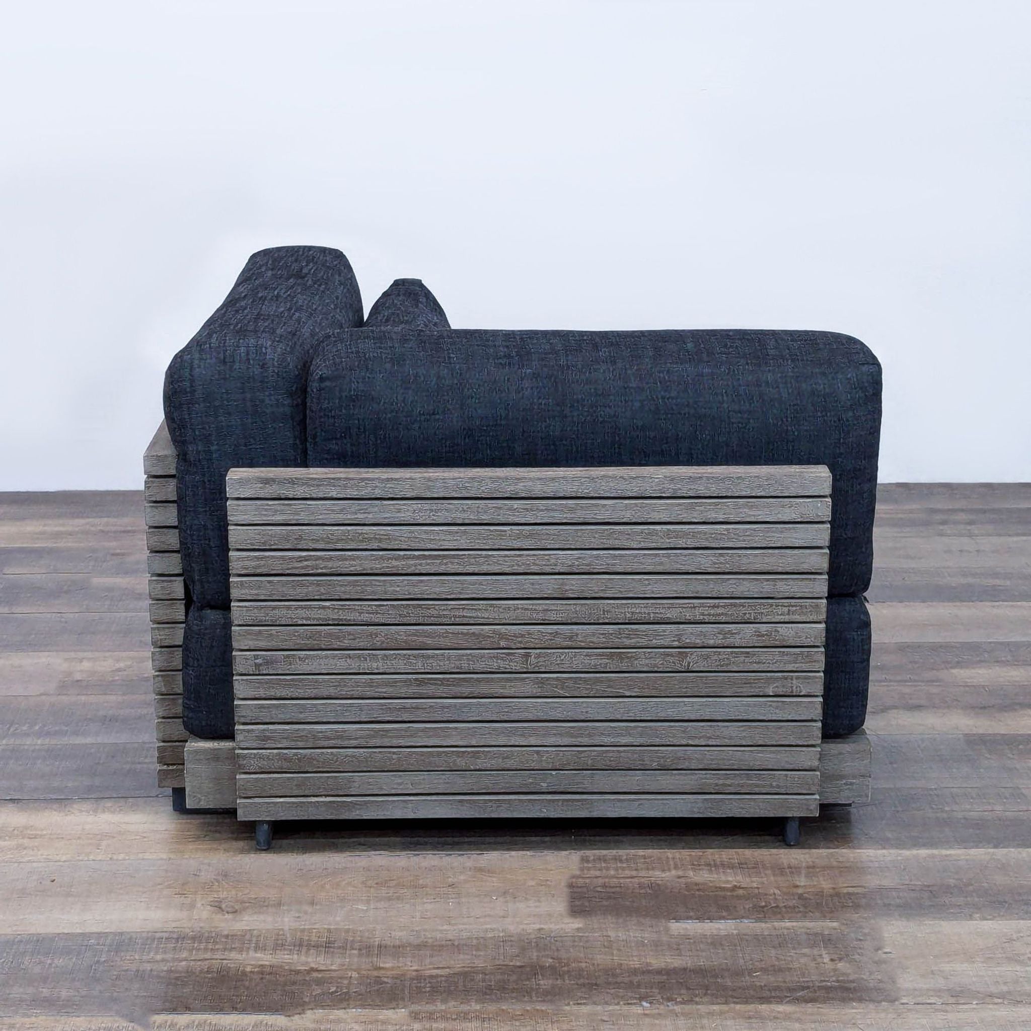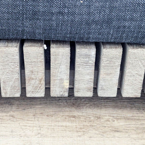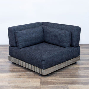The Caicos modular corner chair is constructed of weathered teak with rows of parallel slats that offer a bold play of contrast and shadow. The Quick dry cushions are upholstered in performance linen weave.
