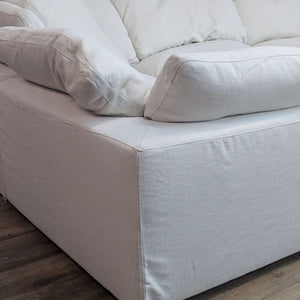 Restoration Hardware L-Shaped sectional sofa with removable plush cushions.