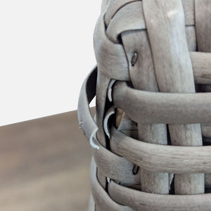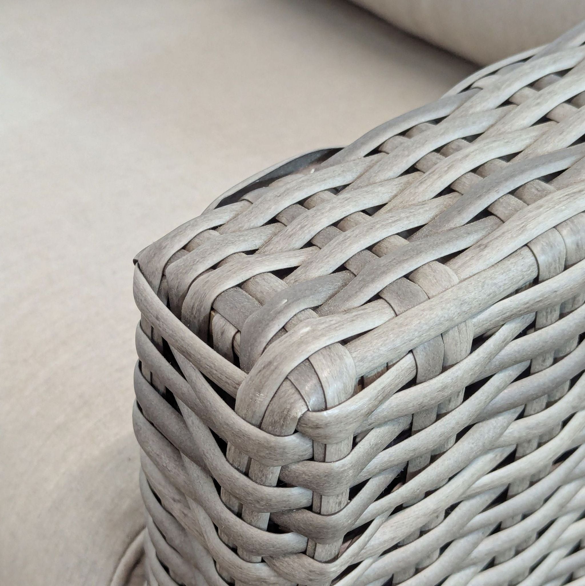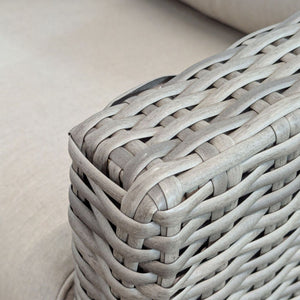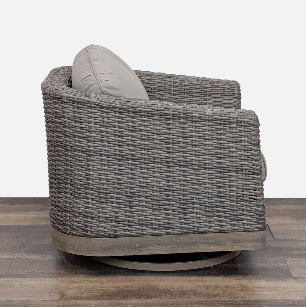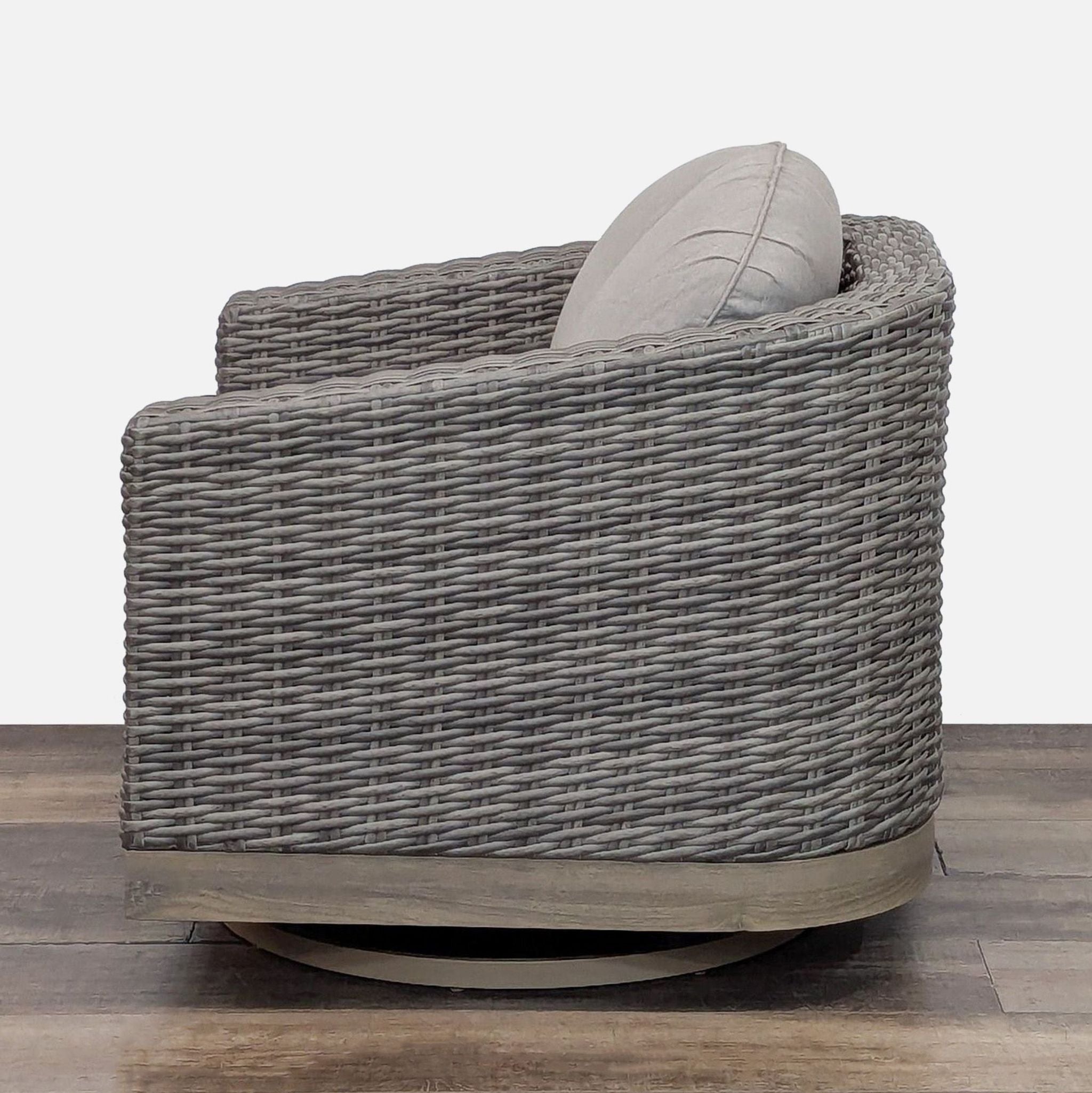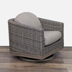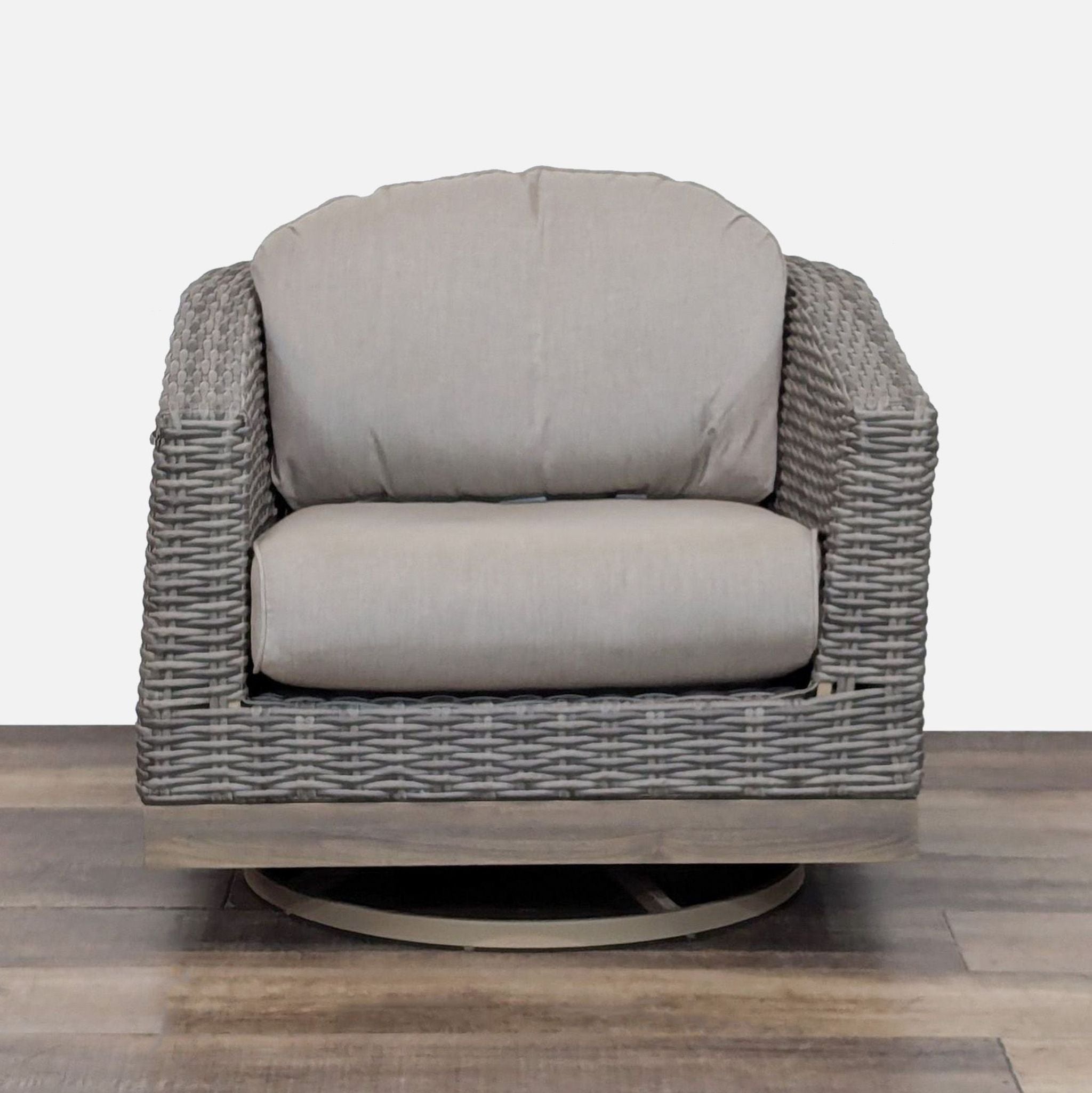 This outdoor chair features a classic wicker exterior weave, weather-resistant steel frame, swivel base and Sunbrella cushions.