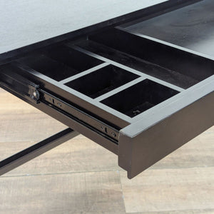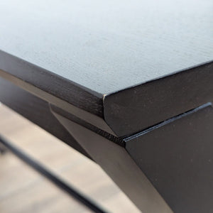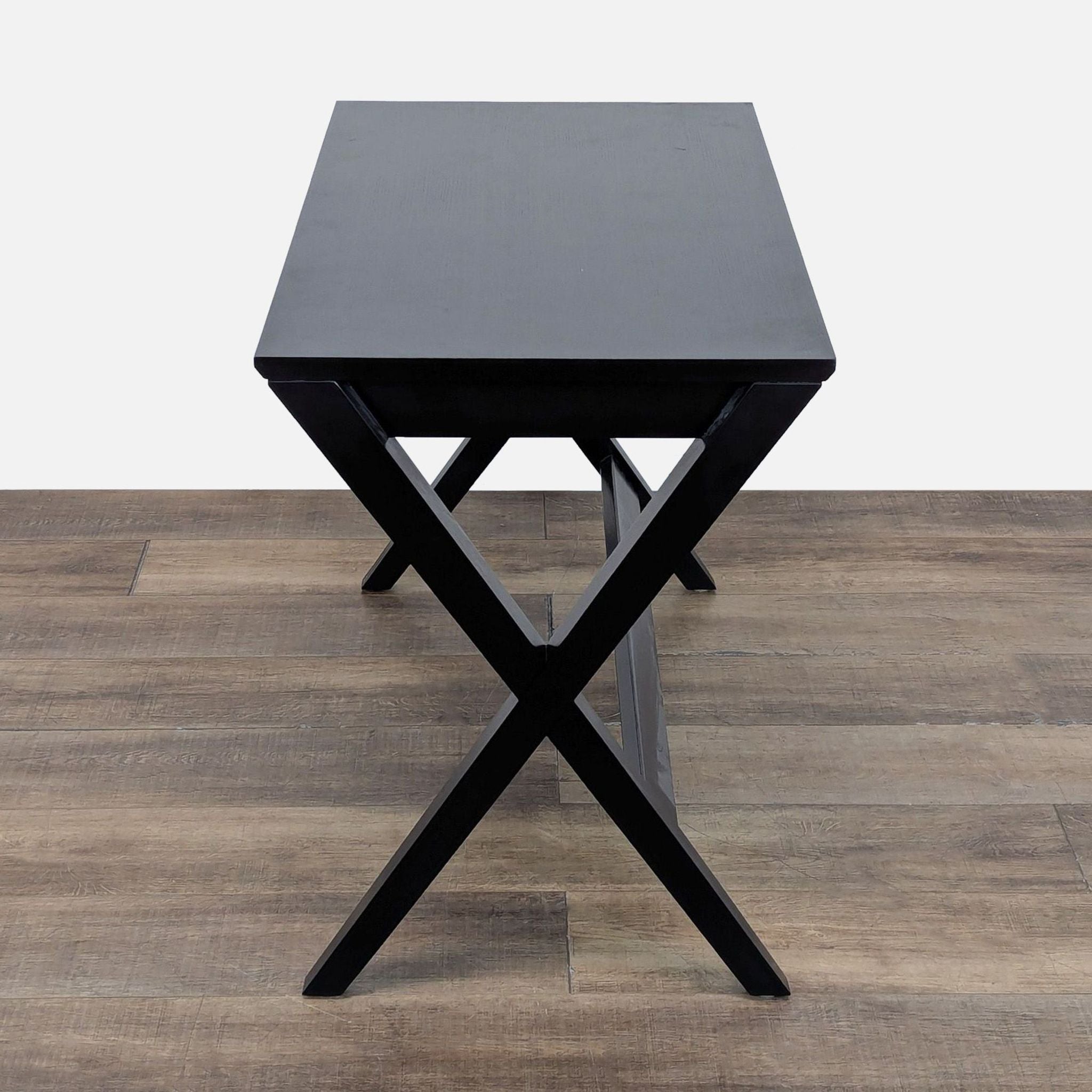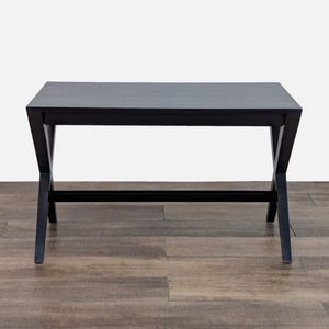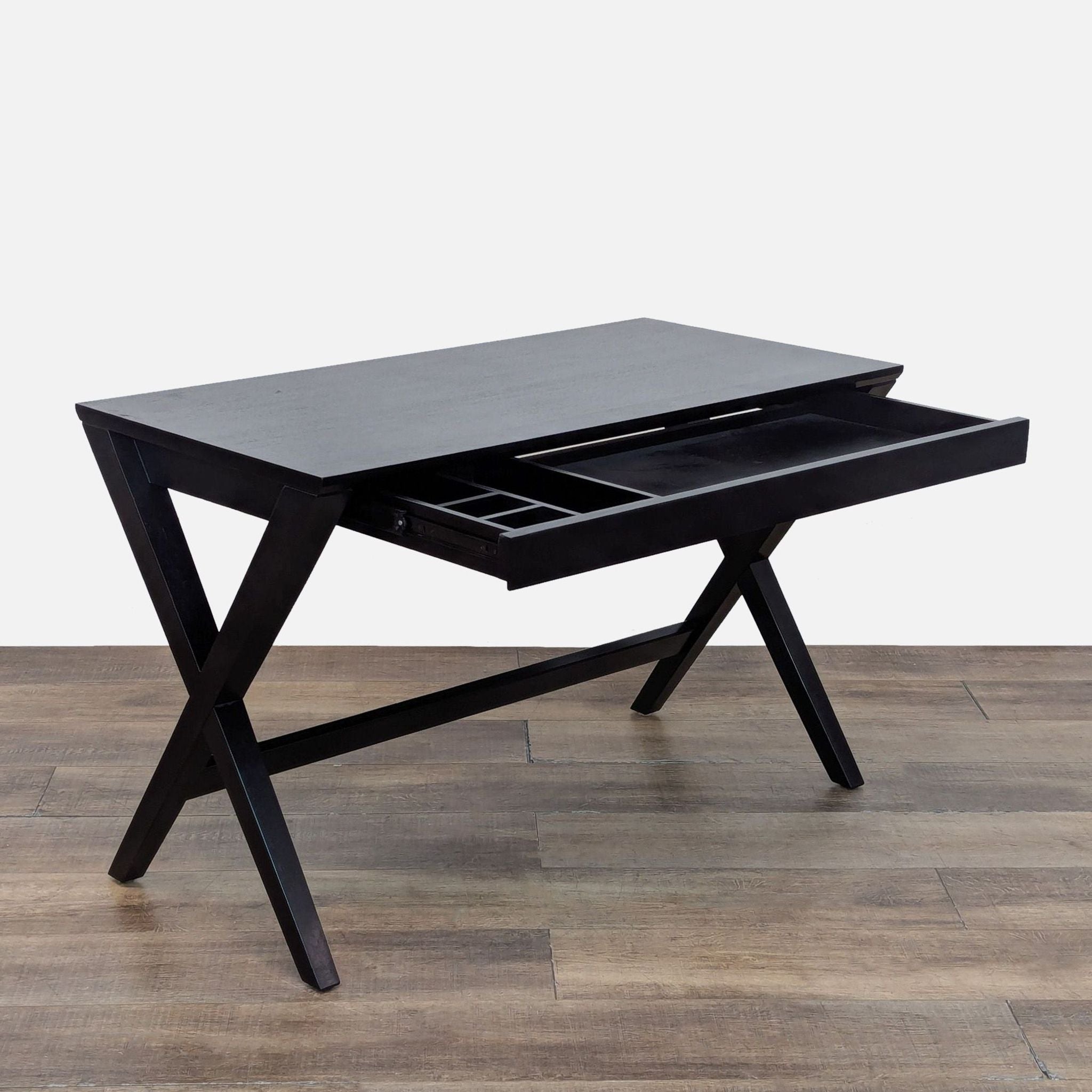 This desk's crossed legs, stained deep black, support a sleek tabletop with a slim, wide drawer that slides out to reveal smart storage and flips into a work surface.