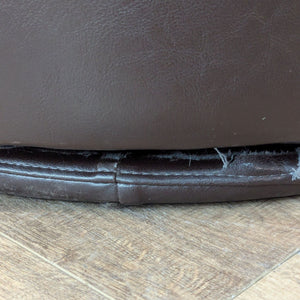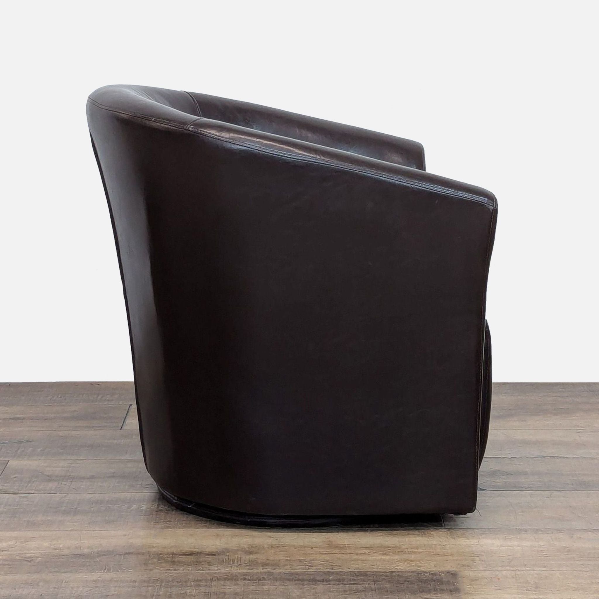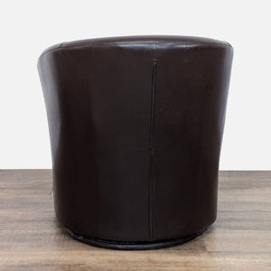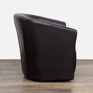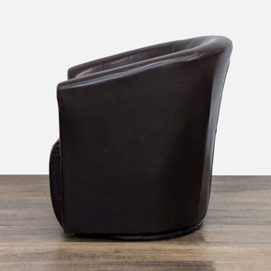 Barrel back style on a faux leather wrapped metal swivel base with brown faux leather upholstery.