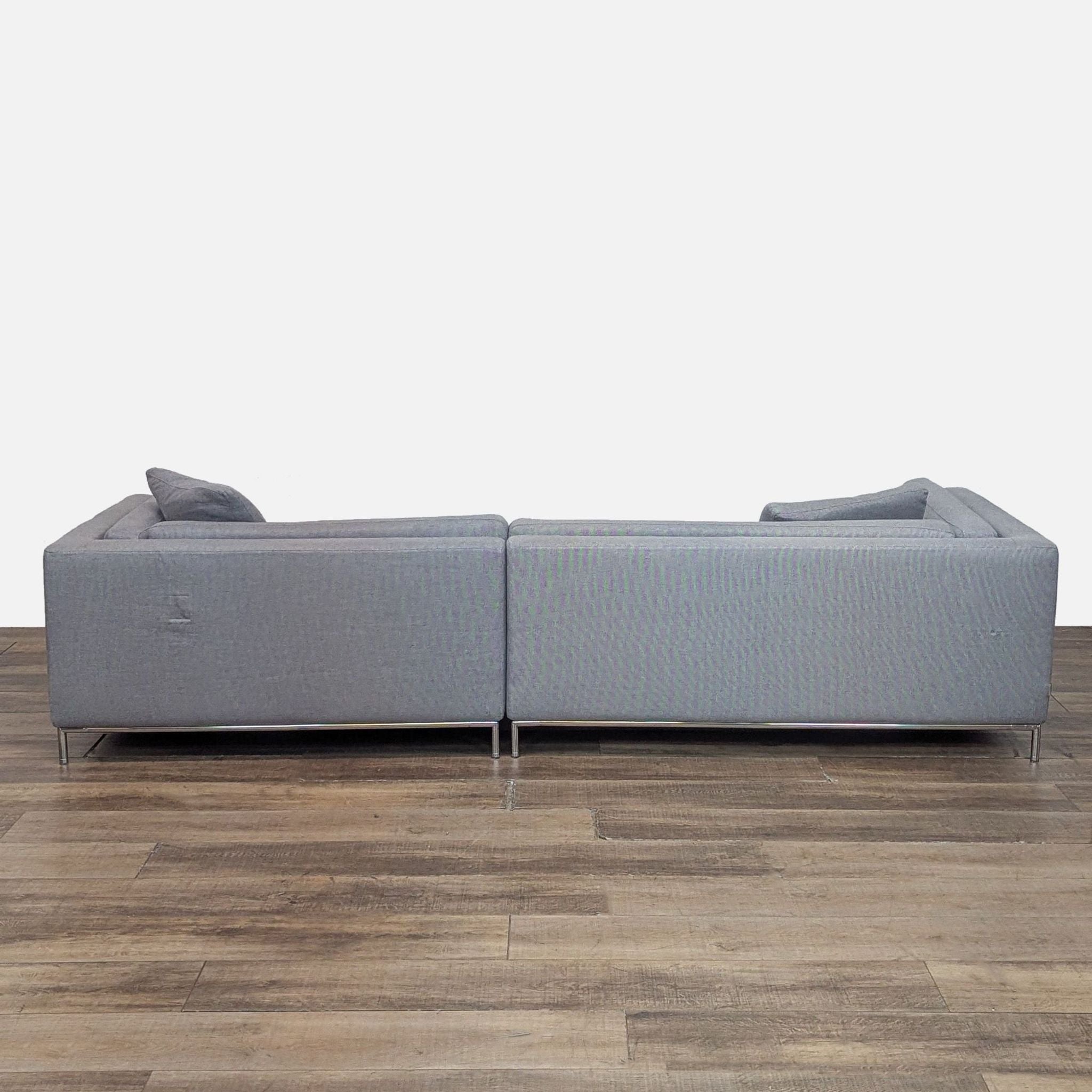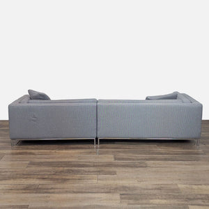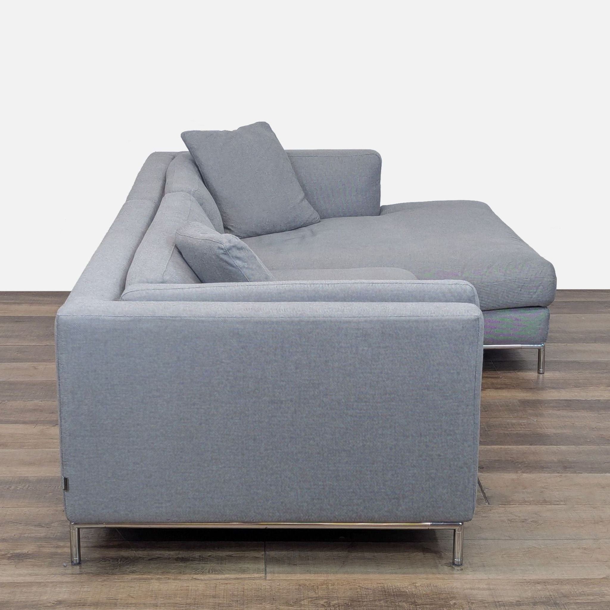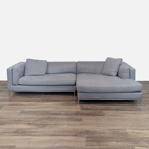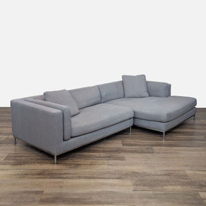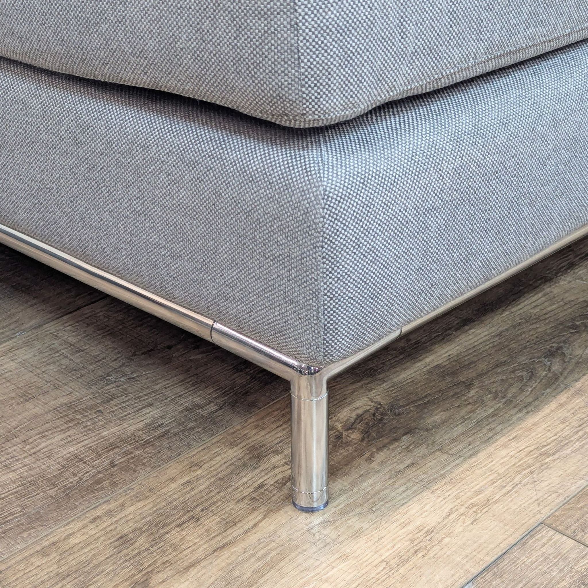 Upholstered sectional with right hand chaise and chrome metal base and feet.