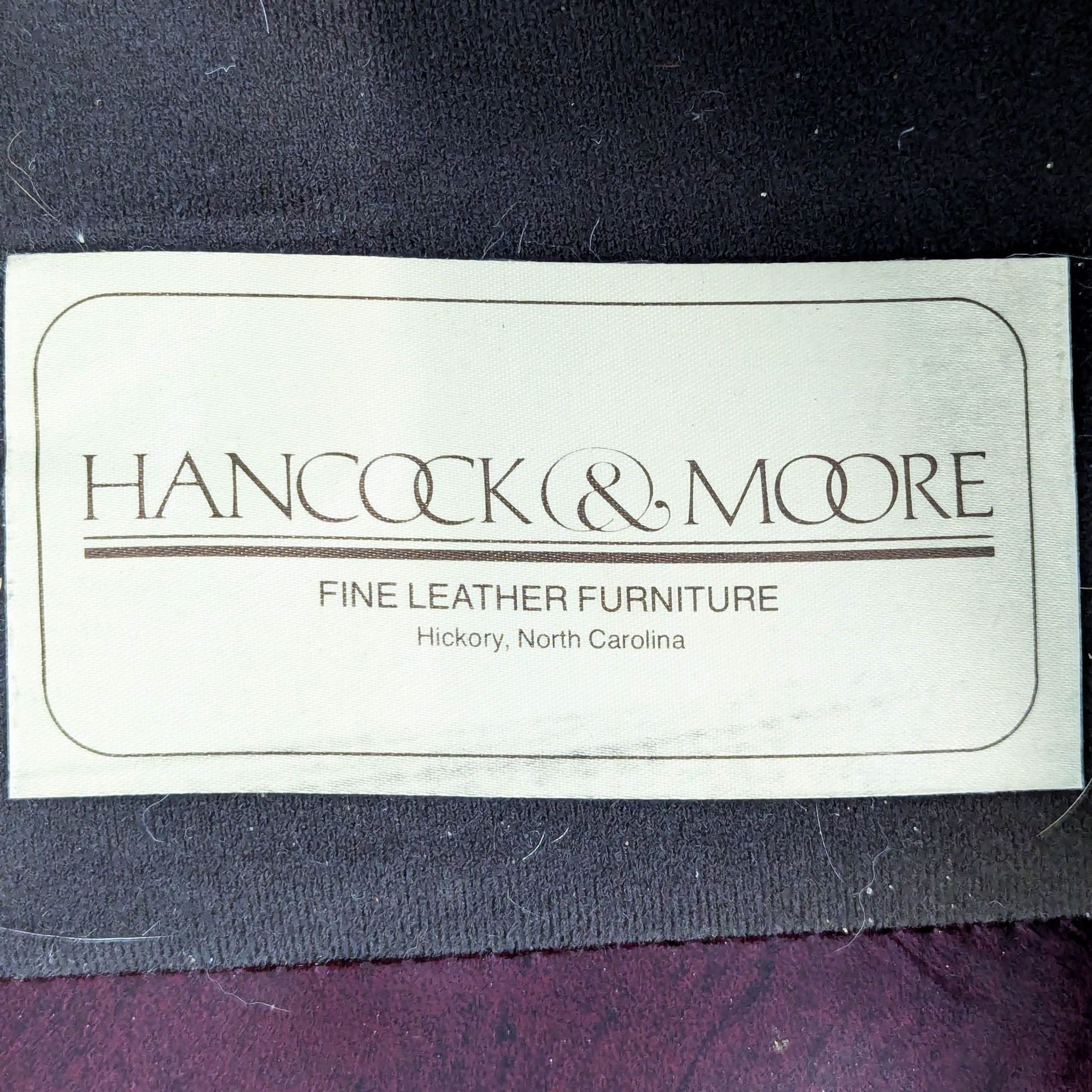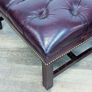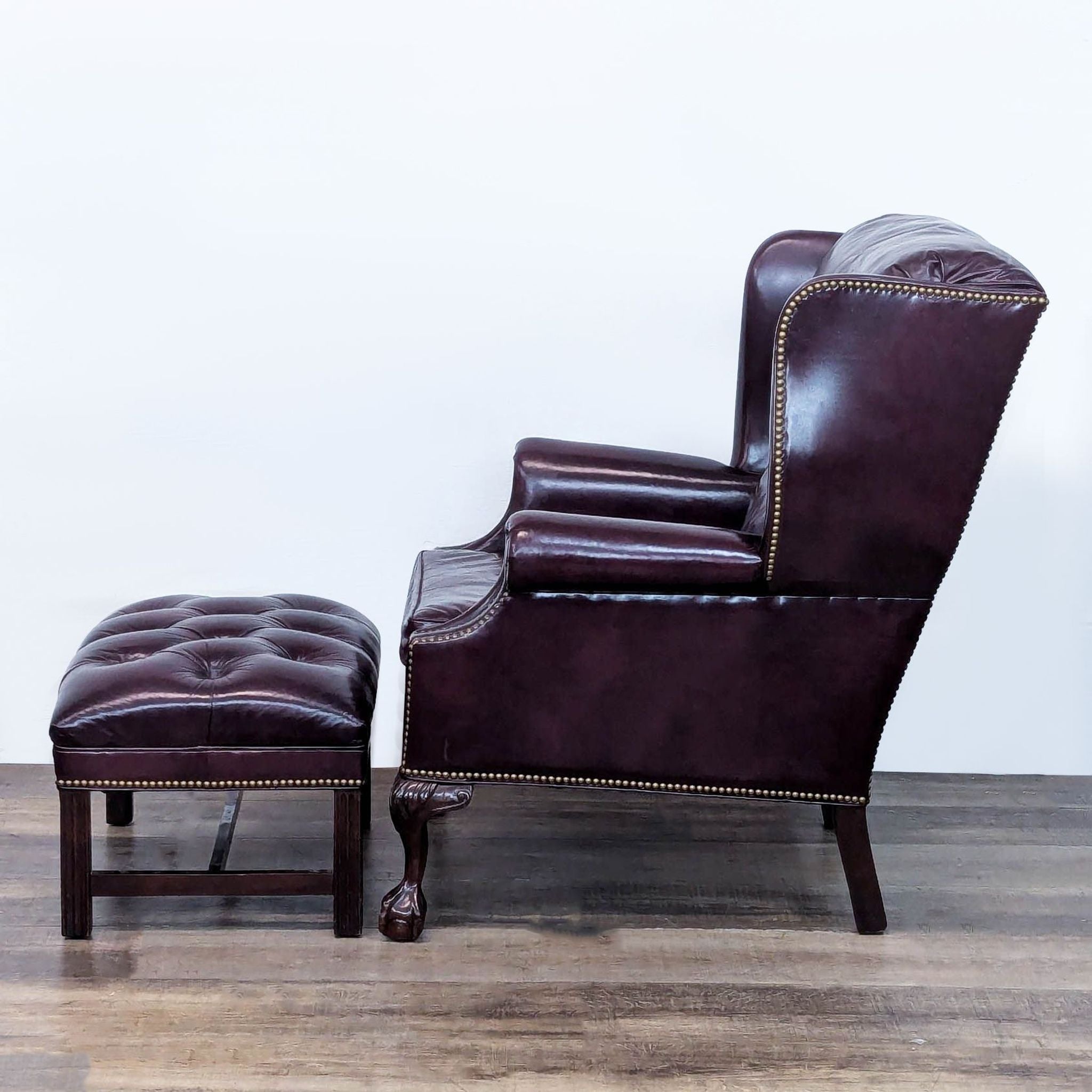 Features a hooded back with rolled arms and brass nailhead trim. The chair is supported by carved mahogany ball and claw feet with acanthus accents. Includes matching ottoman.