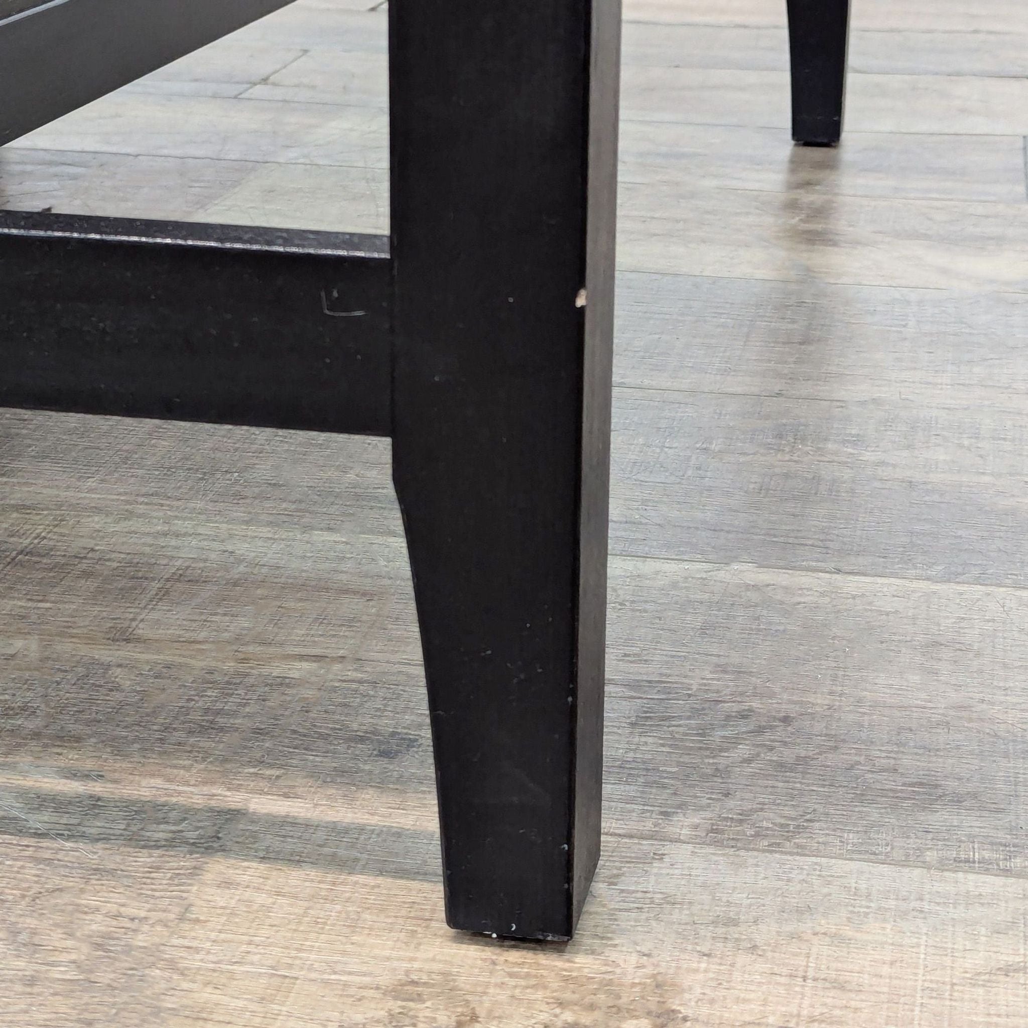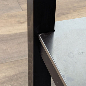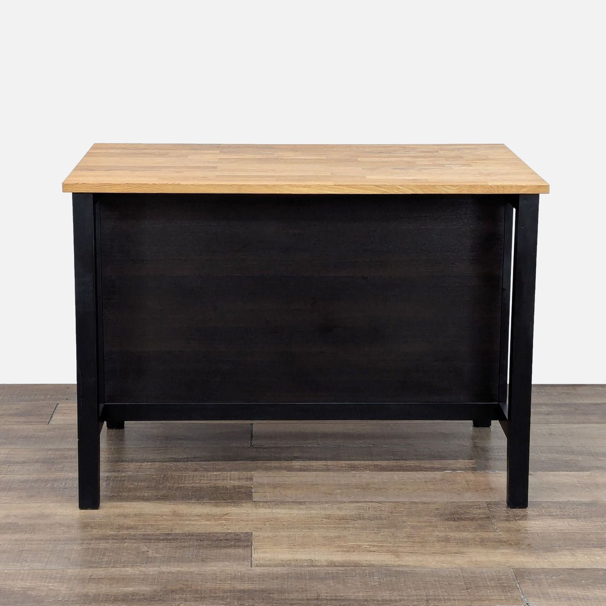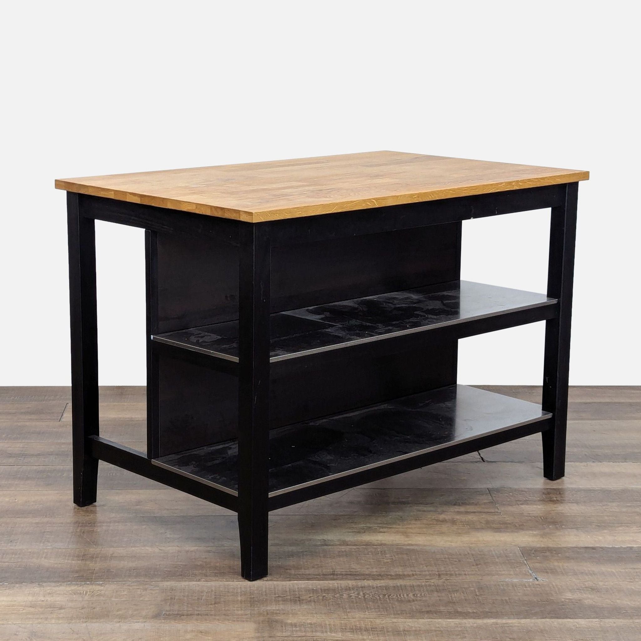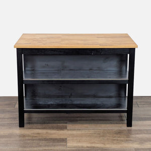 Butcher block top on steel frame with 2 shelves on one side. Seating section on the other side.