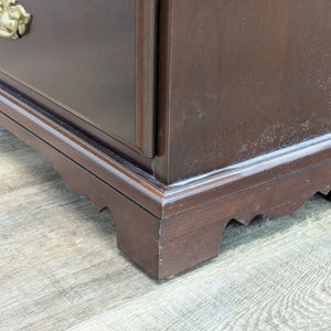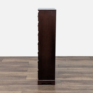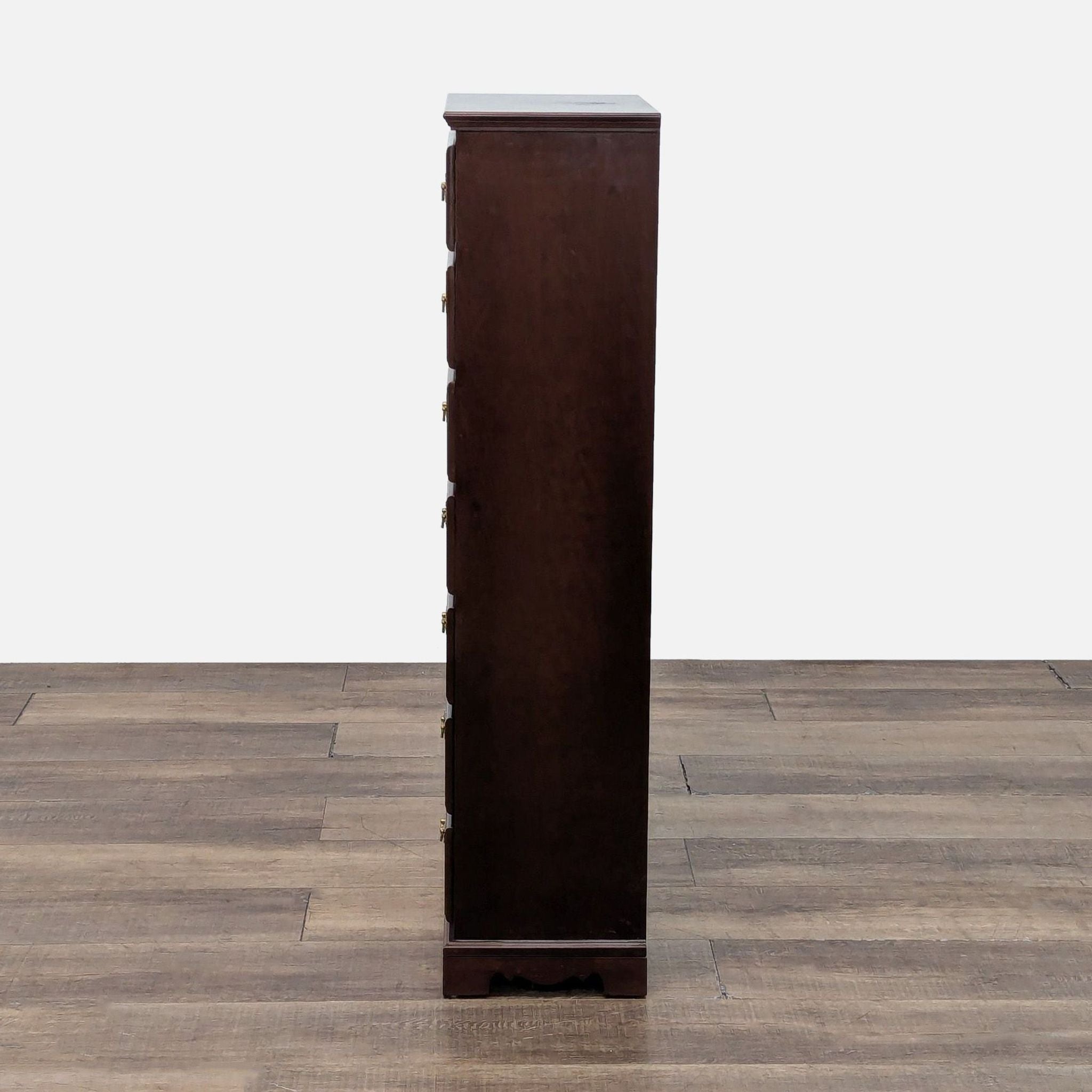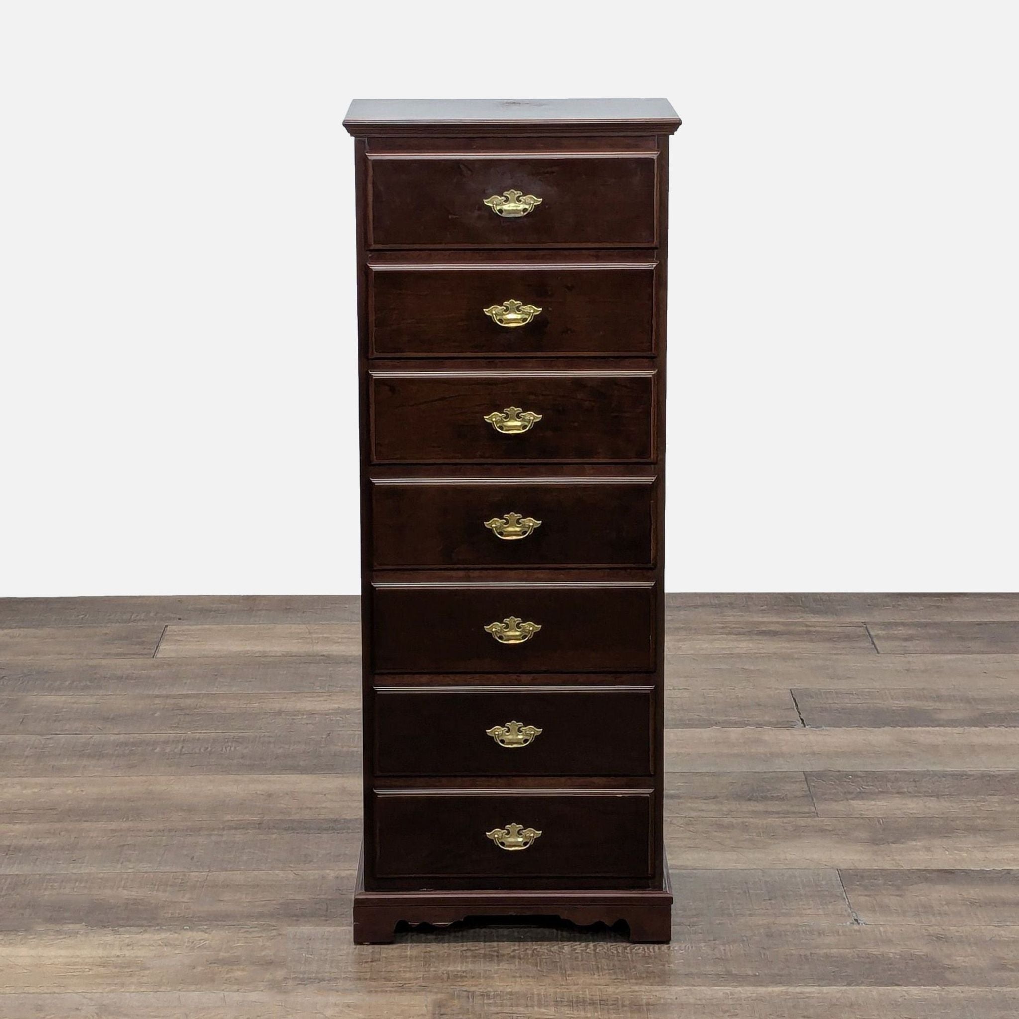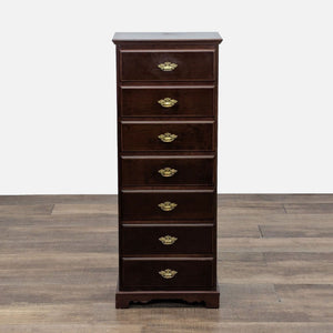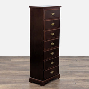 Features 7 drawers with brass pulls and a mahogany finish.