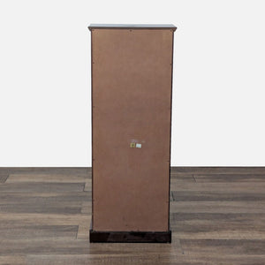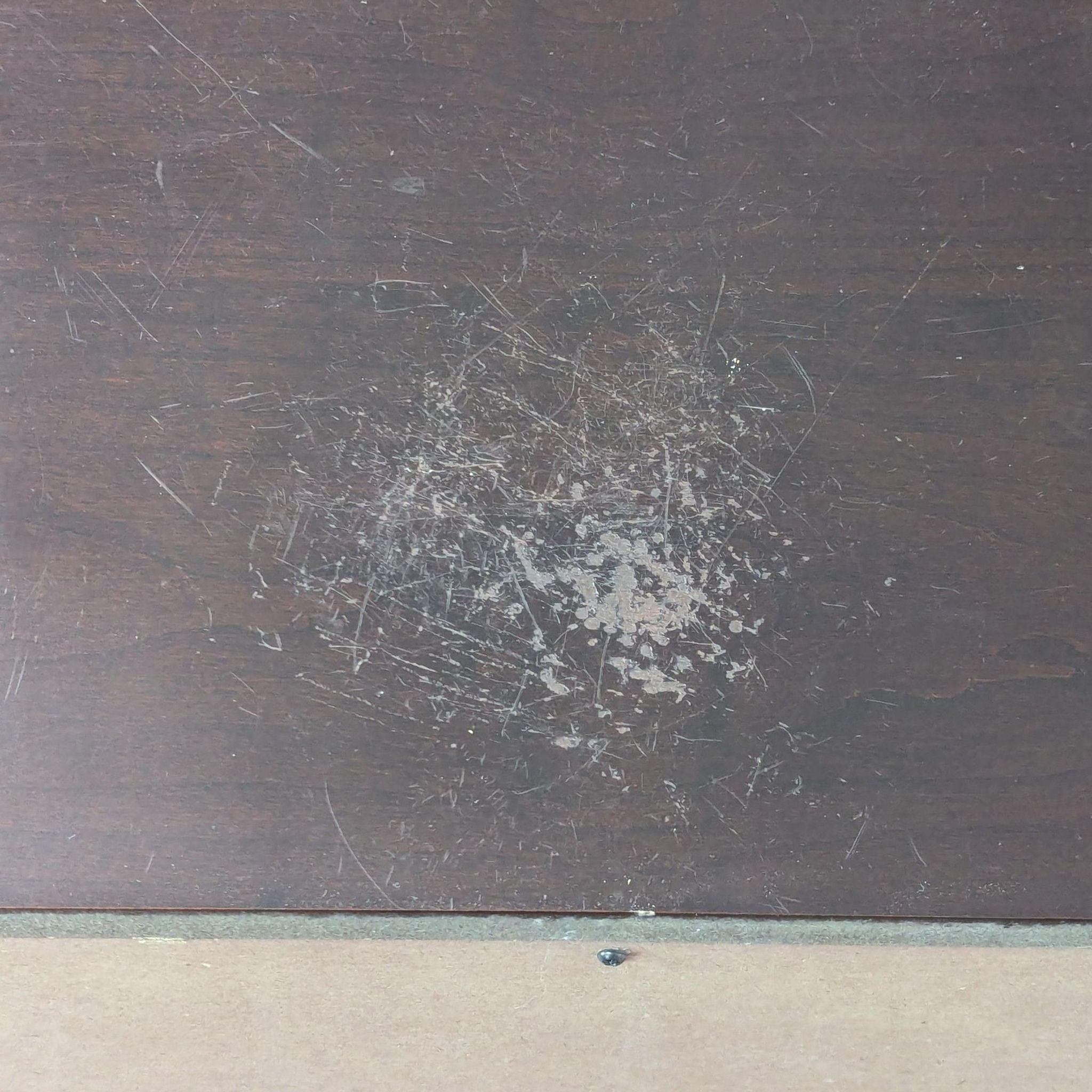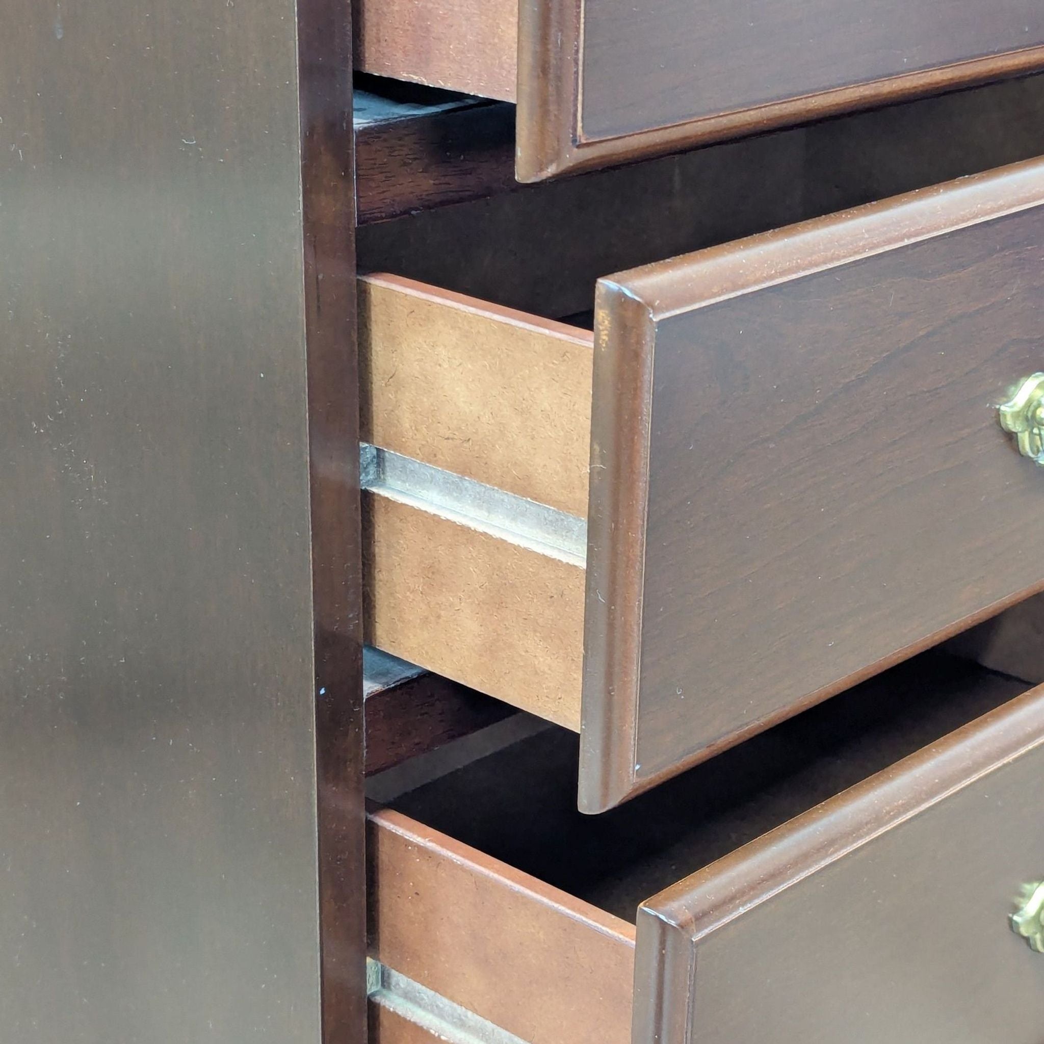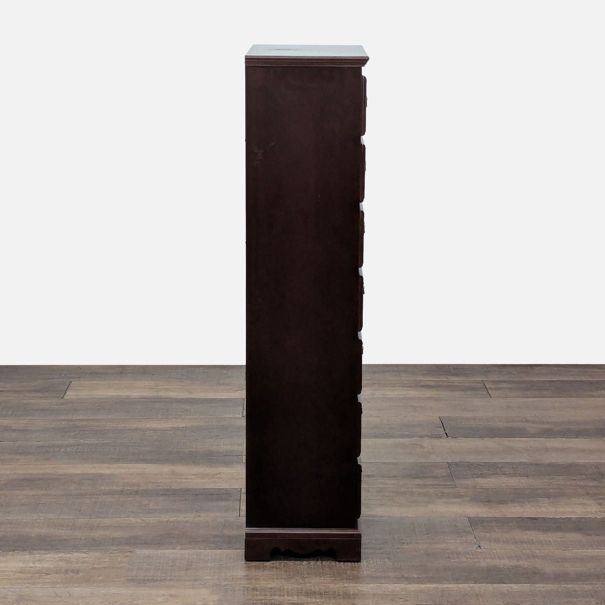 Features 7 drawers with brass pulls and a mahogany finish.