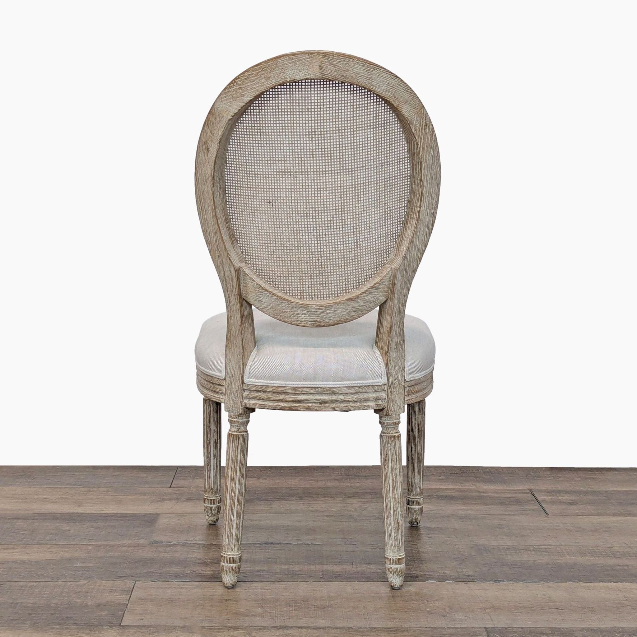 Reproduction of vintage French dining chair in the neoclassic style. Defined by linear form and tapering fluted columnar legs, the chair frame is hand-carved solid oak with a soft, weathered finish.