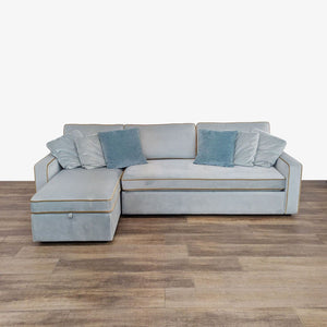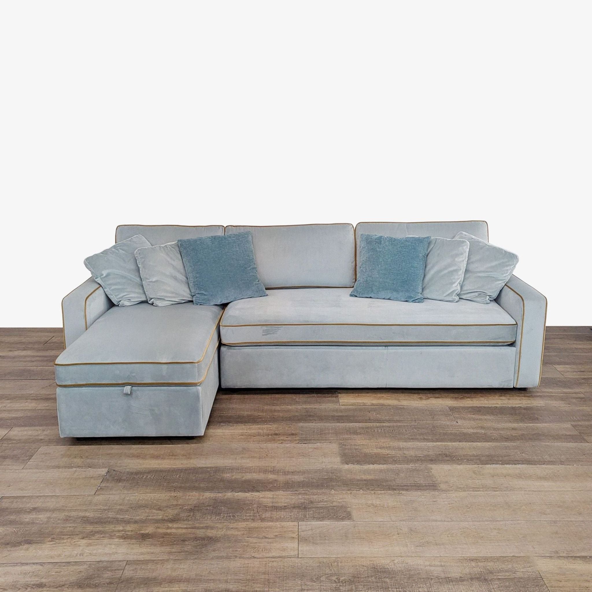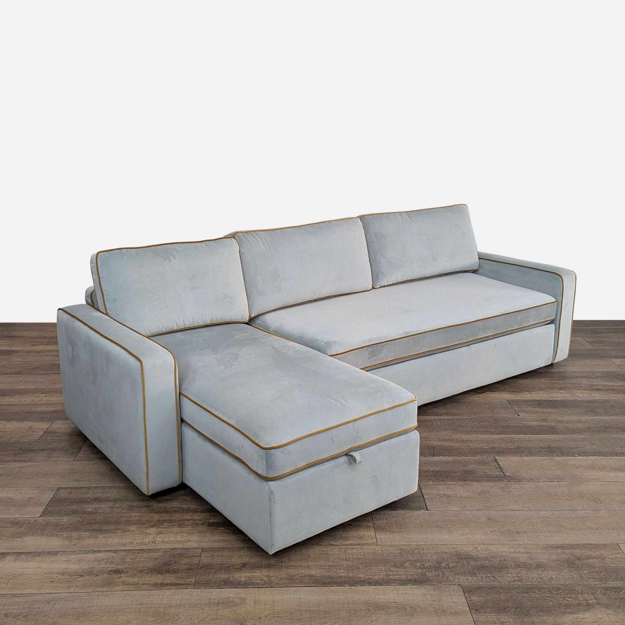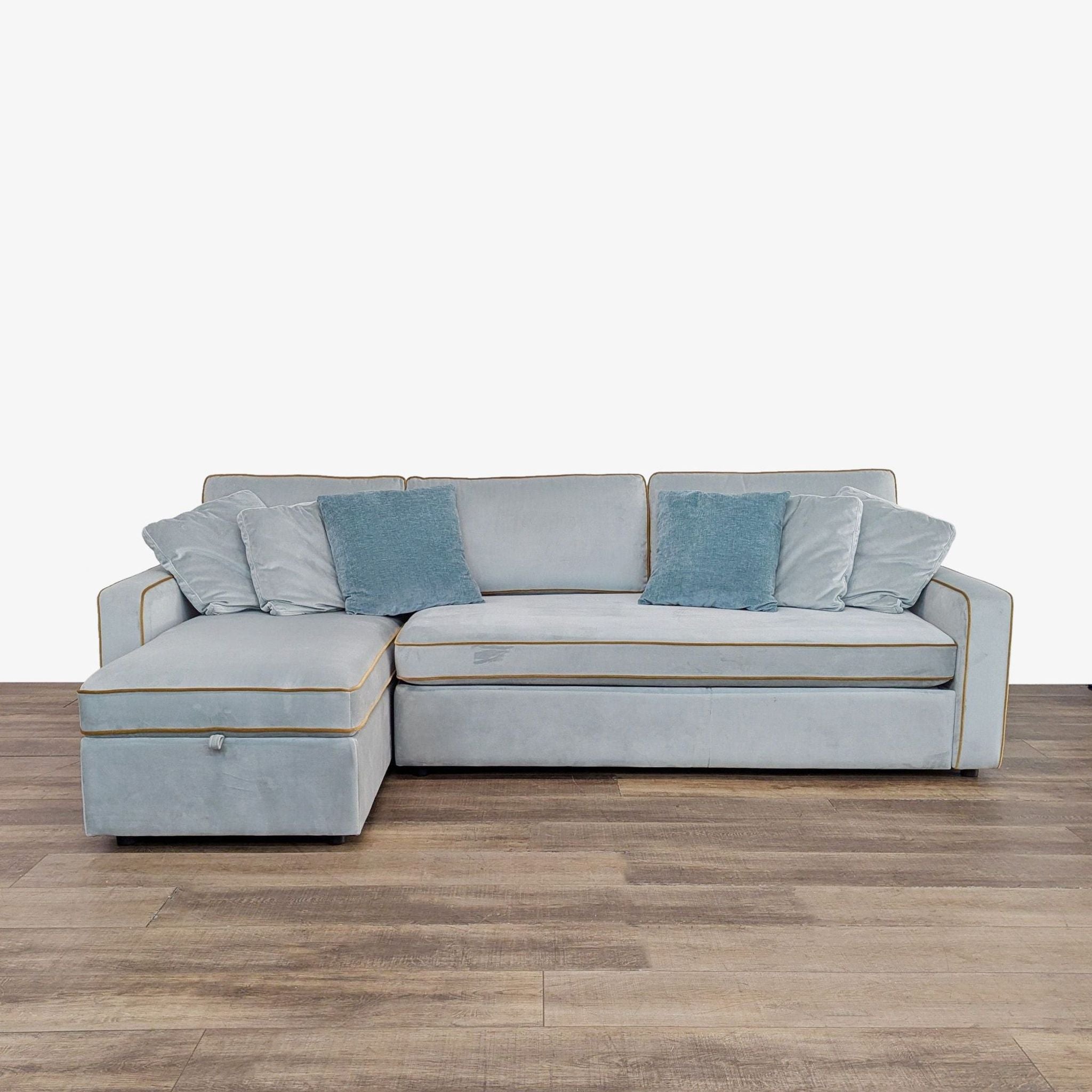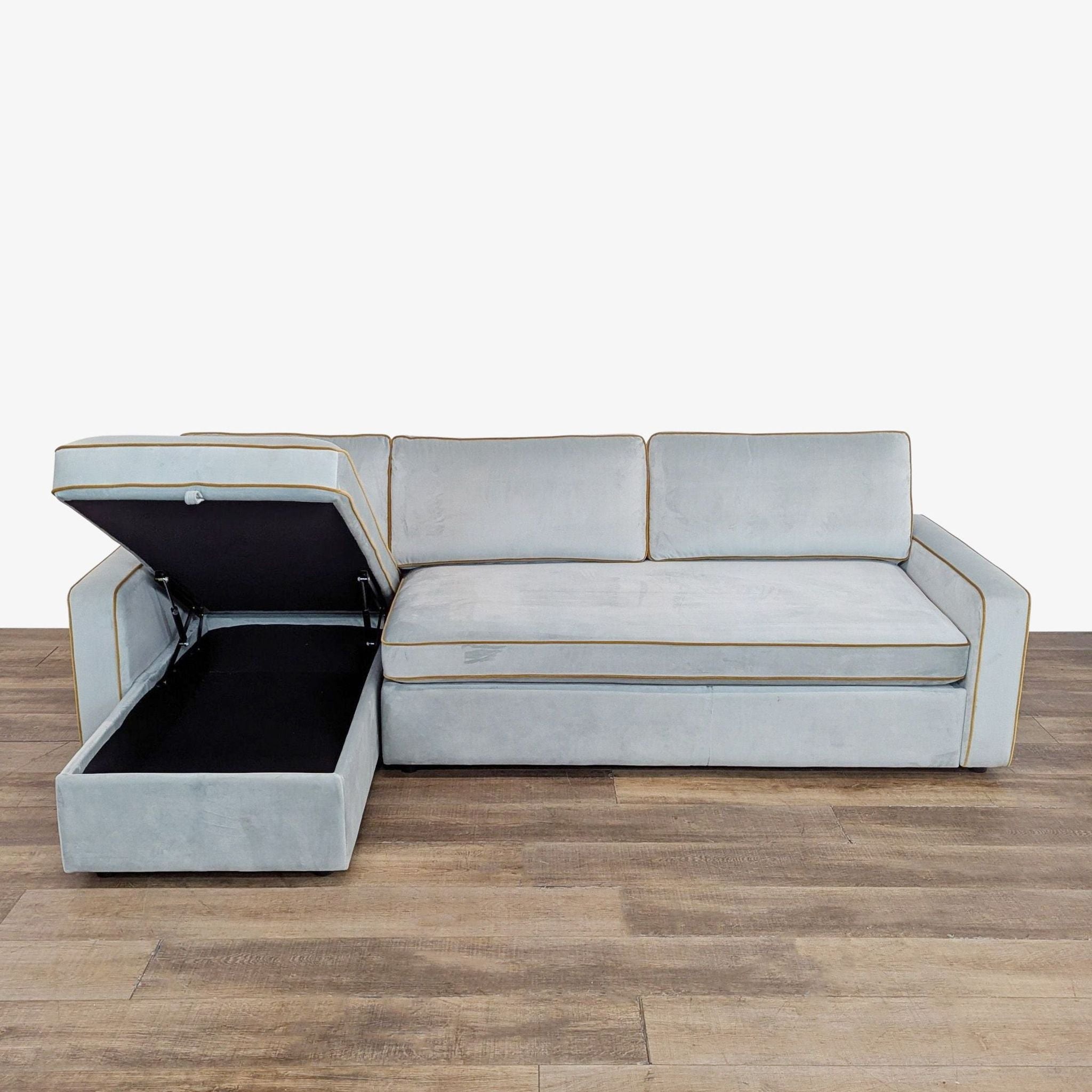 Features pull out sleeper with chaise that opens up to reveal storage space.