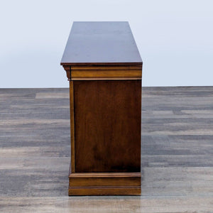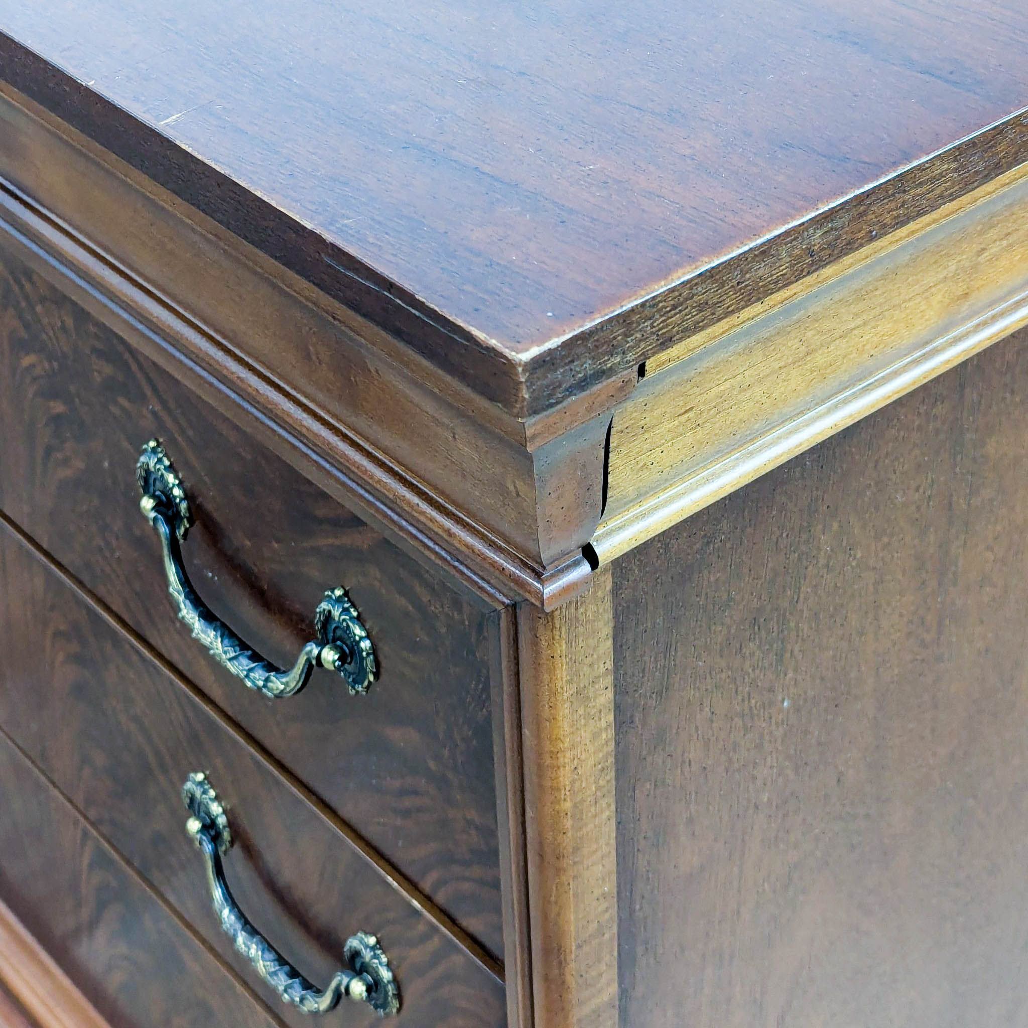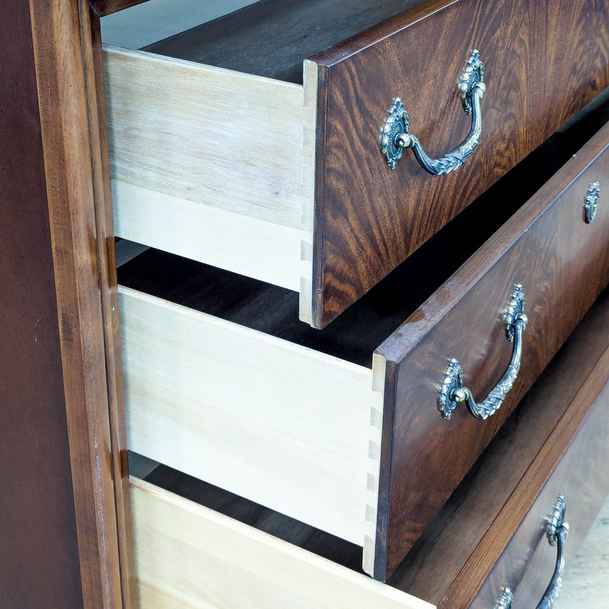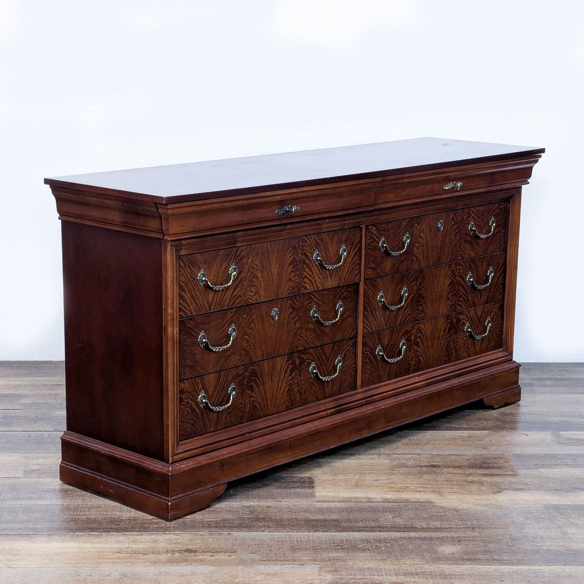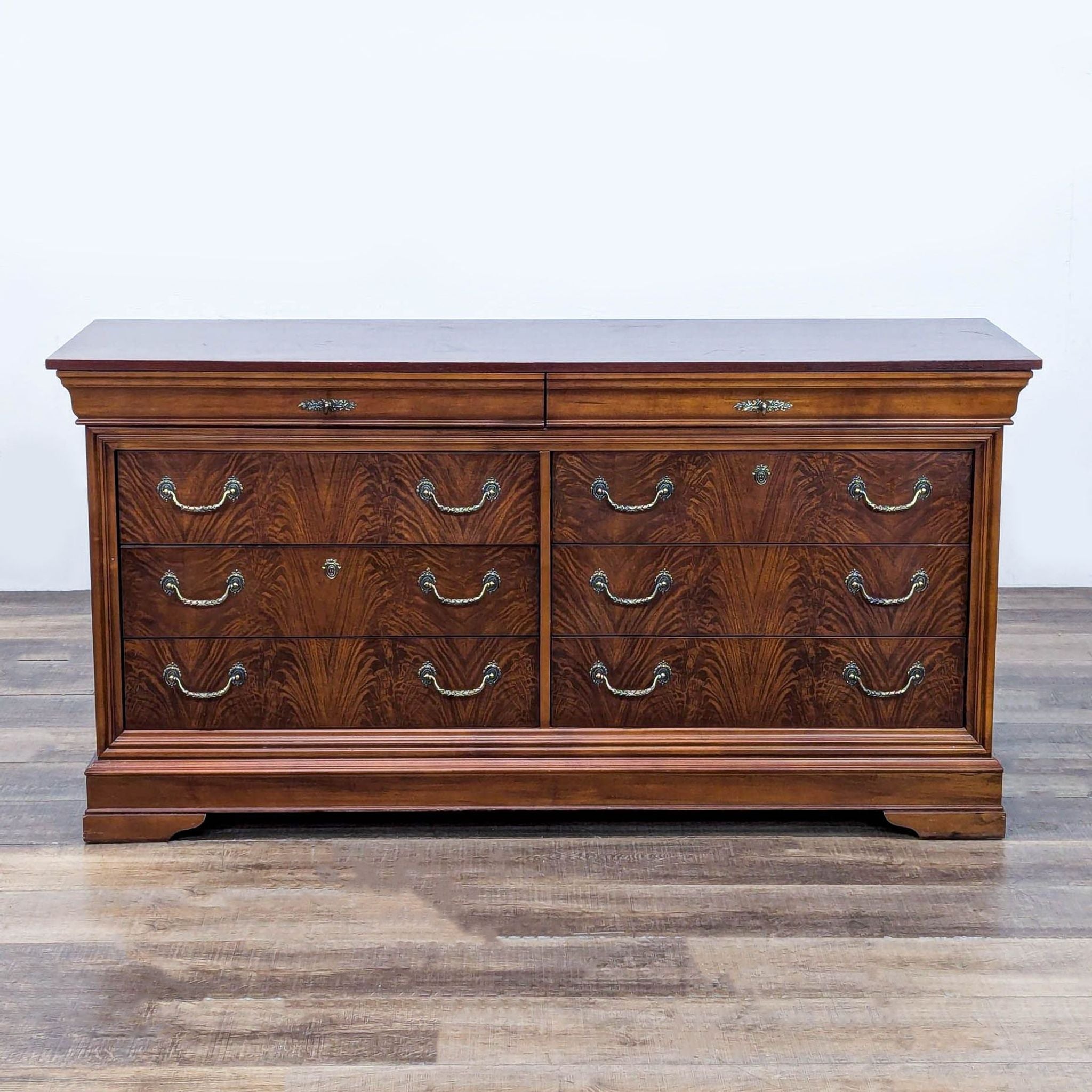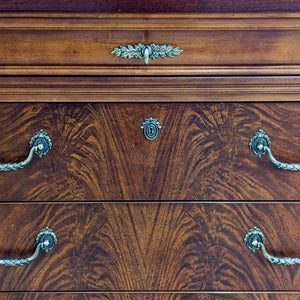 Designed in the spirit of 19th-century French originals, this dresser features mahogany and flame mahogany veneer with brass hardware.
