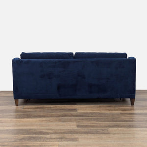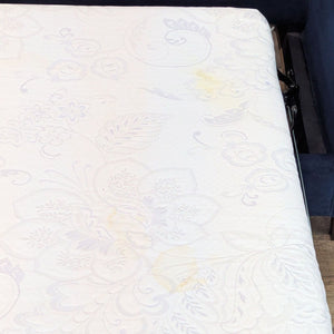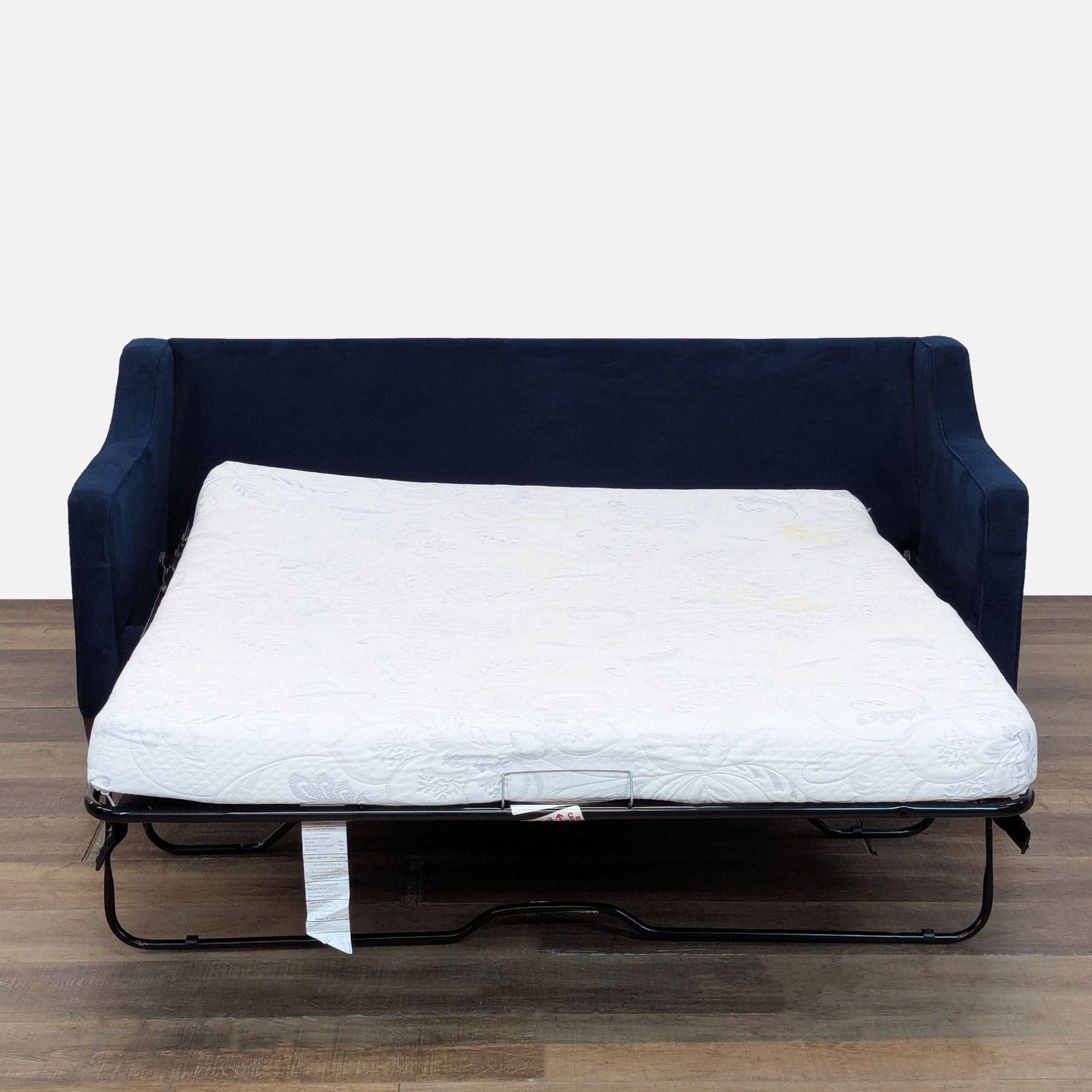 Velvet upholstered sofa with wood legs and pull out contouring, memory foam-infused mattress.