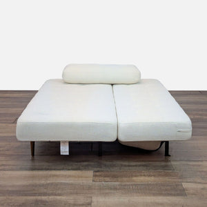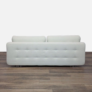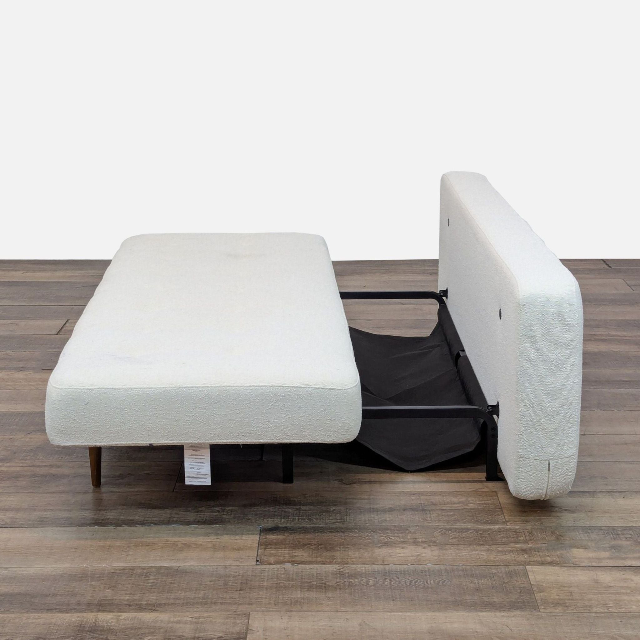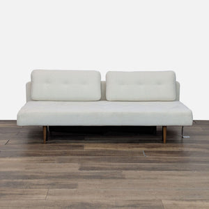 Stylish modern sleeper sofa with button tufting and storage sling under the seat that is conveniently sized to hold pillows, sheets and blankets.