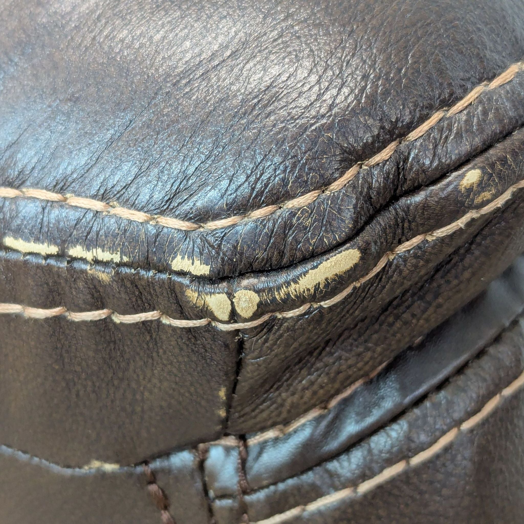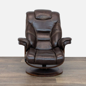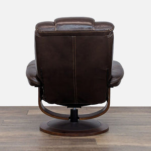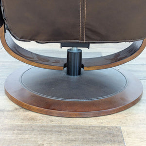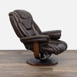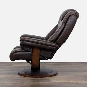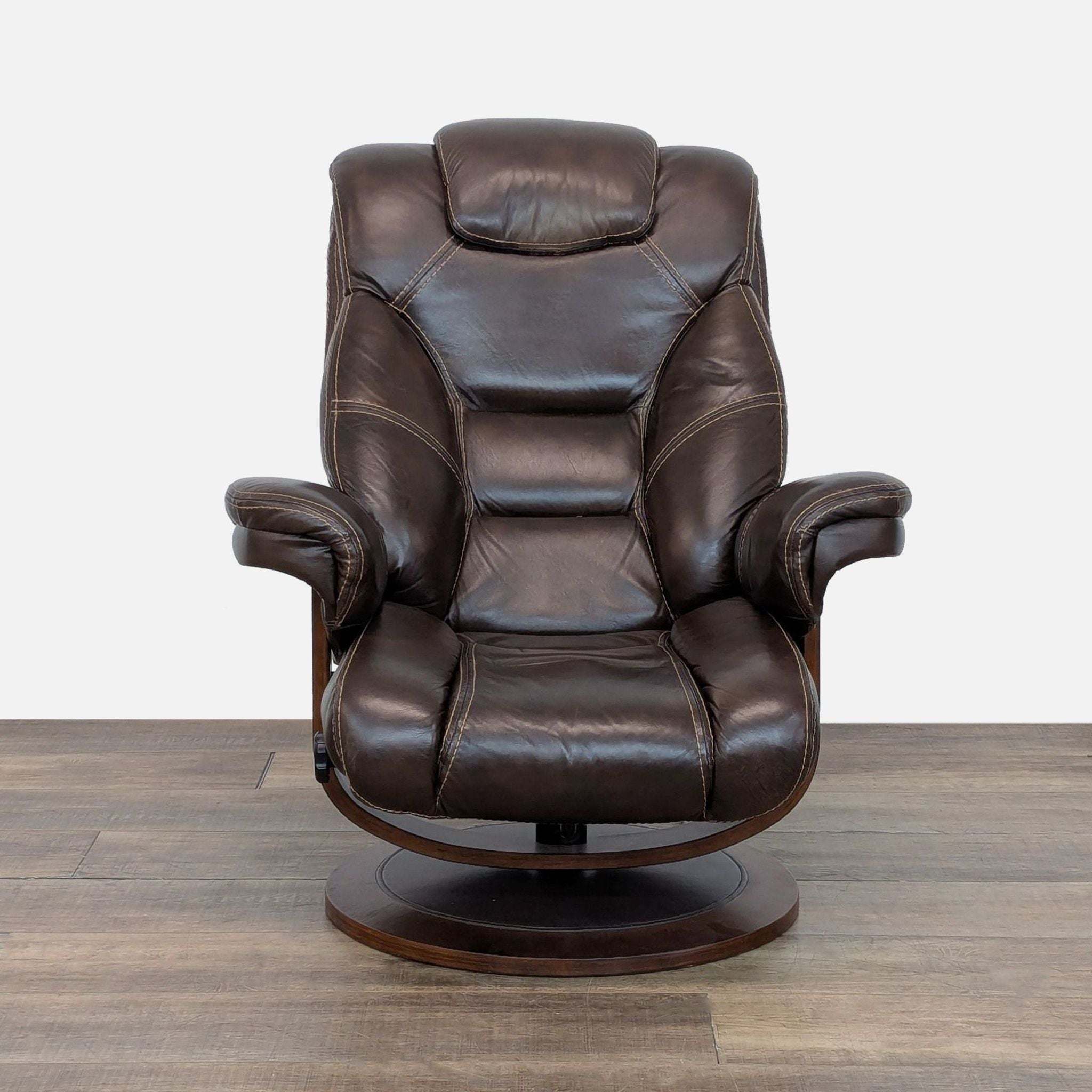 Plush cushioned leather lounge chair on a walnut wood base with non adjustable recliner.