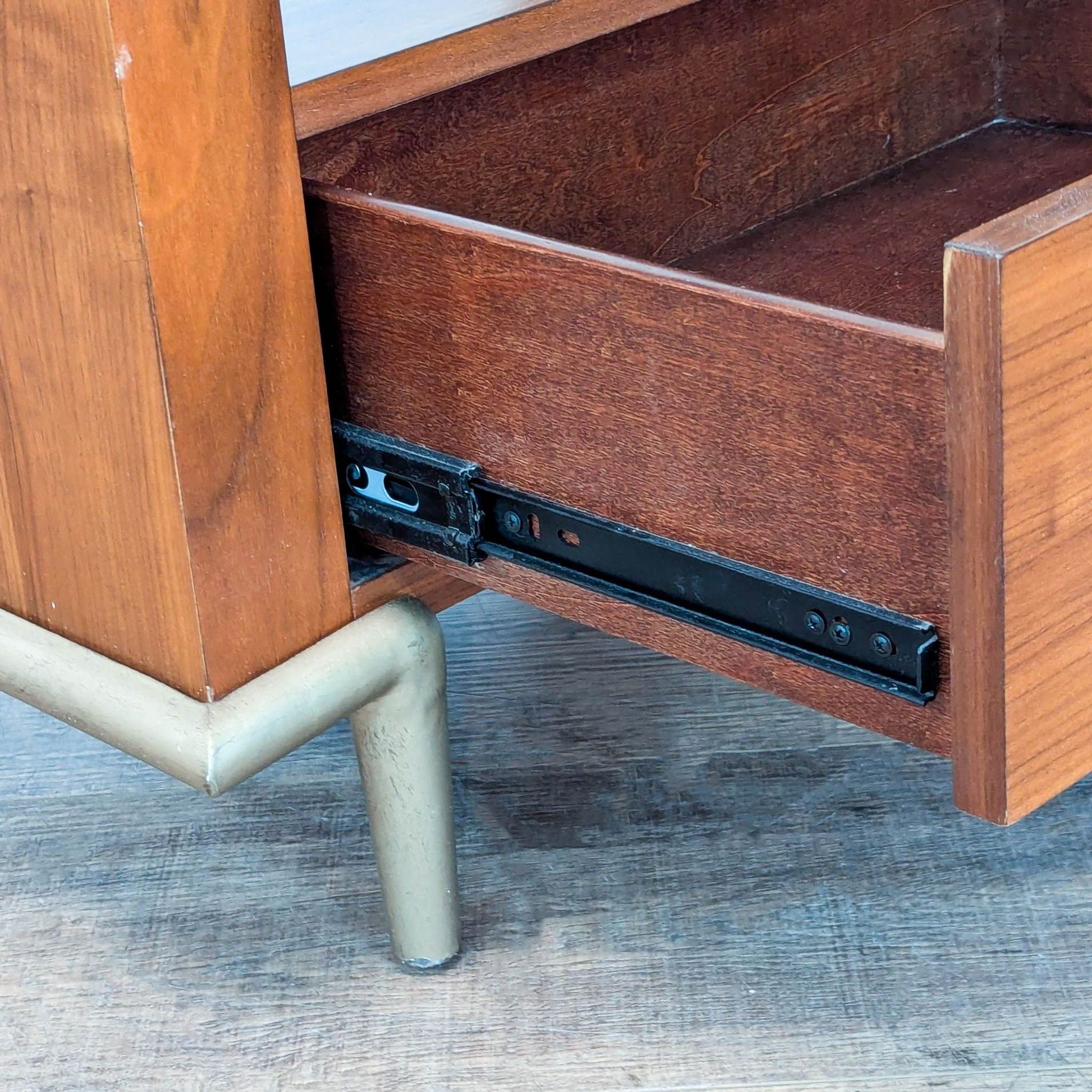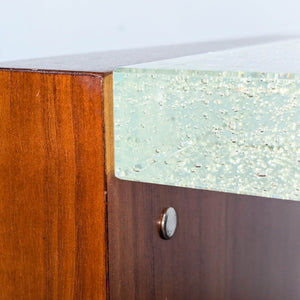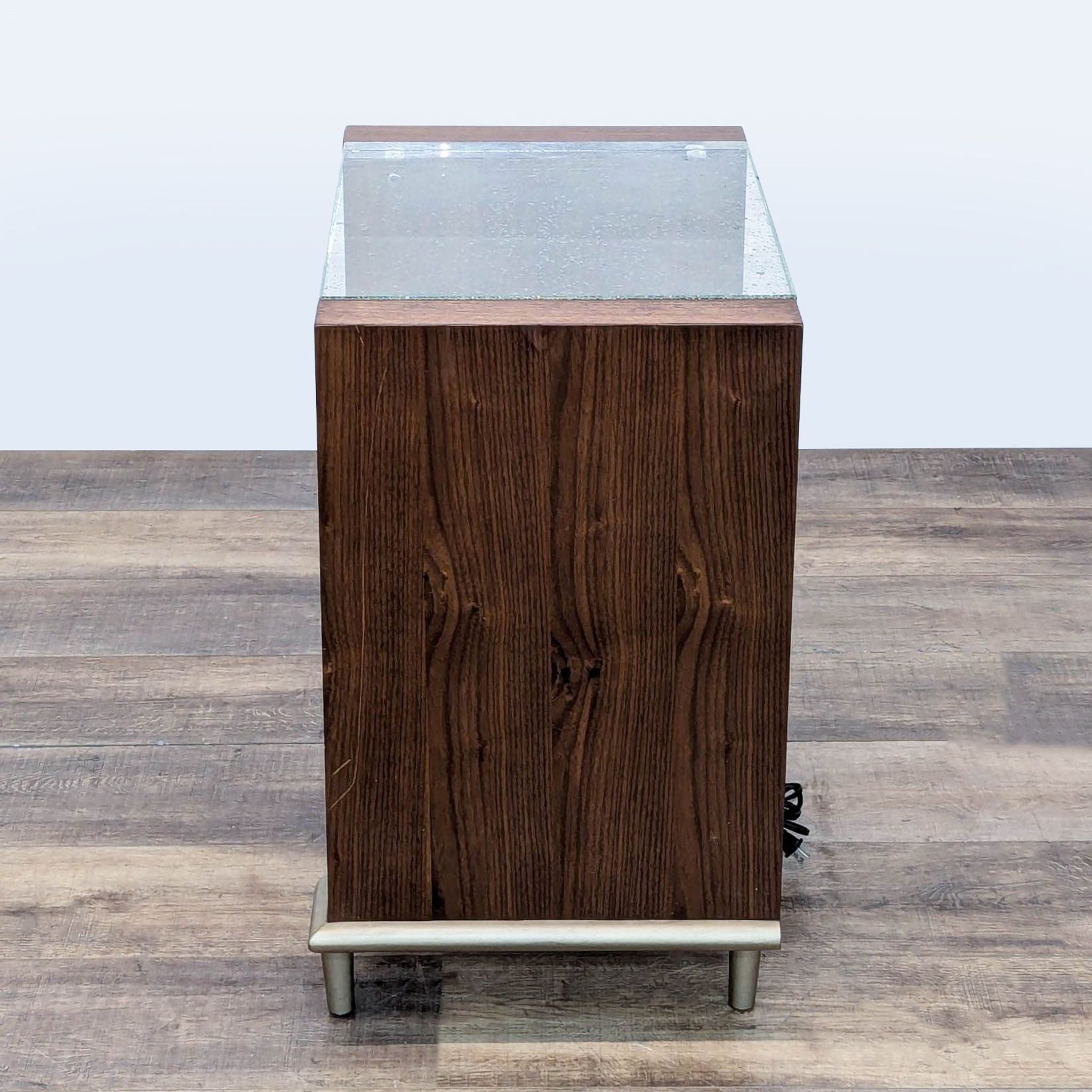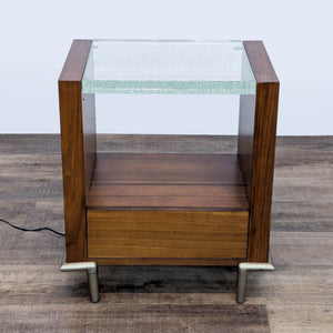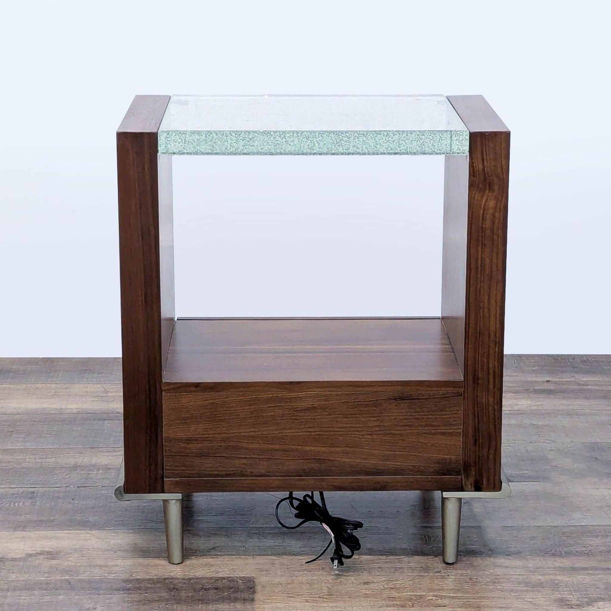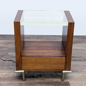 Crafted from rich, dark-toned wood, it features a single spacious drawer with a distinct round metal pull, offering convenient storage. The top surface is a clear acrylic panel. The panel lights up when turned on, illuminating captured bubbles, showcasing a shower of "star-like" features.