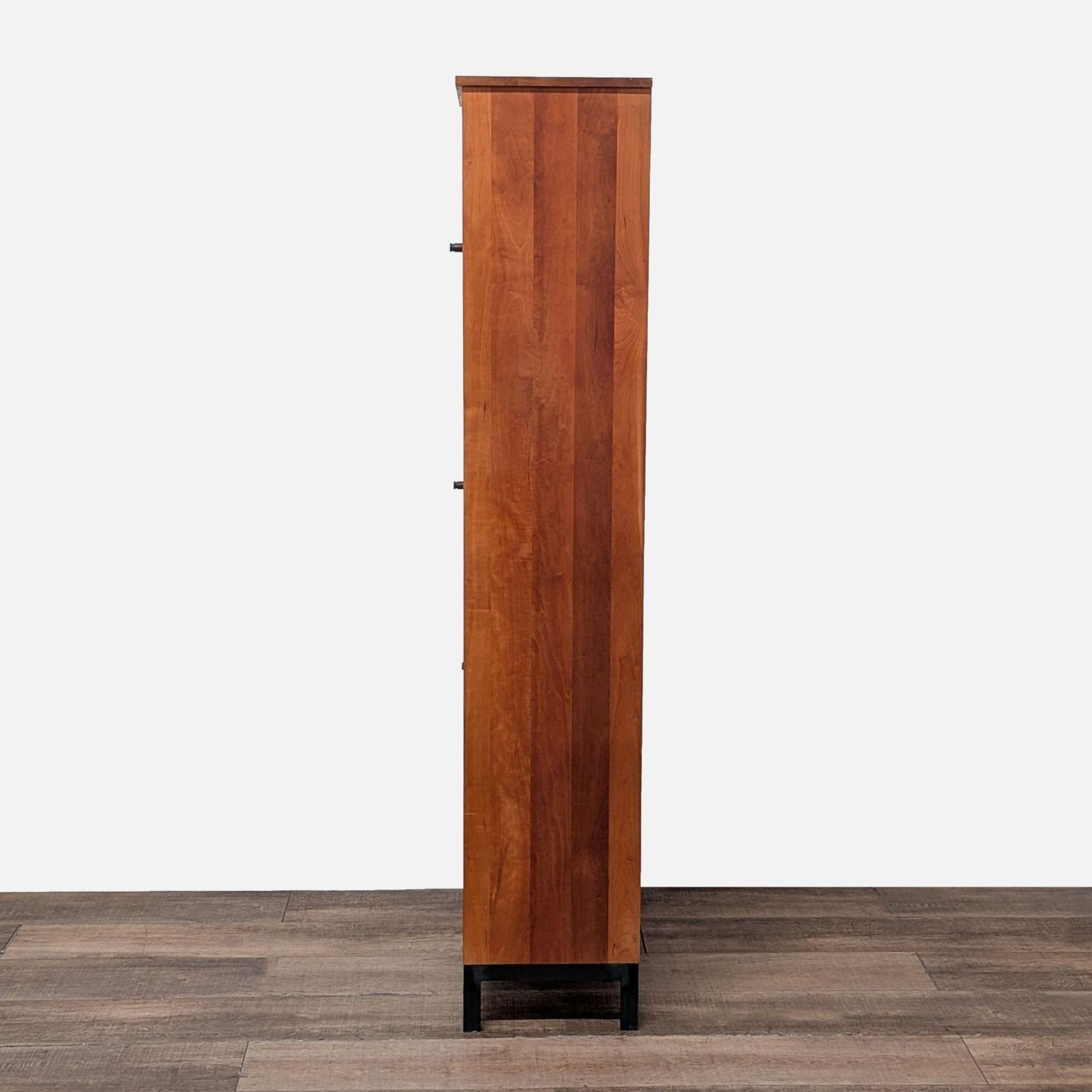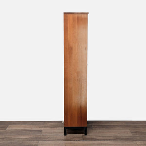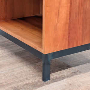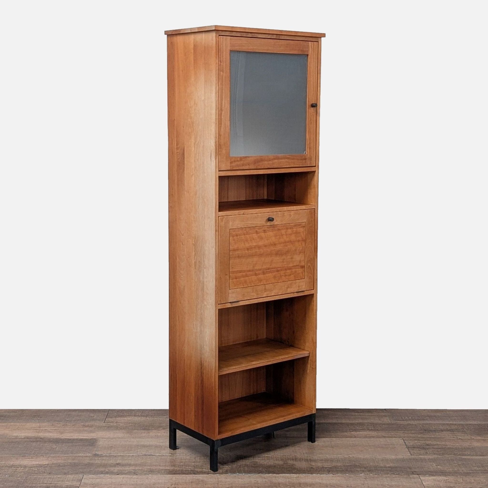This piece features a cabinet with a frosted glass door, open shelves and a drop down desk.