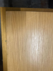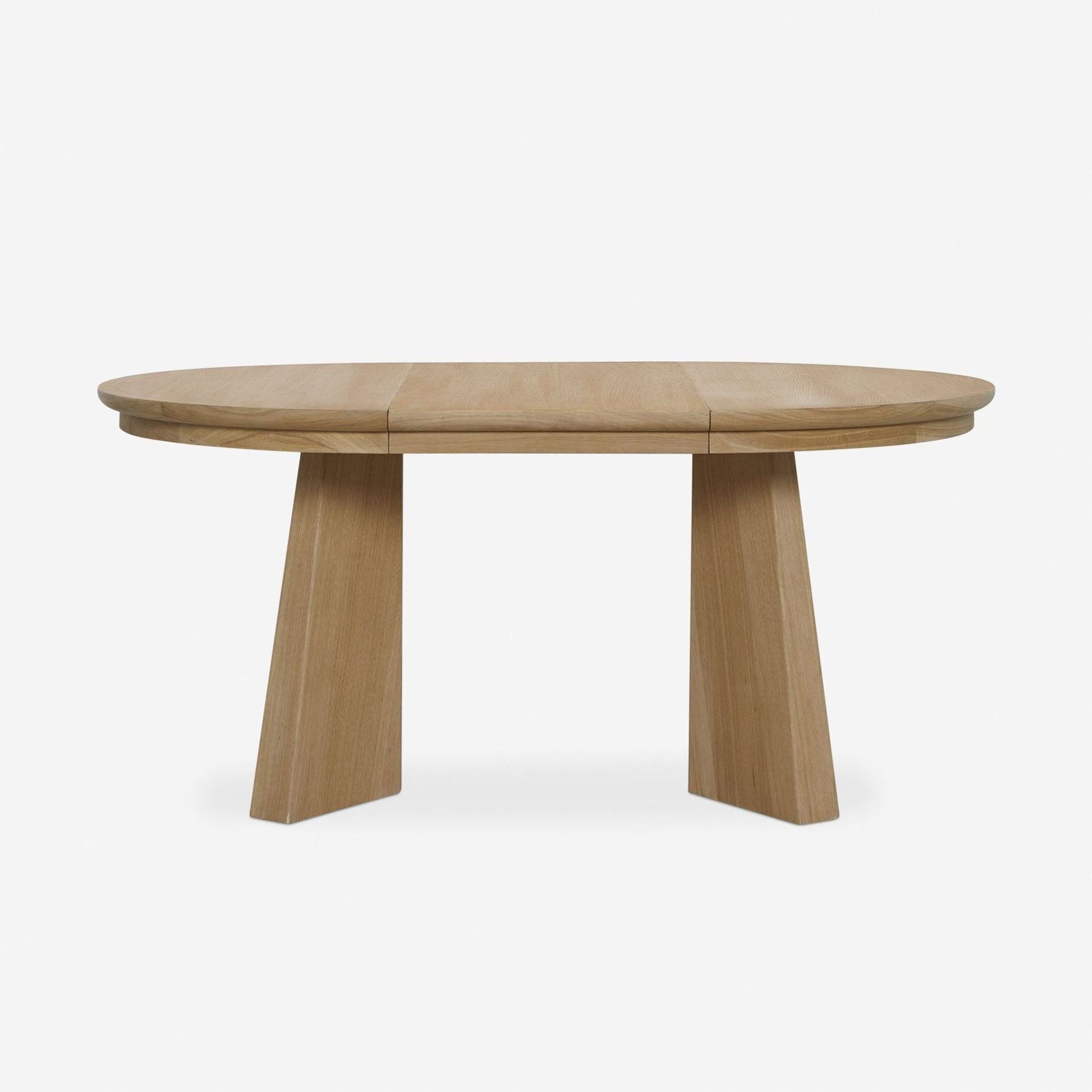 Made of oak, the design transitions from a cross-pedestal base to two angular legs. The table comes with a leaf insert.