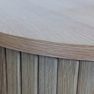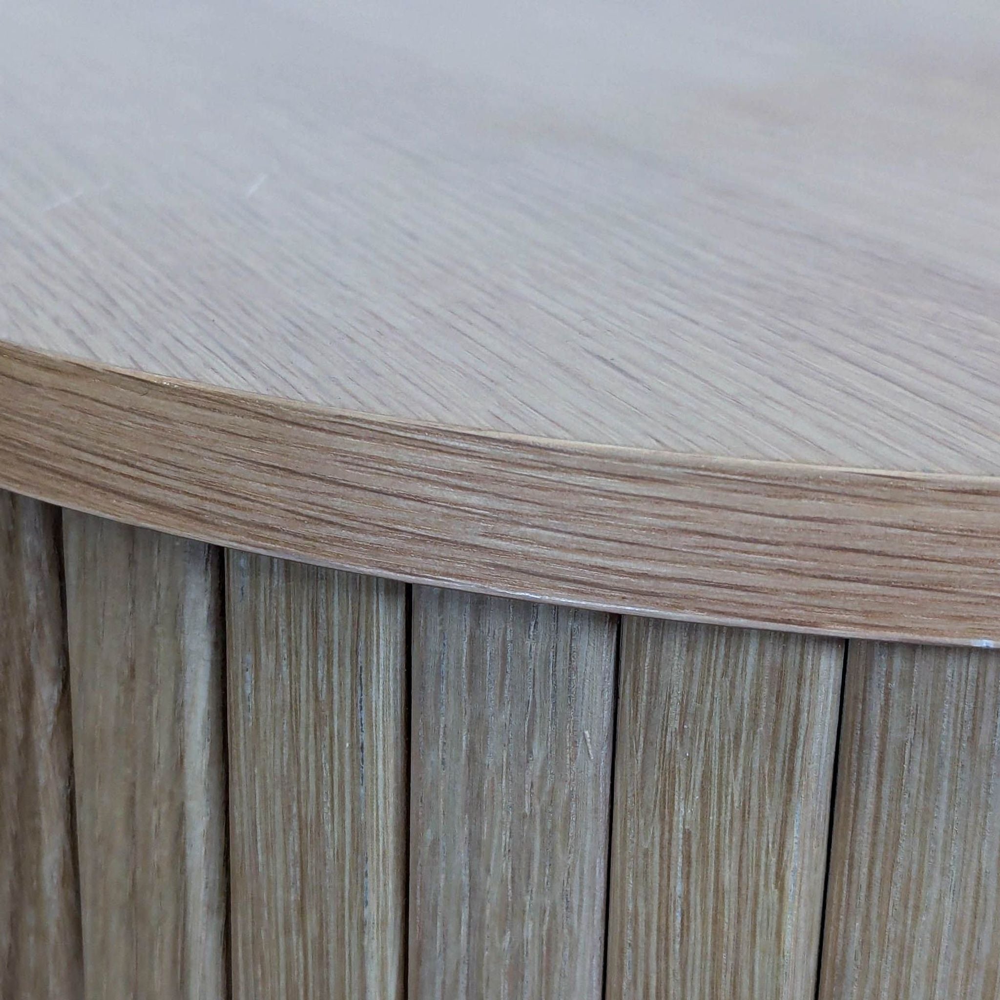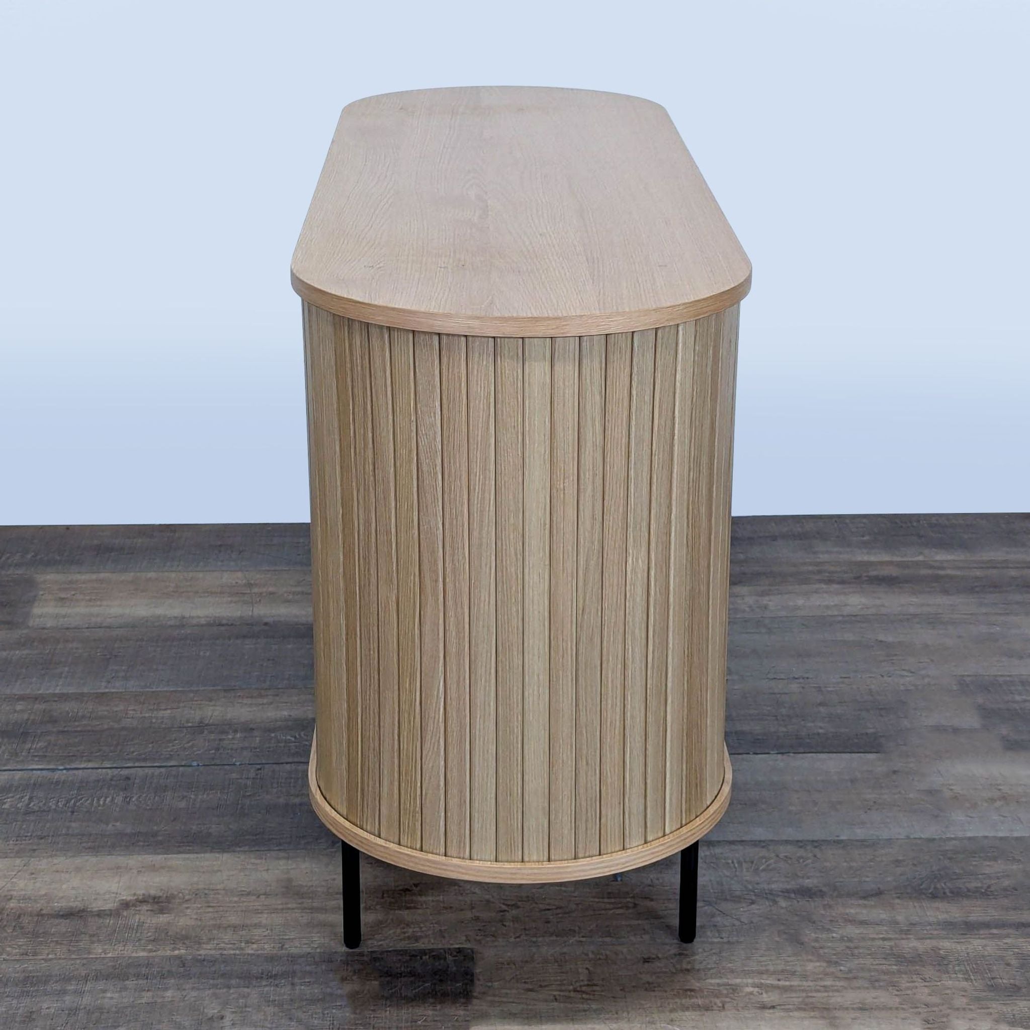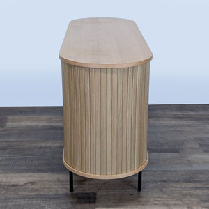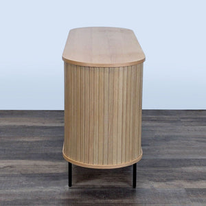 This TV stand has a mid-century silhouette with plenty of storage. It's built with sturdy kiln-dried wood + finished with solid oak veneers. Sliding tambour doors open to reveal interior compartments.