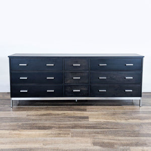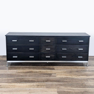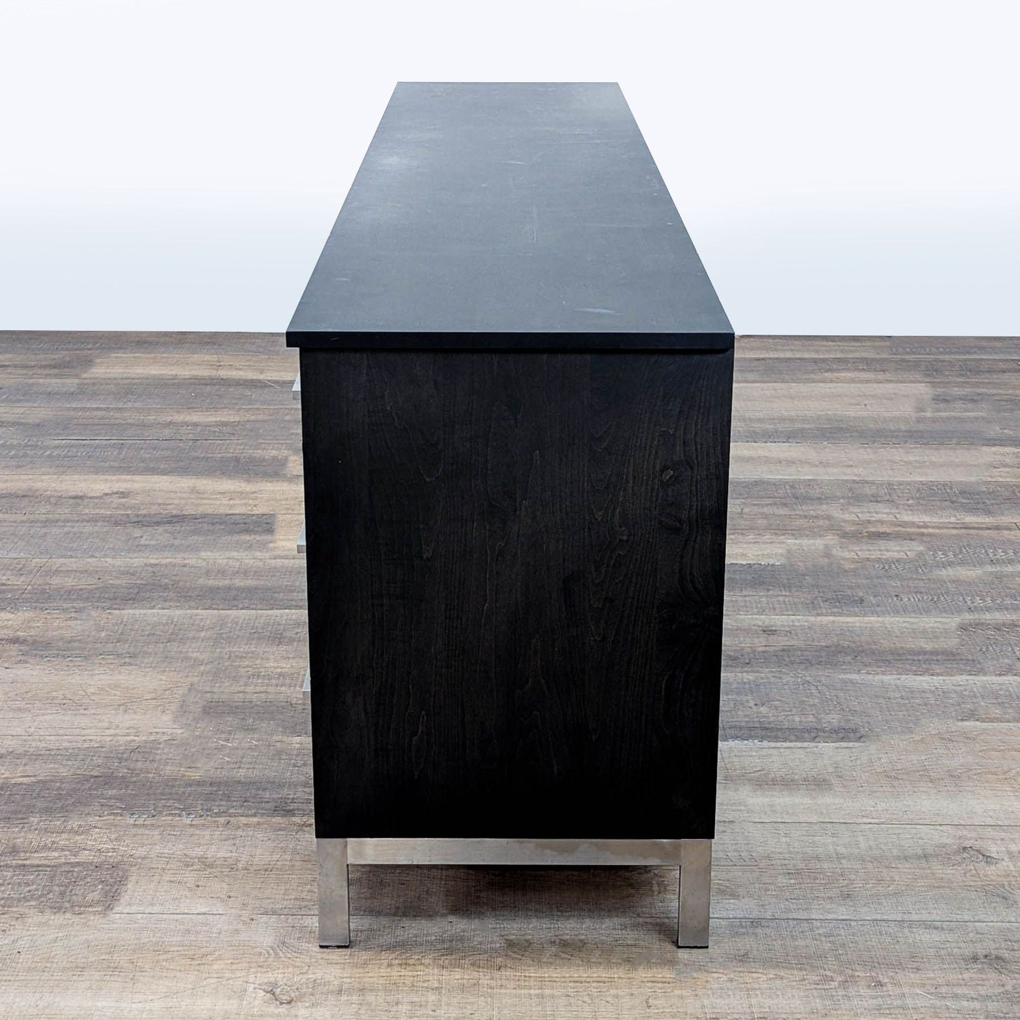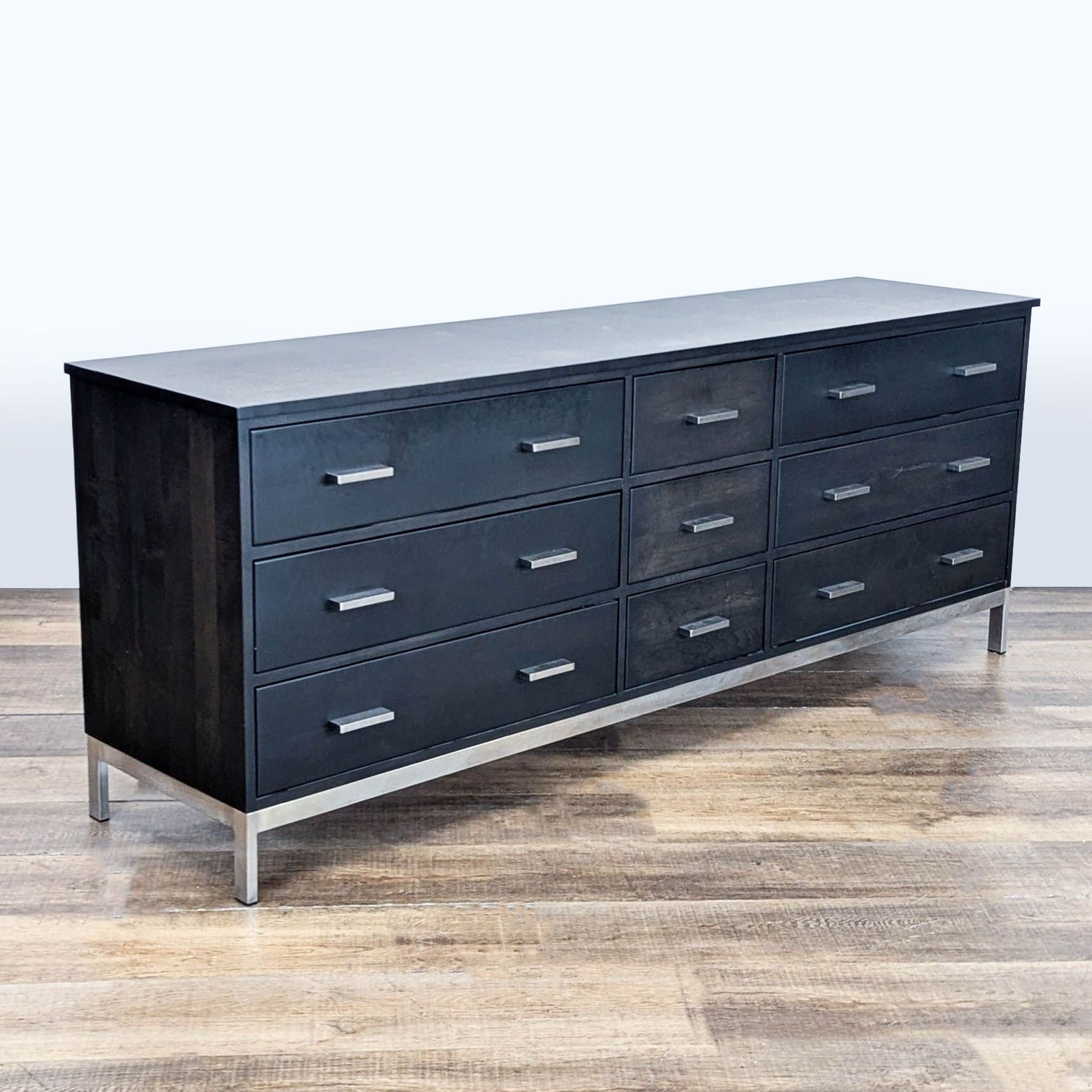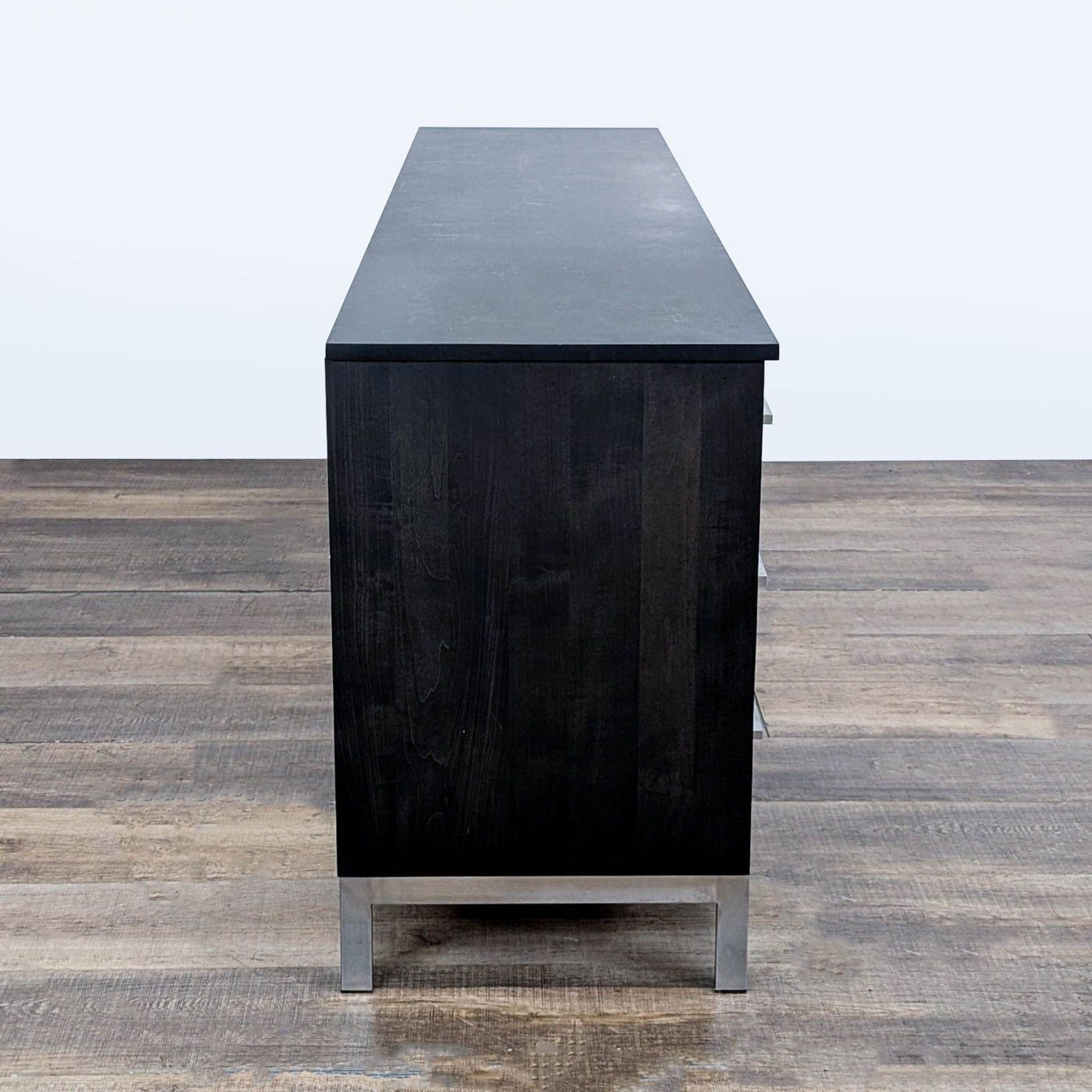 Constructed of soft maple finished in a charcoal stain with metal base and metal slab drawer pulls.