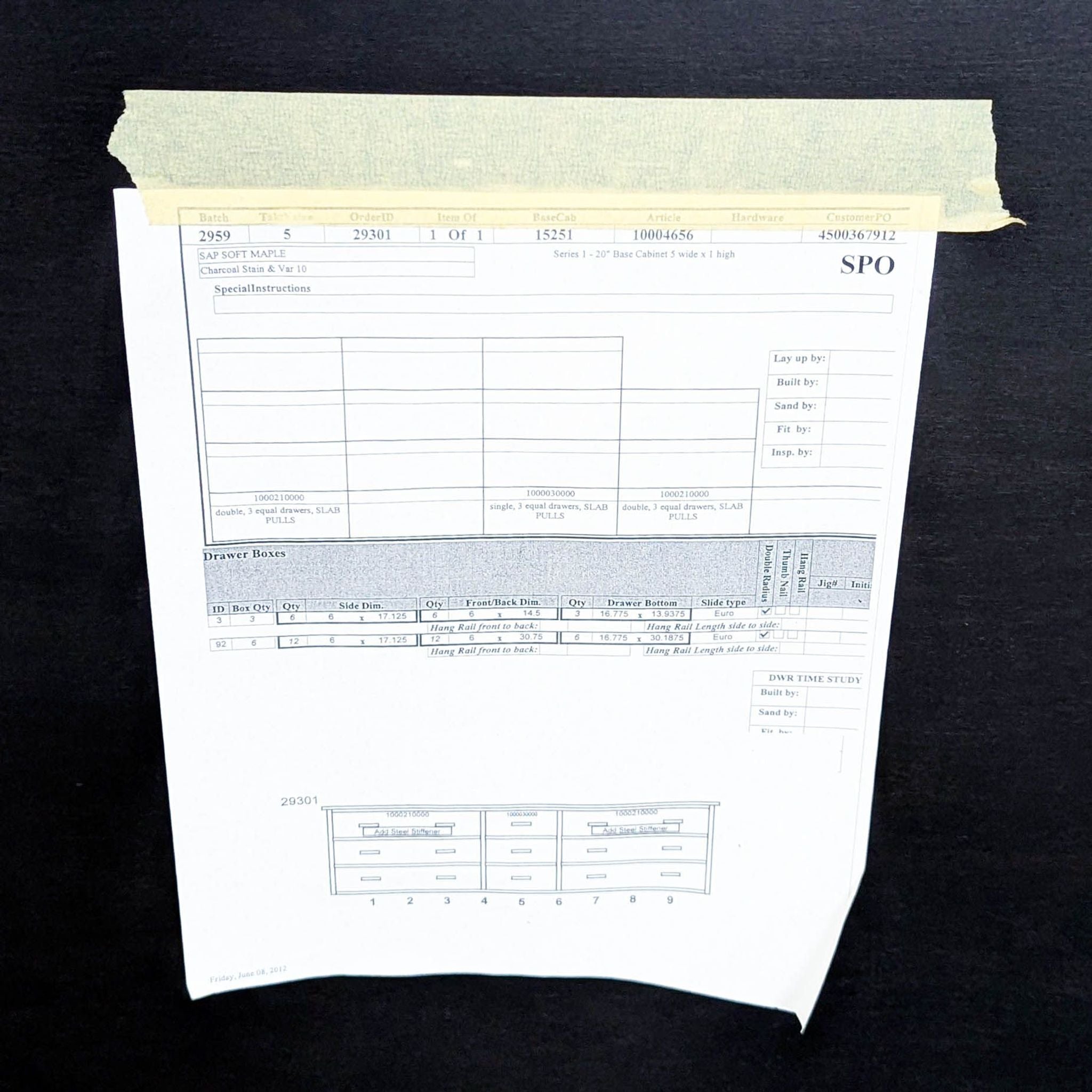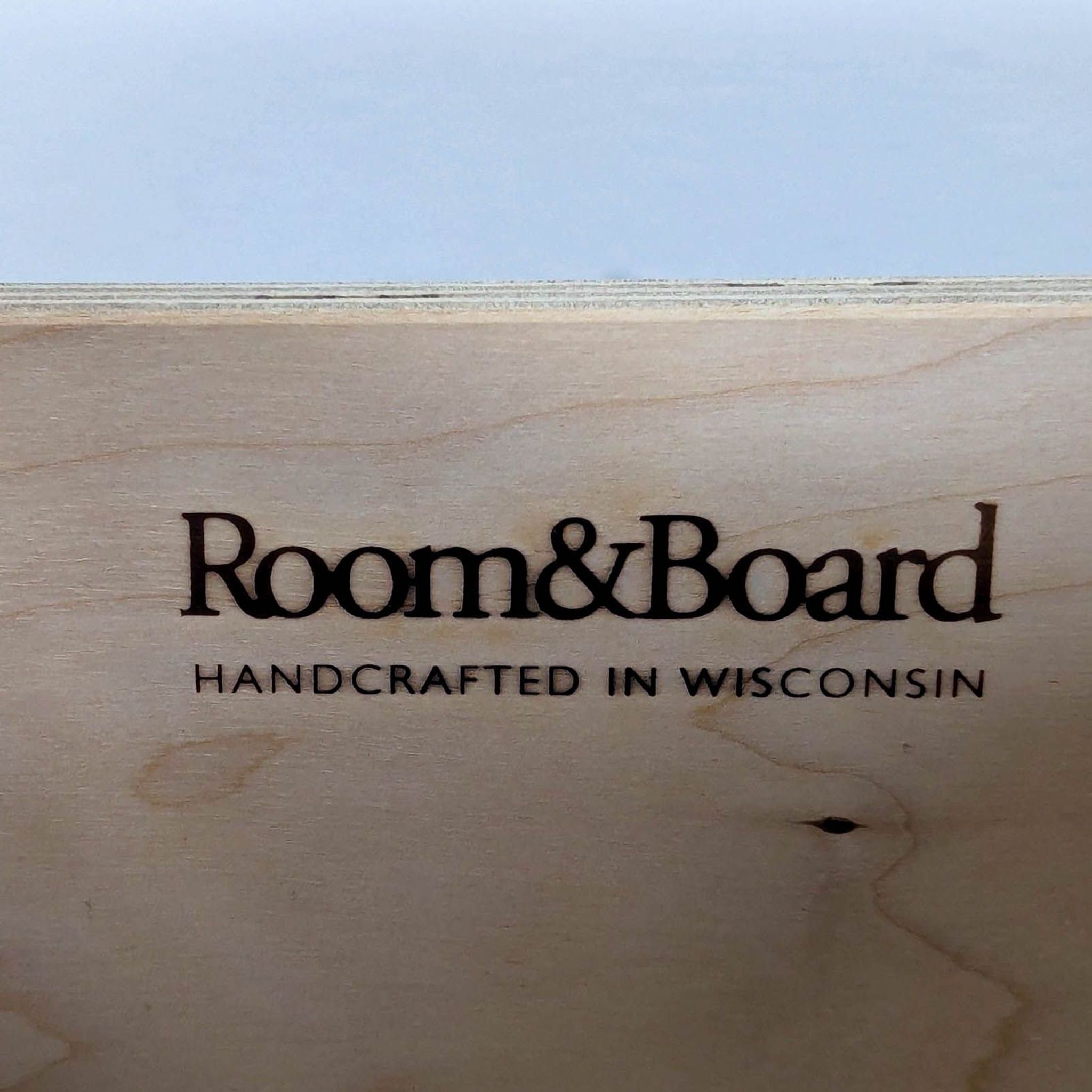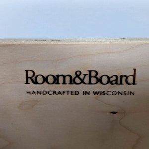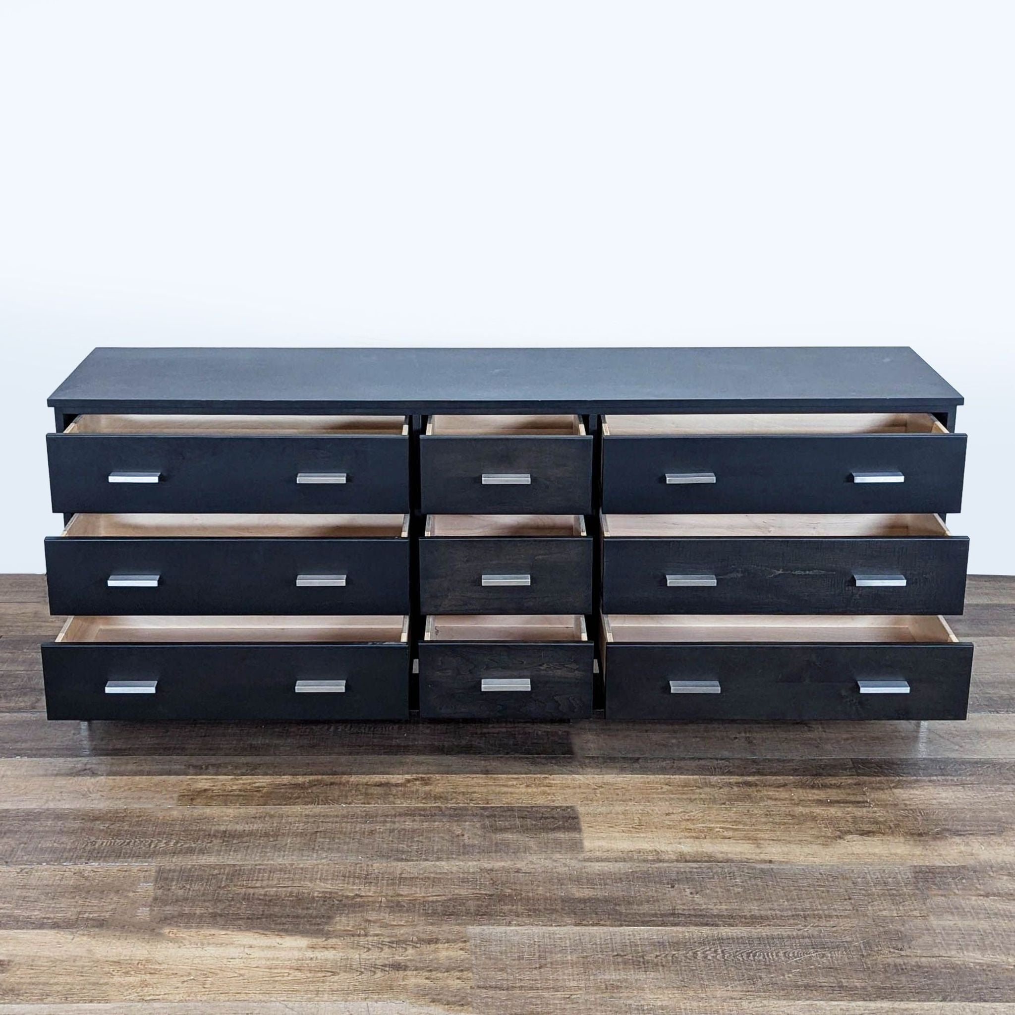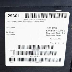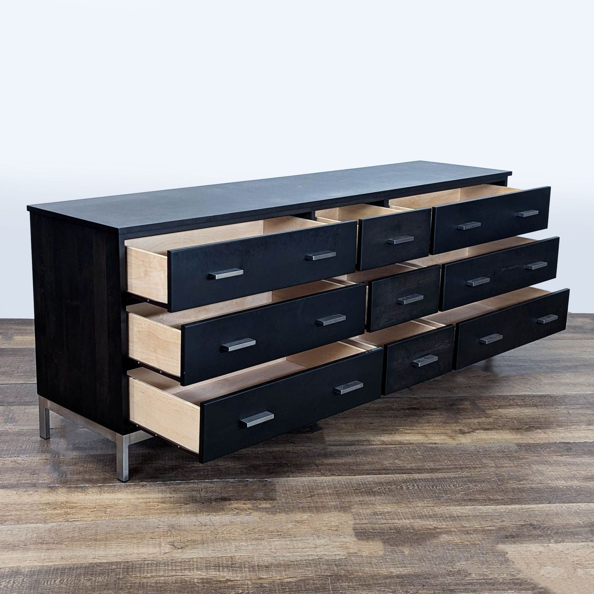 Constructed of soft maple finished in a charcoal stain with metal base and metal slab drawer pulls.
