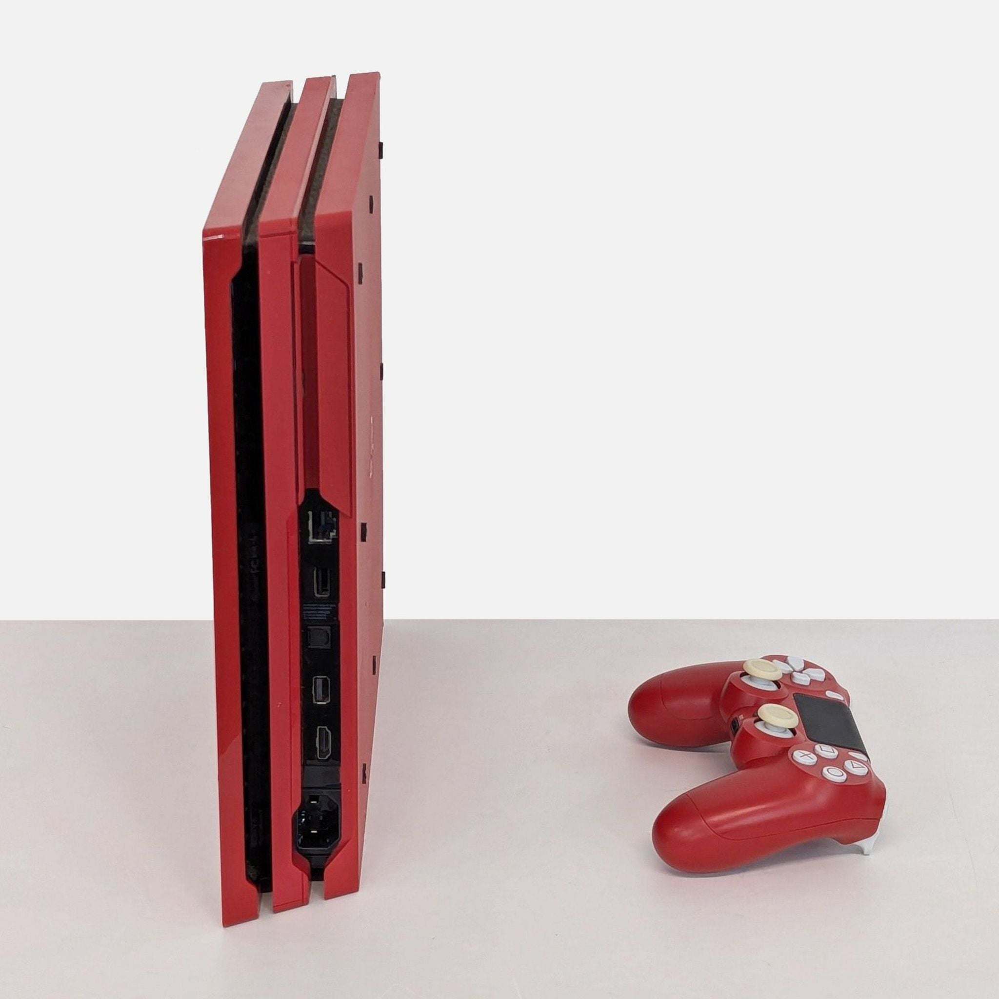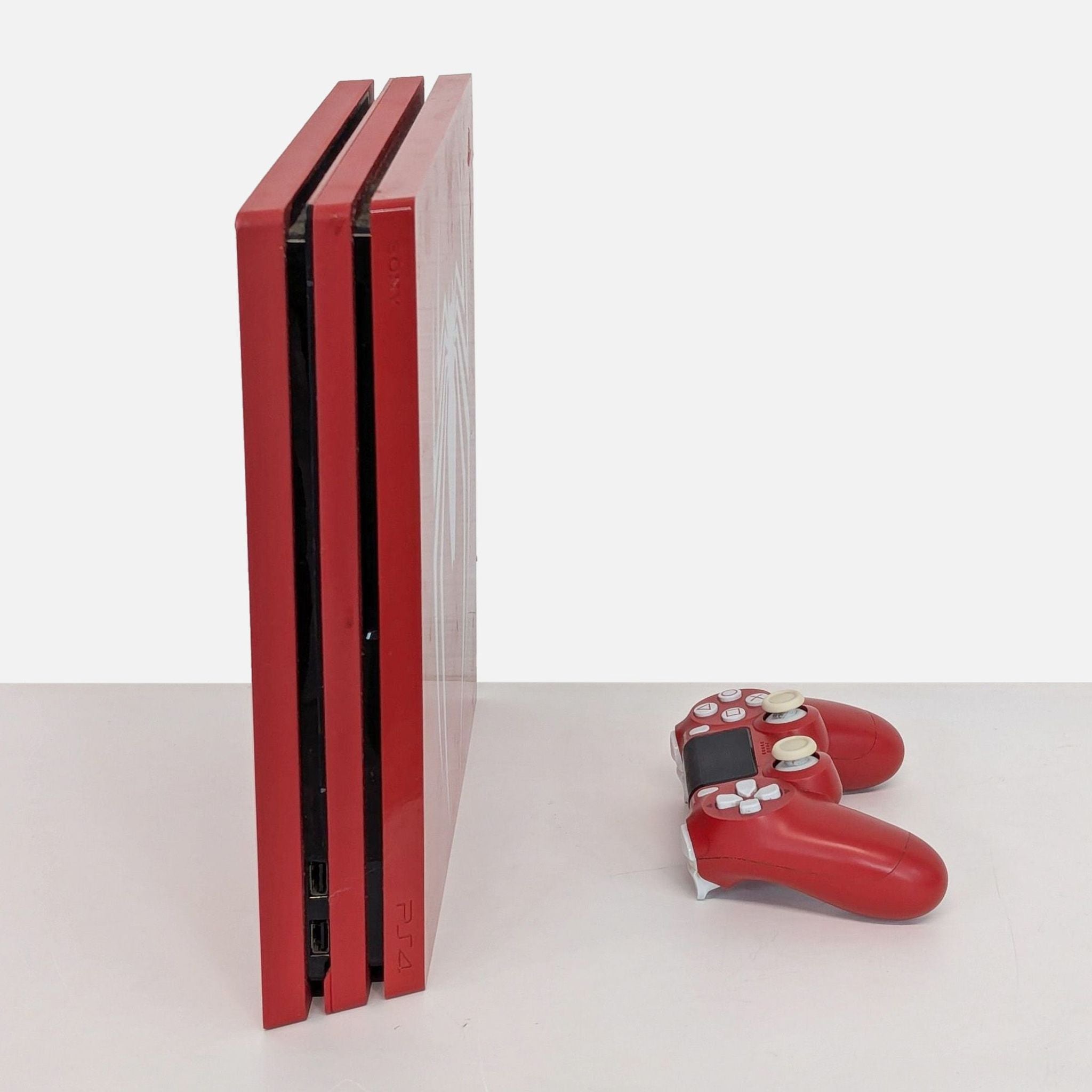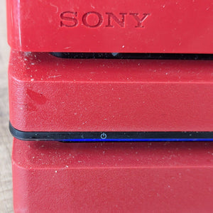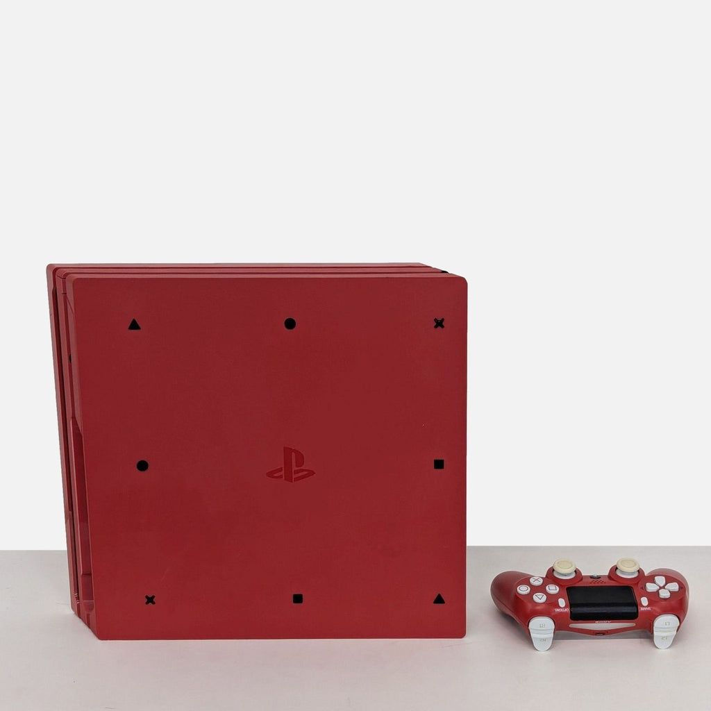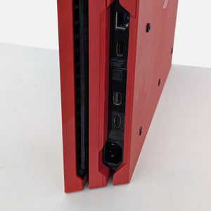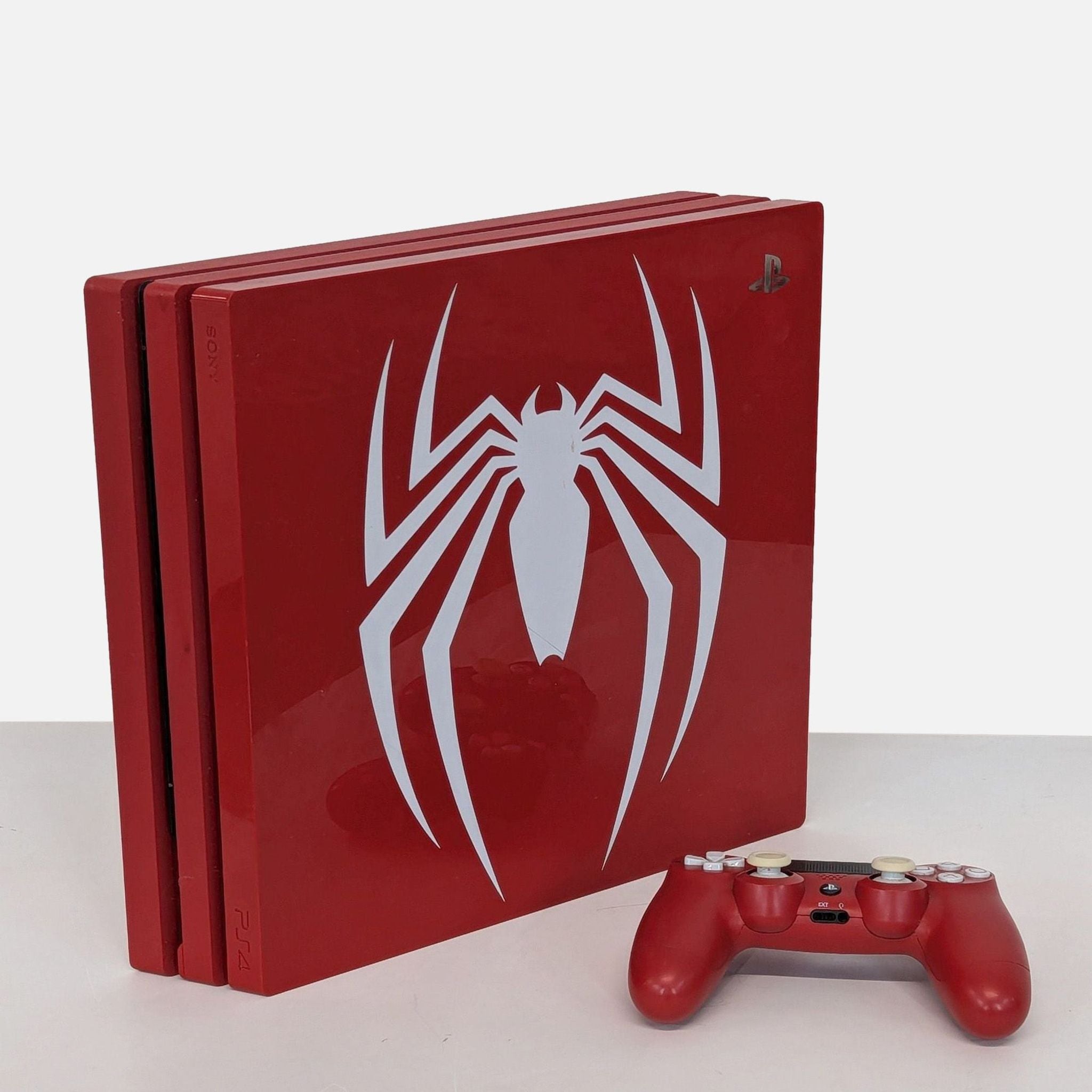 Experience gaming with the Sony PS4 Pro Limited Edition Spider-Man console. Featuring a striking red design with the iconic white spider emblem, this console is perfect for Spider-Man fans. Includes a matching red DualShock 4 wireless controller. Jump into your favorite games with enhanced graphics and performance. A must-have for any gaming enthusiast.
