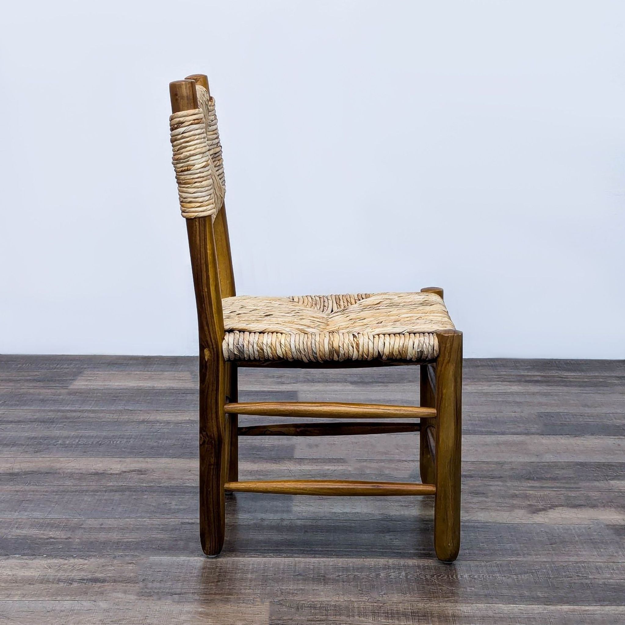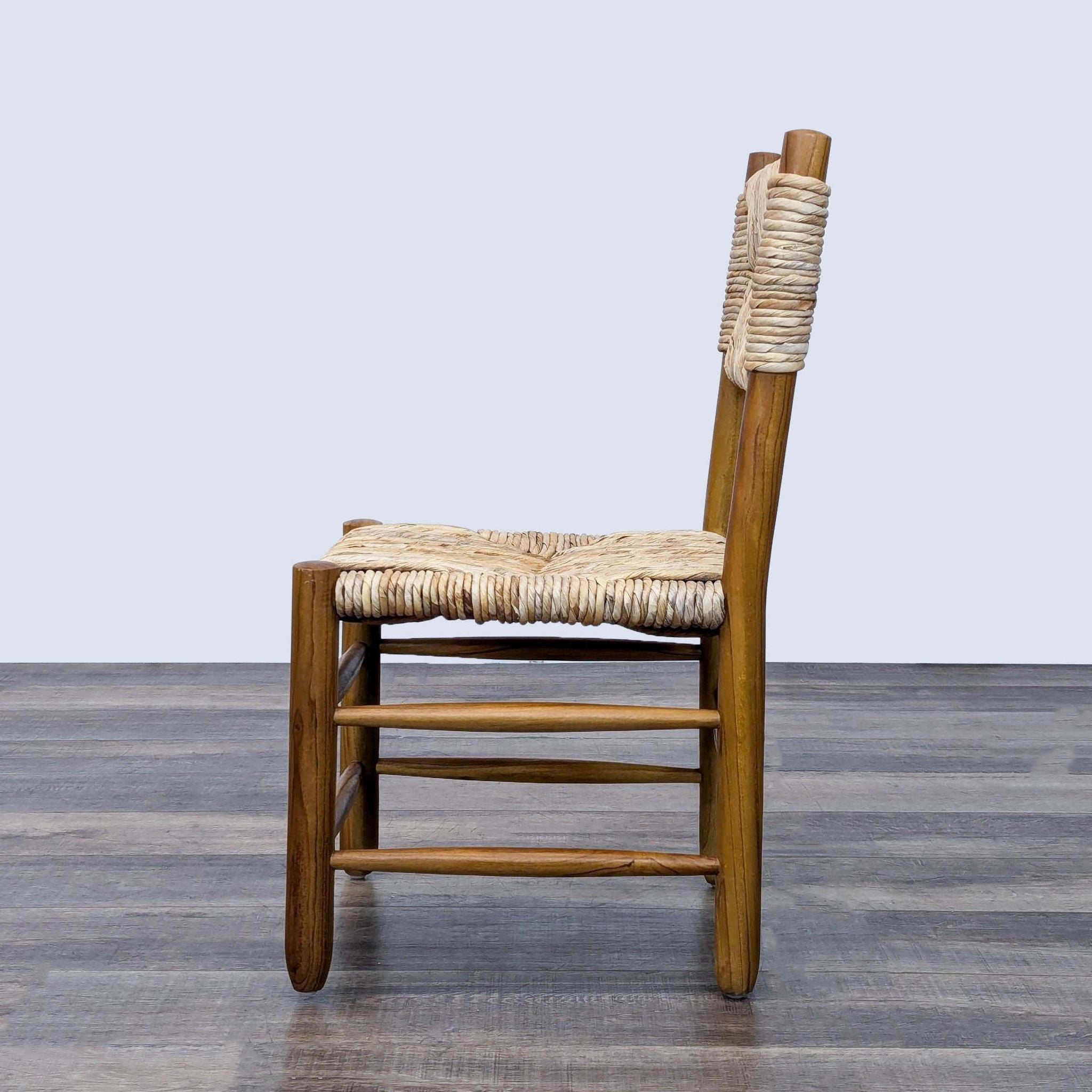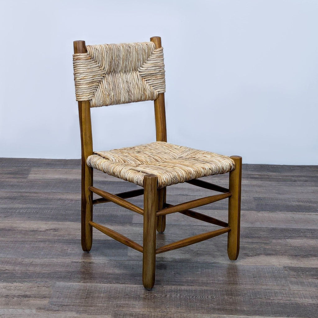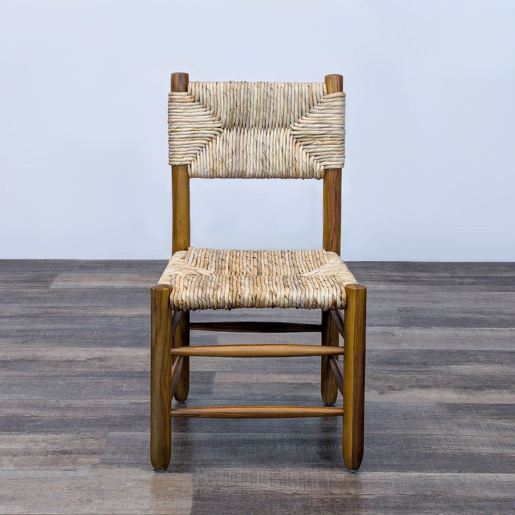 The Dordogne dining chair was designed by Charlotte Perriand for Robert Sentou in the 1950s. The chairs feature a stained teak frame, consisting of straight, thick legs that are connected to each other with slim horizontal slats. The seats and backrests consist of straw. The chairs are named 'Dordogne' in reference to the river located in the French Correze region.