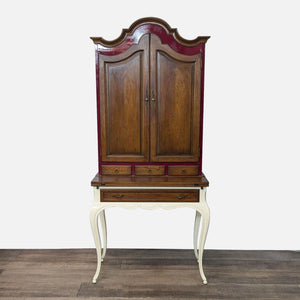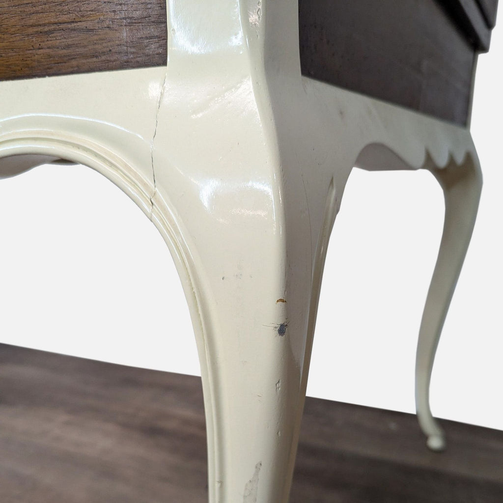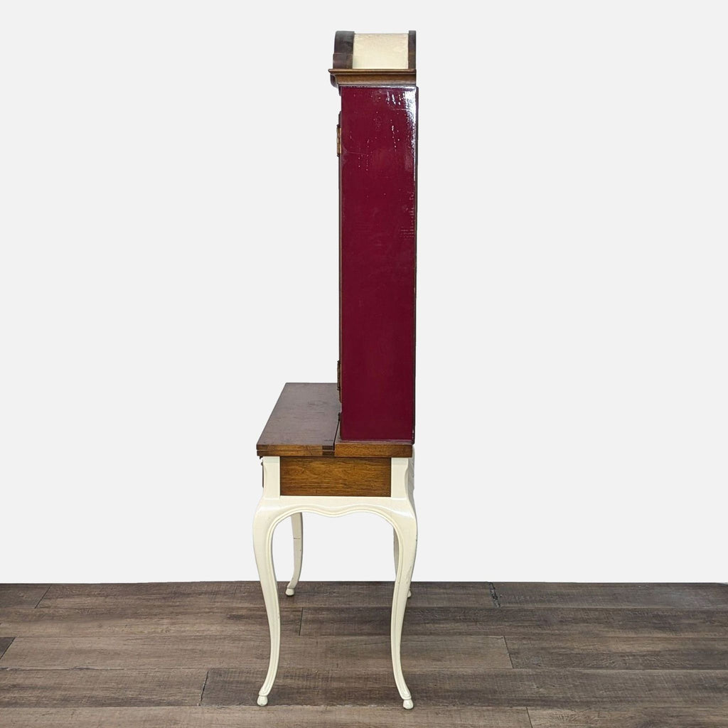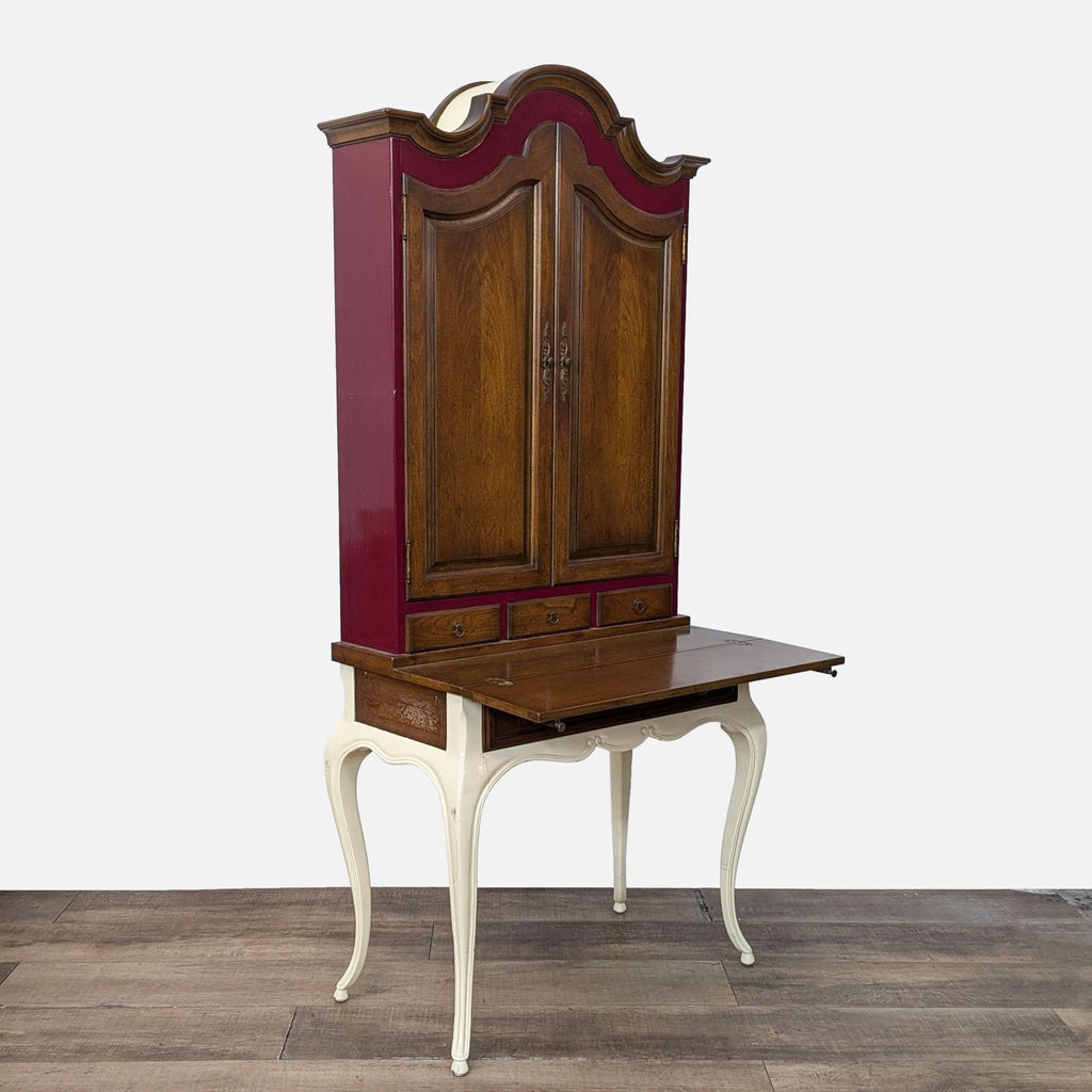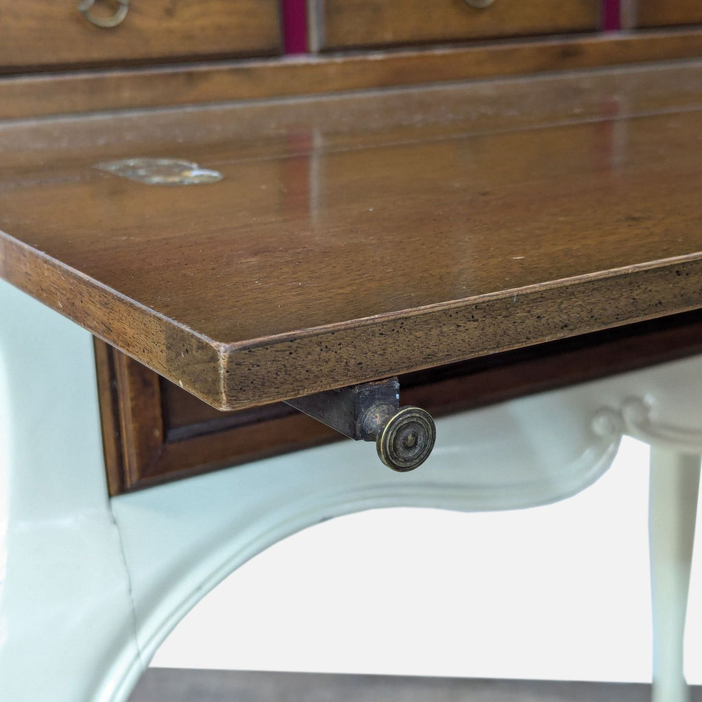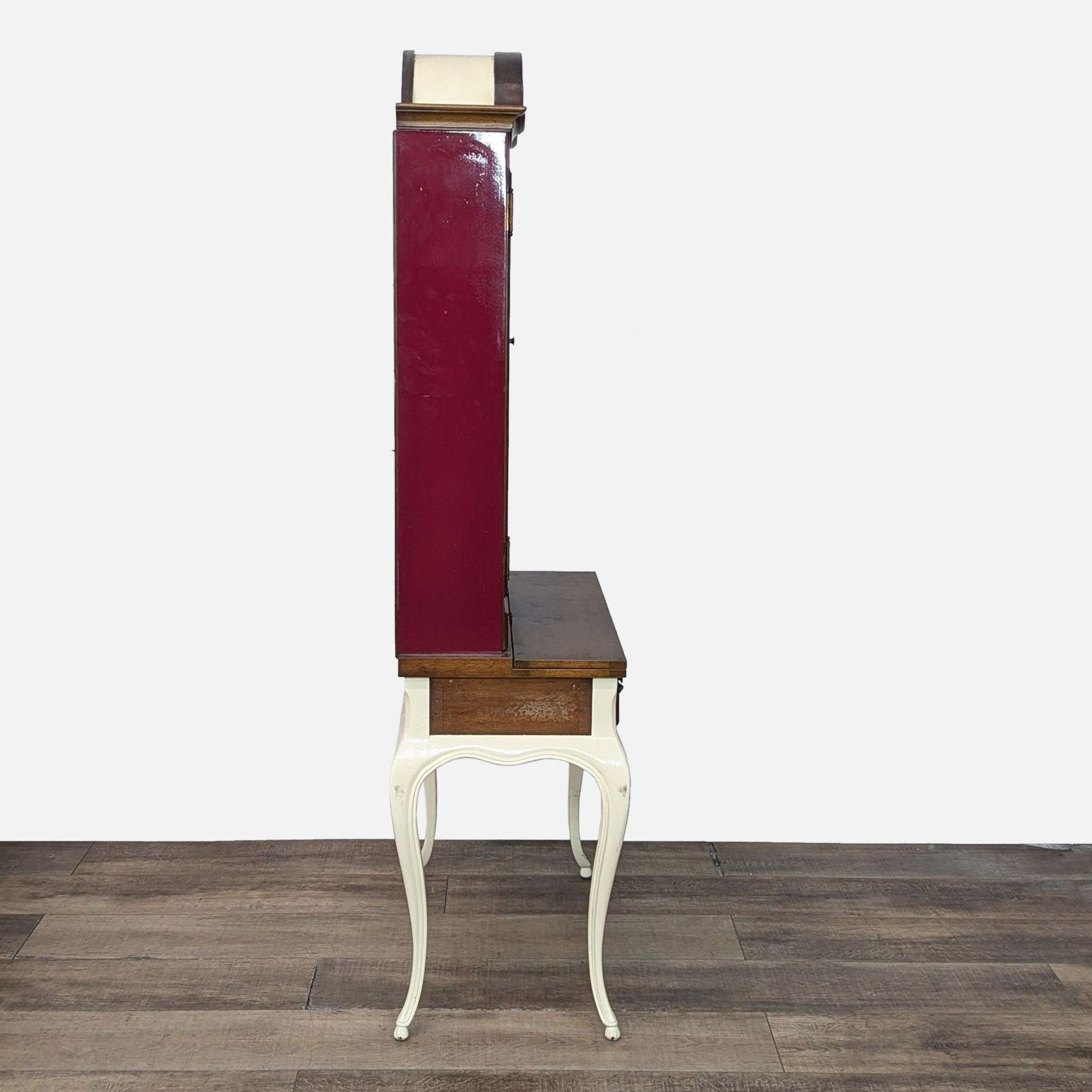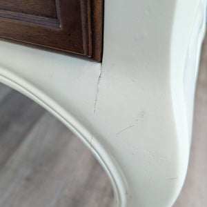 This Bodart desk combines vintage charm with practical design. Featuring a wooden cabinet top with ample storage and classic brass handles, it sits on elegant curved legs painted in a clean ivory finish.