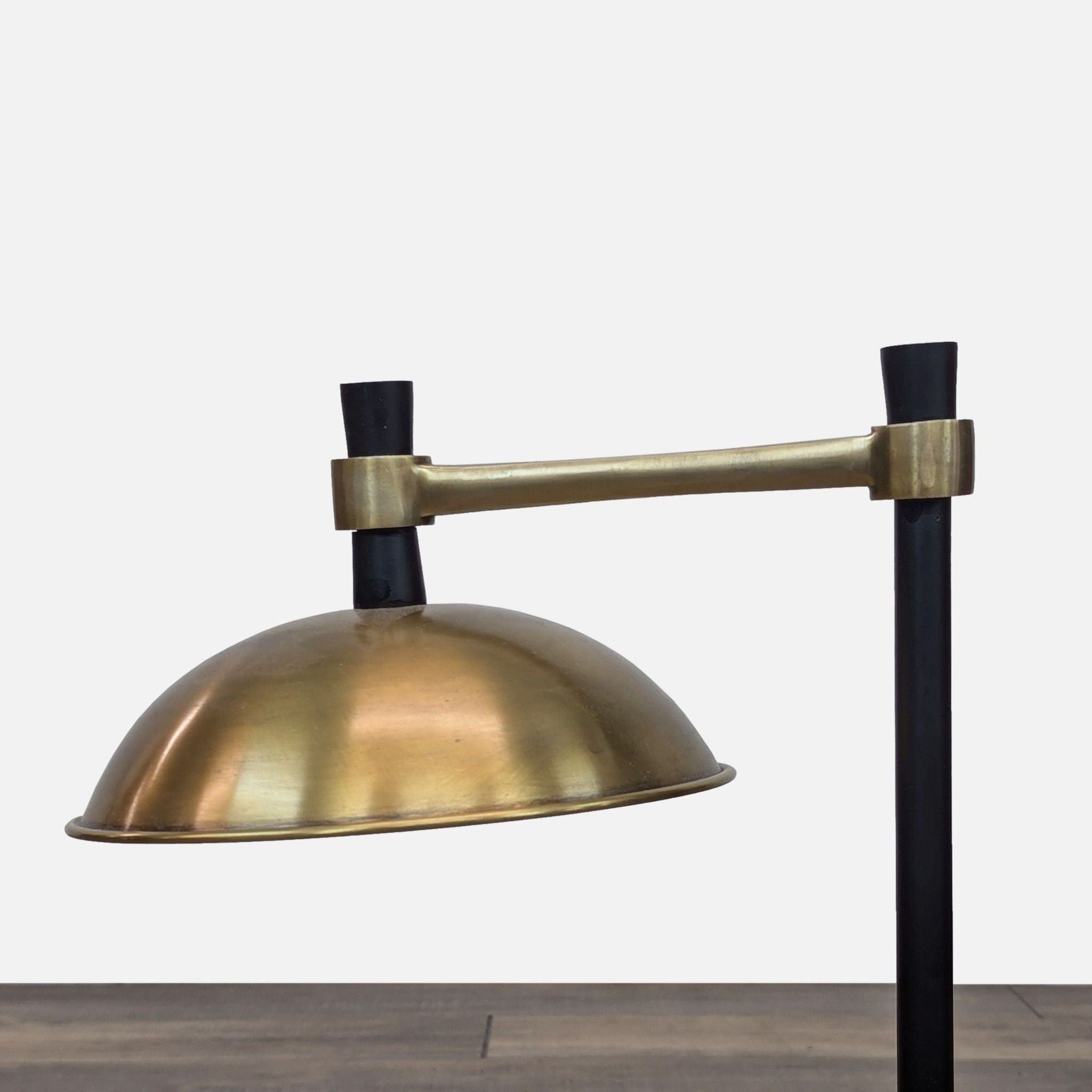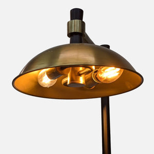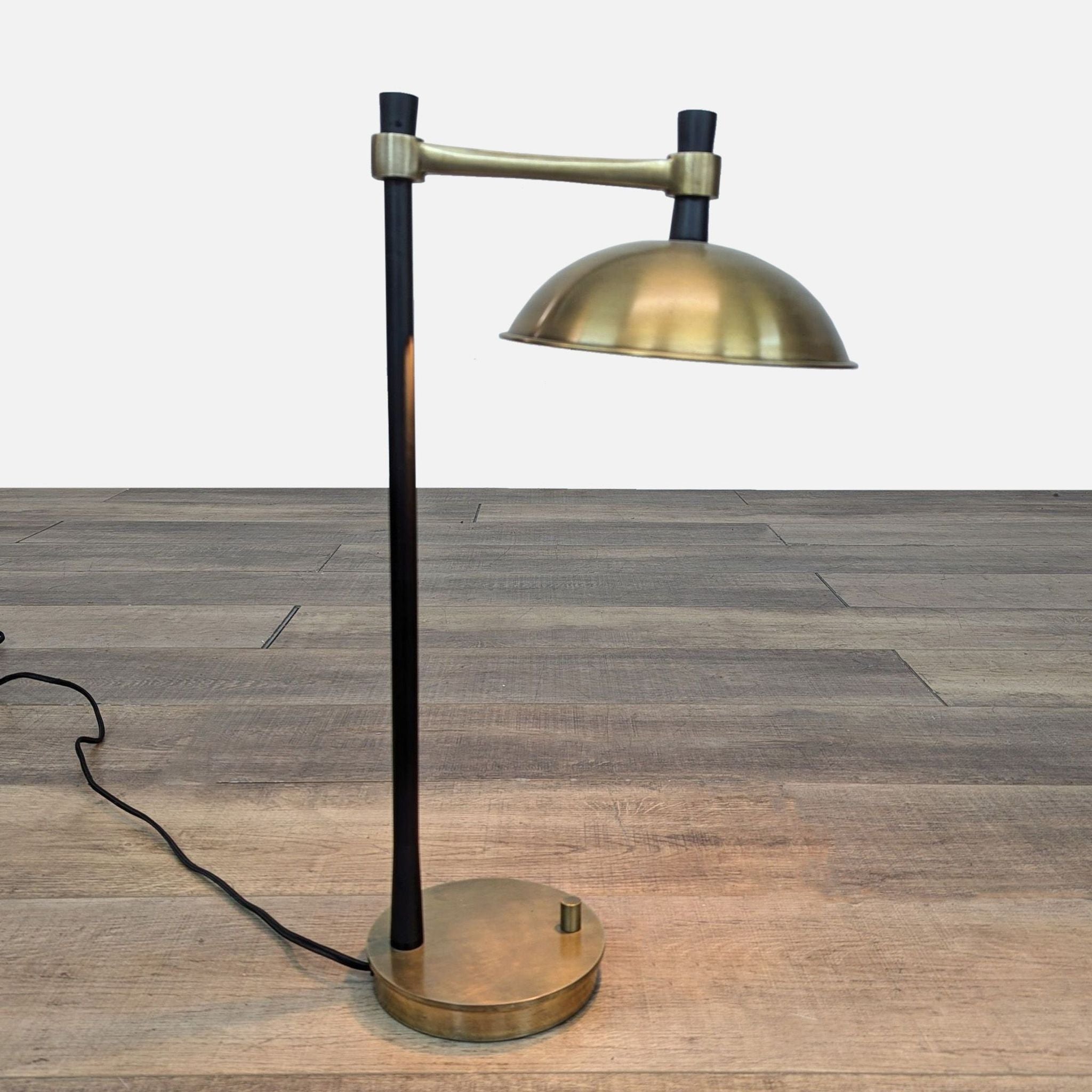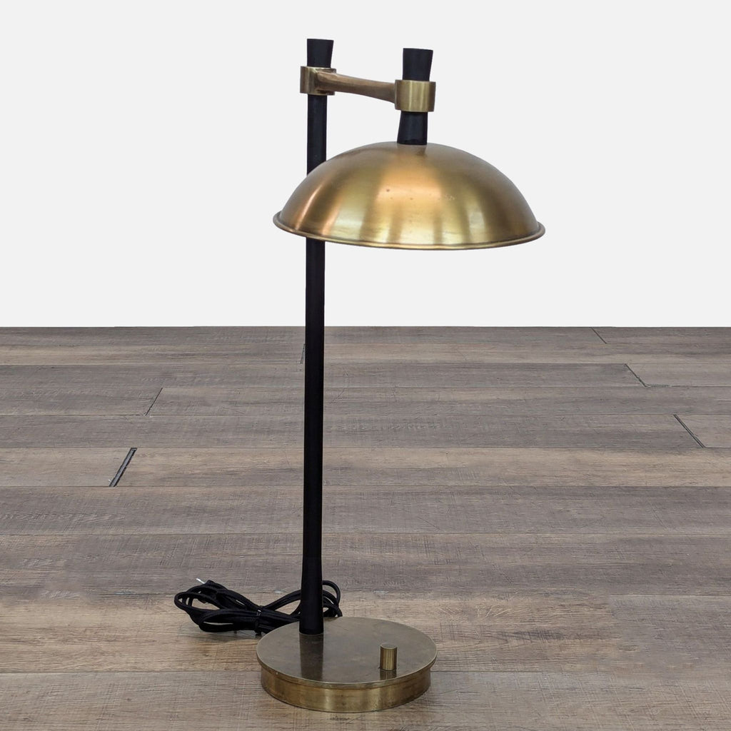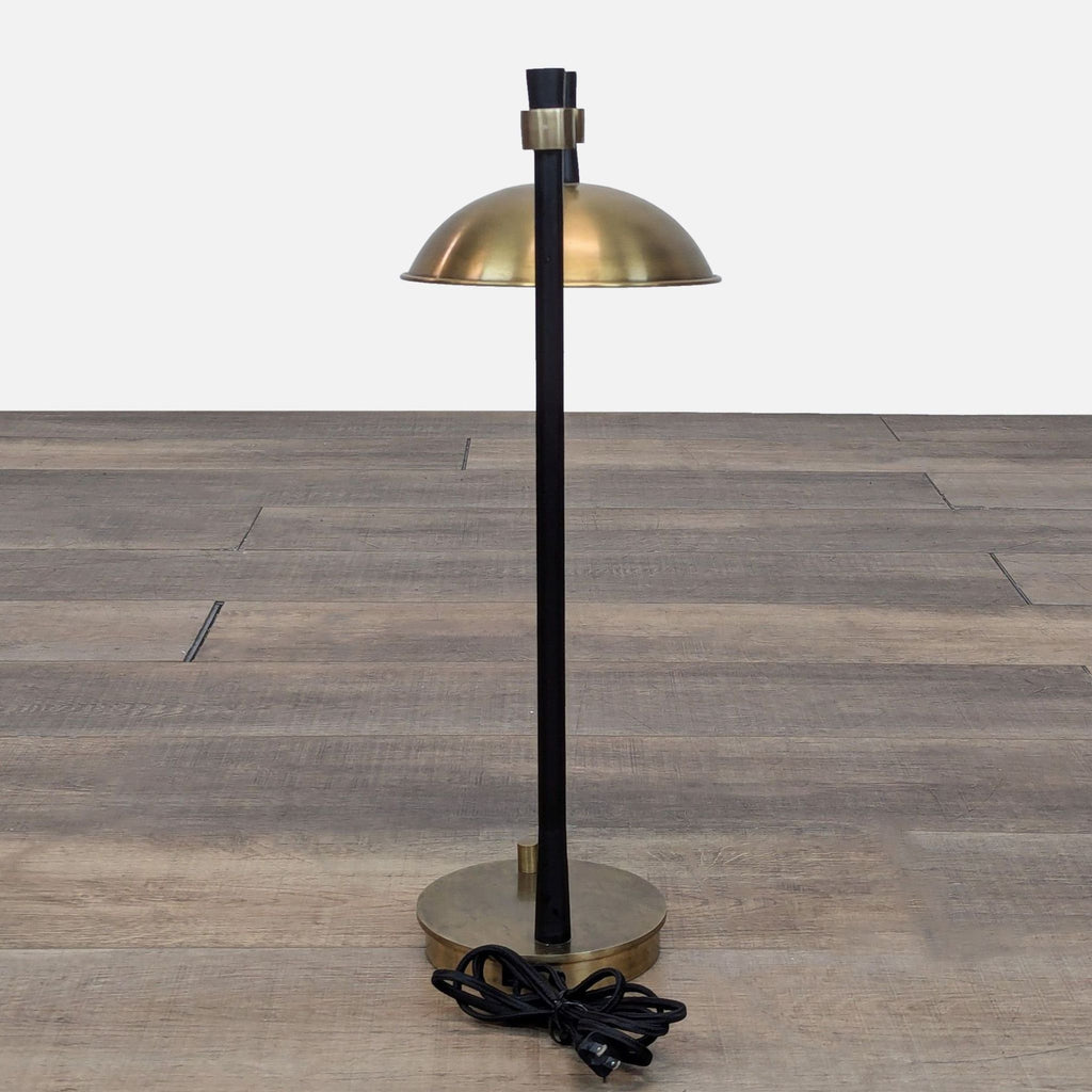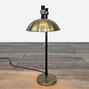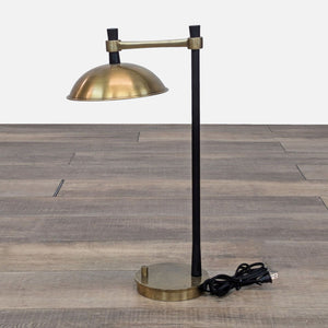 The Leland table lamp features lean lines joined with a circular base and shade. Crafted of iron, the sleek silhouette features a convenient USB charging port and brass-finished accents for a timeless feel.