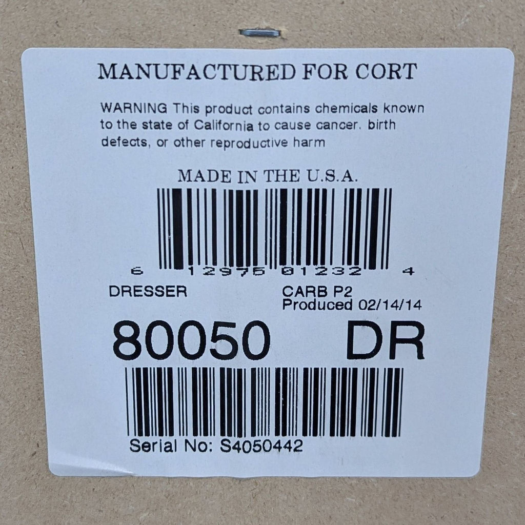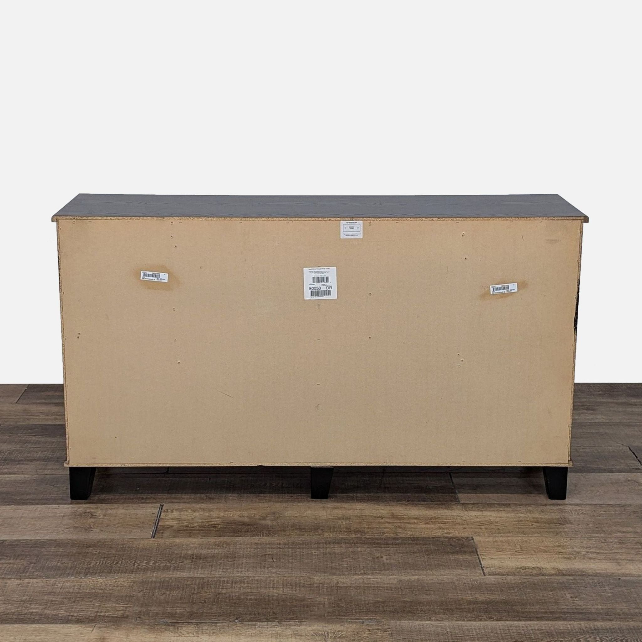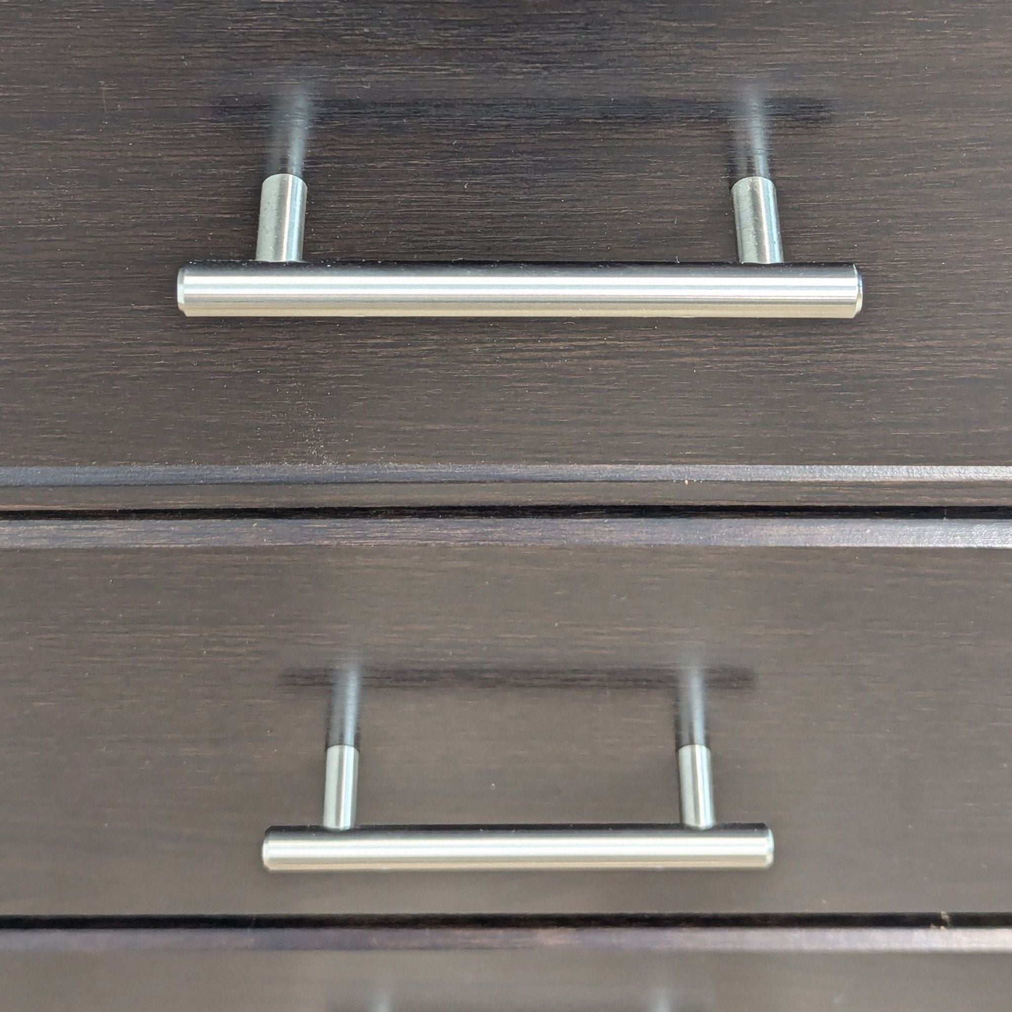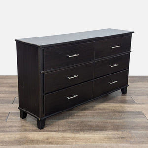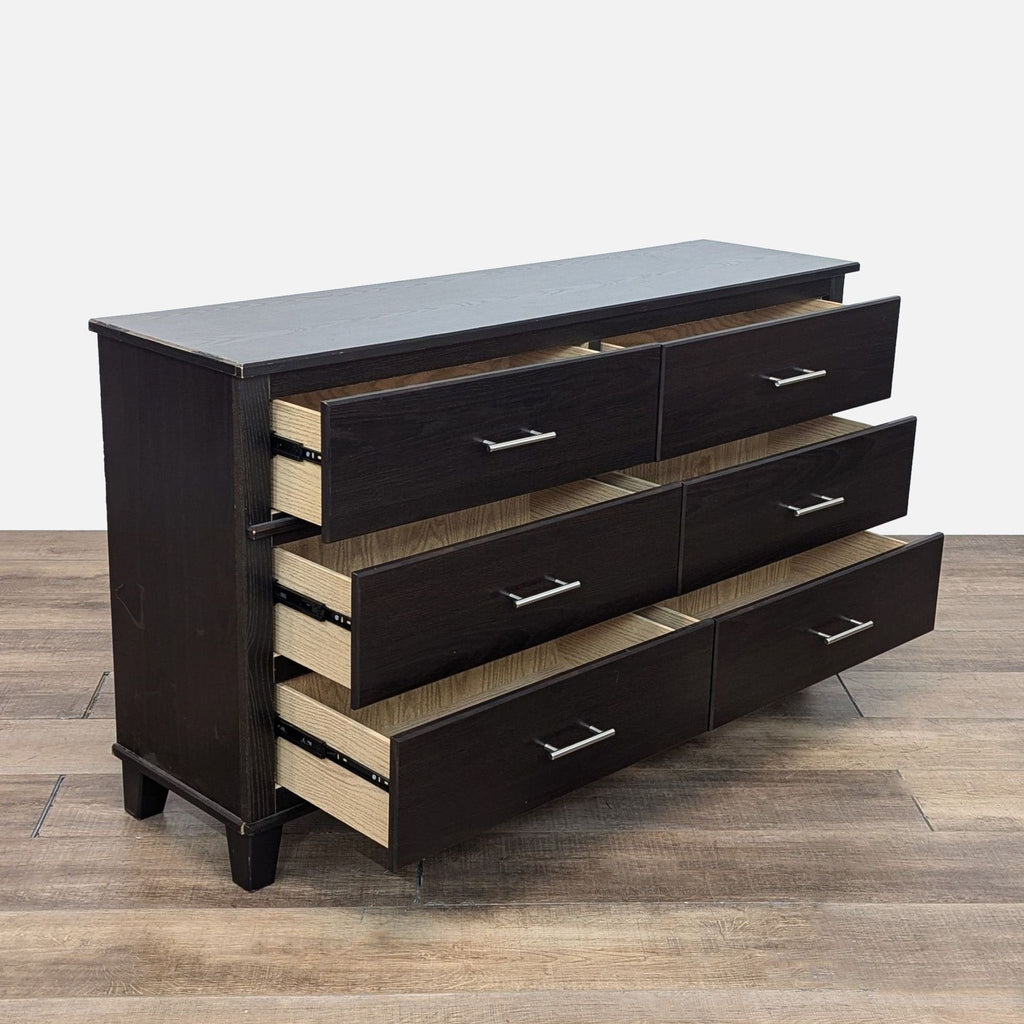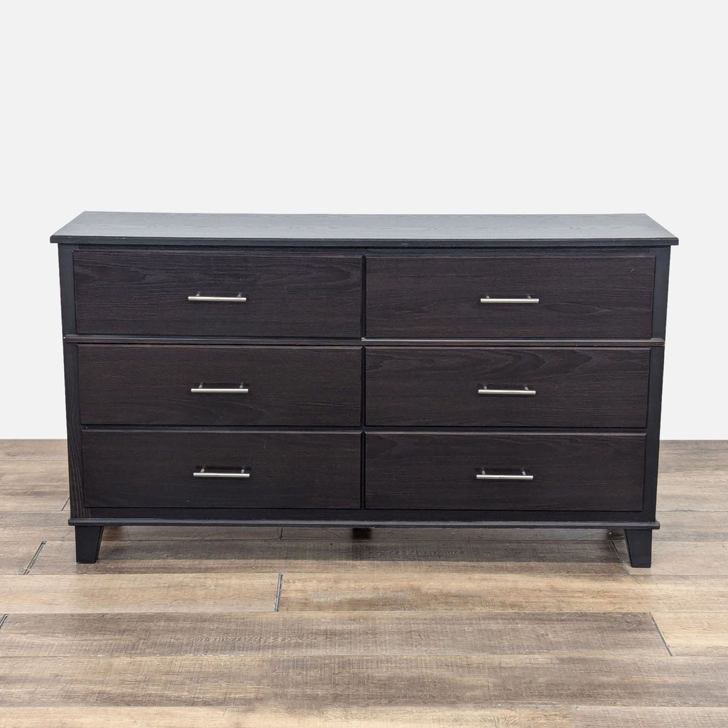 Dakota dresser with six drawers on metal glides and brushed nickel handles.