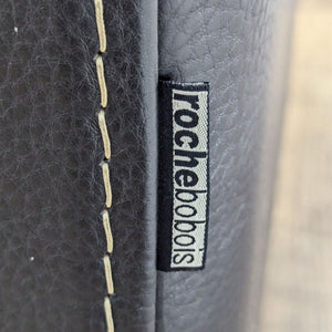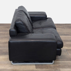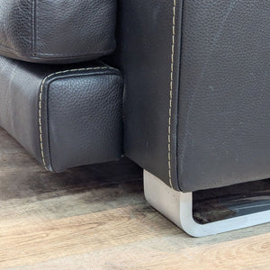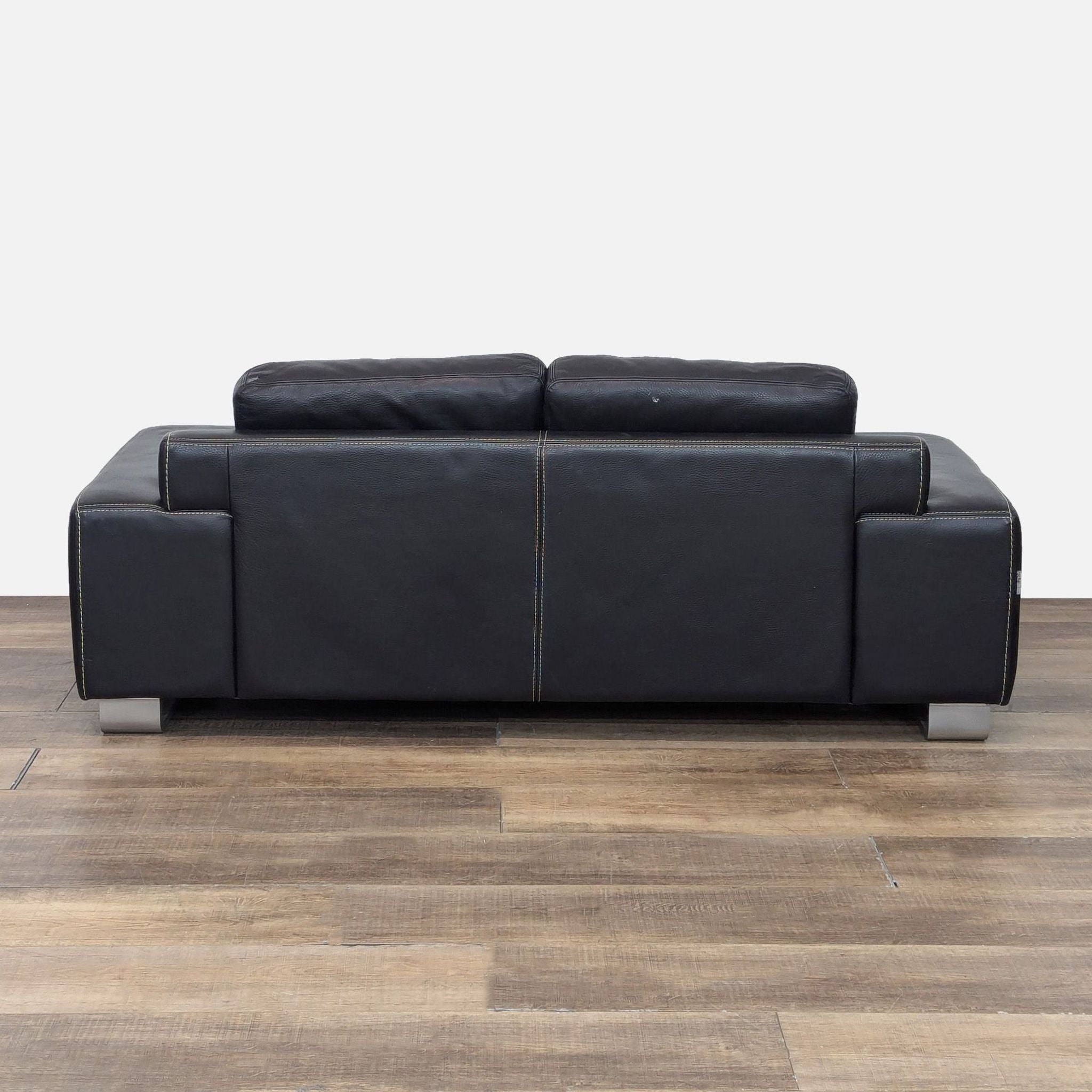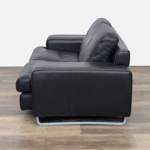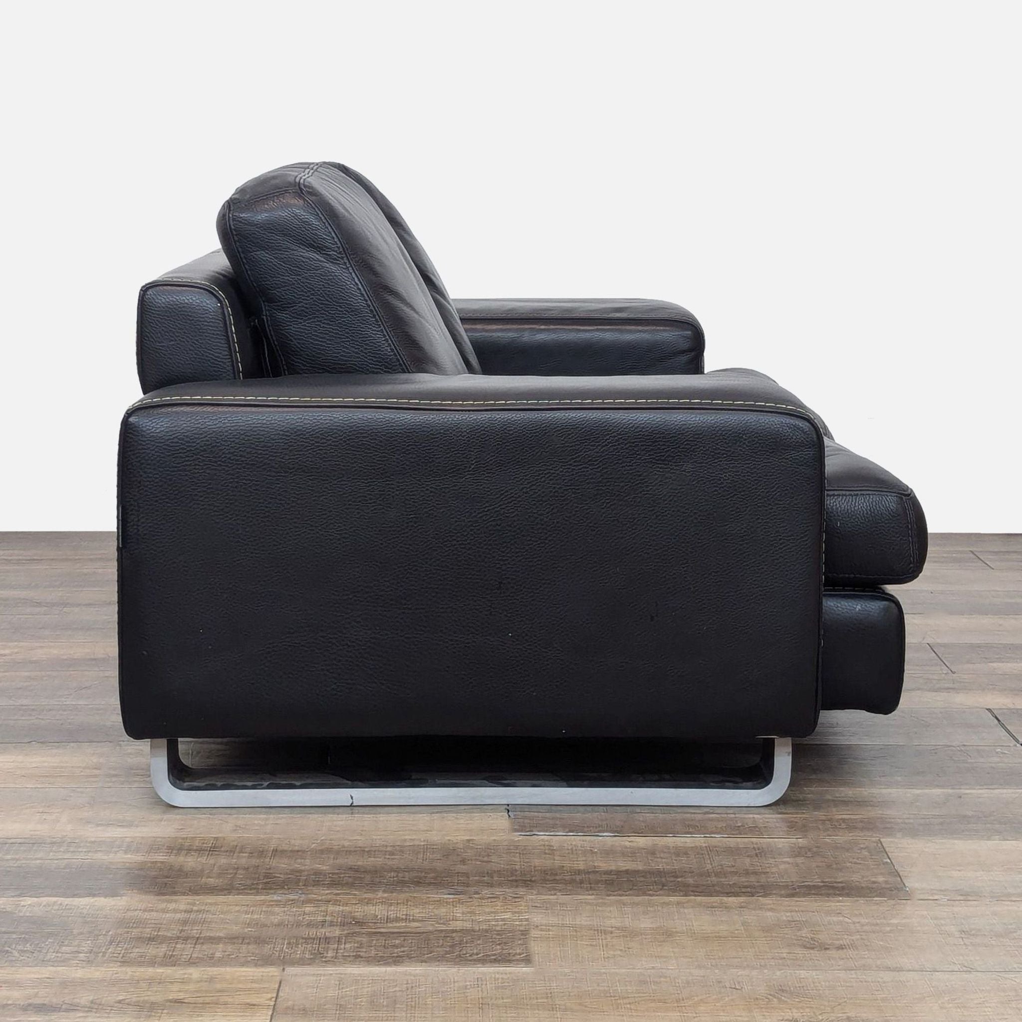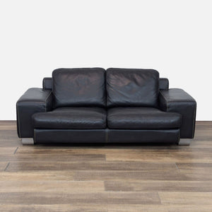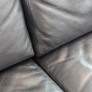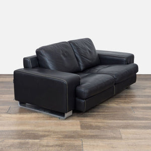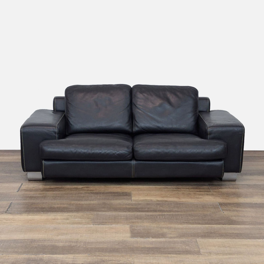 This loveseat presents a sleek and modern look and features black pebbled leather, heavy stitching, deep seating with amazing lumbar support, and low and wide sofa arms.