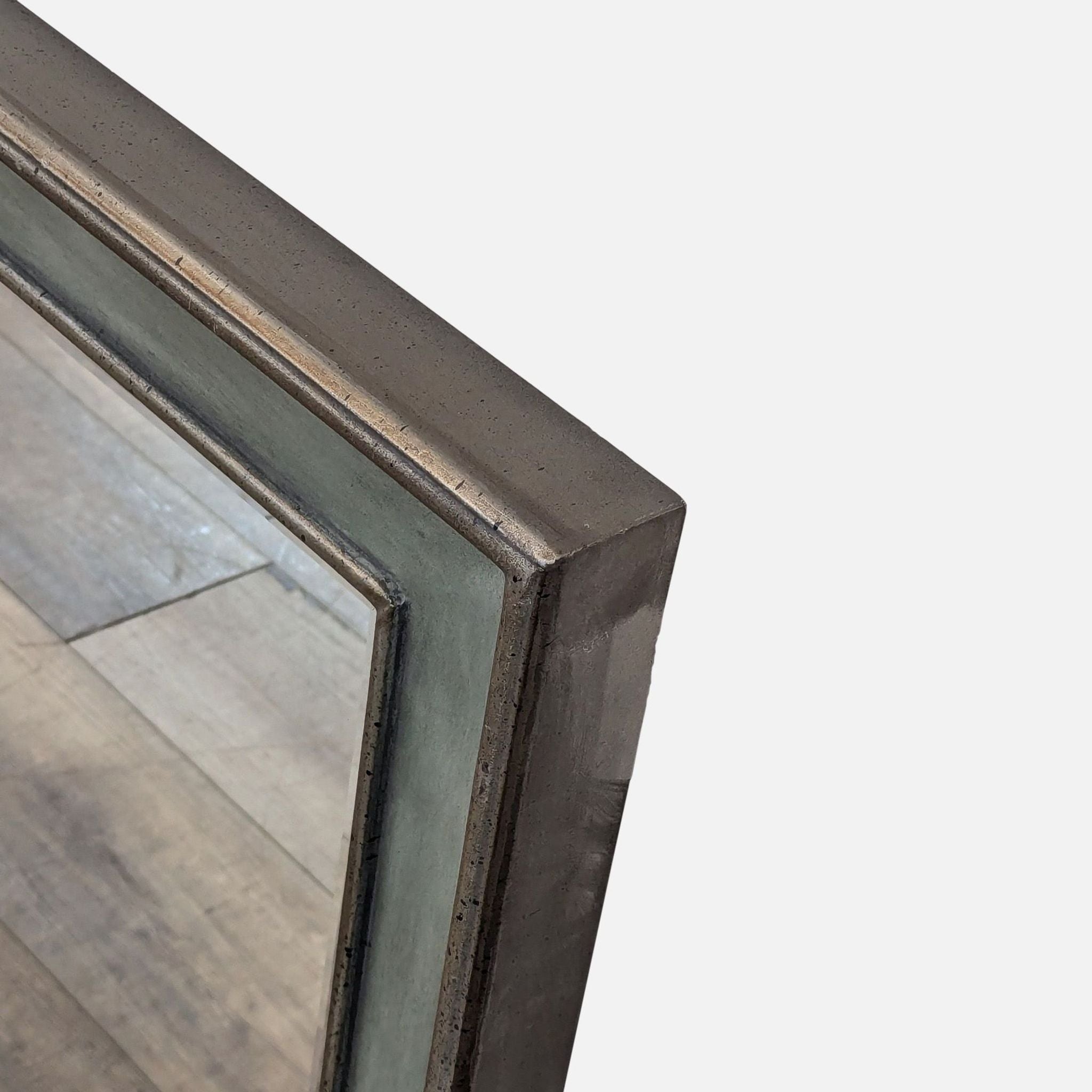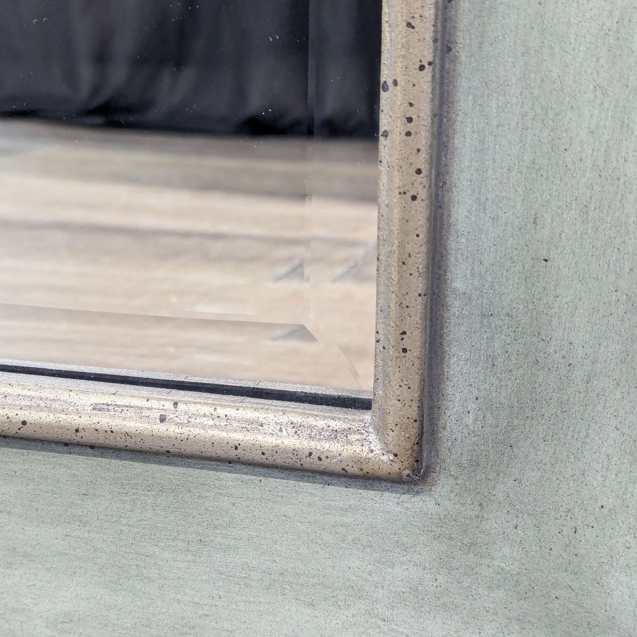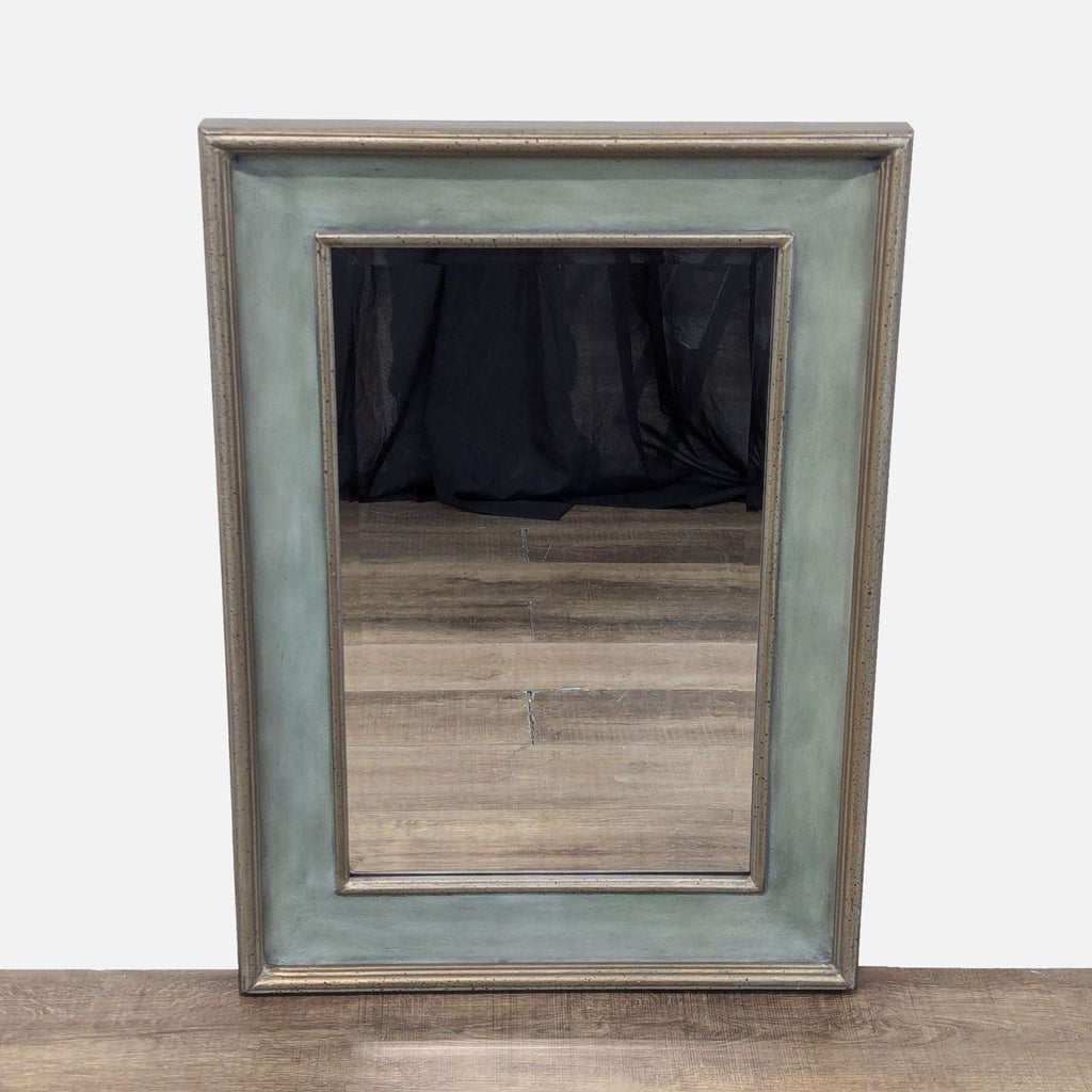 This wood frame features a hand rubbed - blue-green finish with ivory undertones and lightly antiqued silver leaf details that give the appearance of a blue green finish. The mirror has a 1 1/4 inch bevel. Both vertical and horizontal positions are possible.