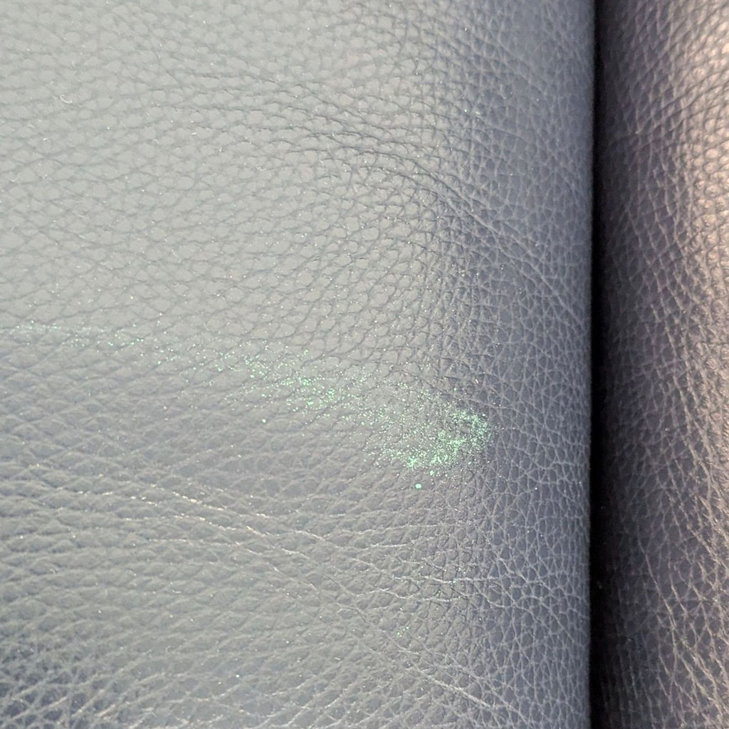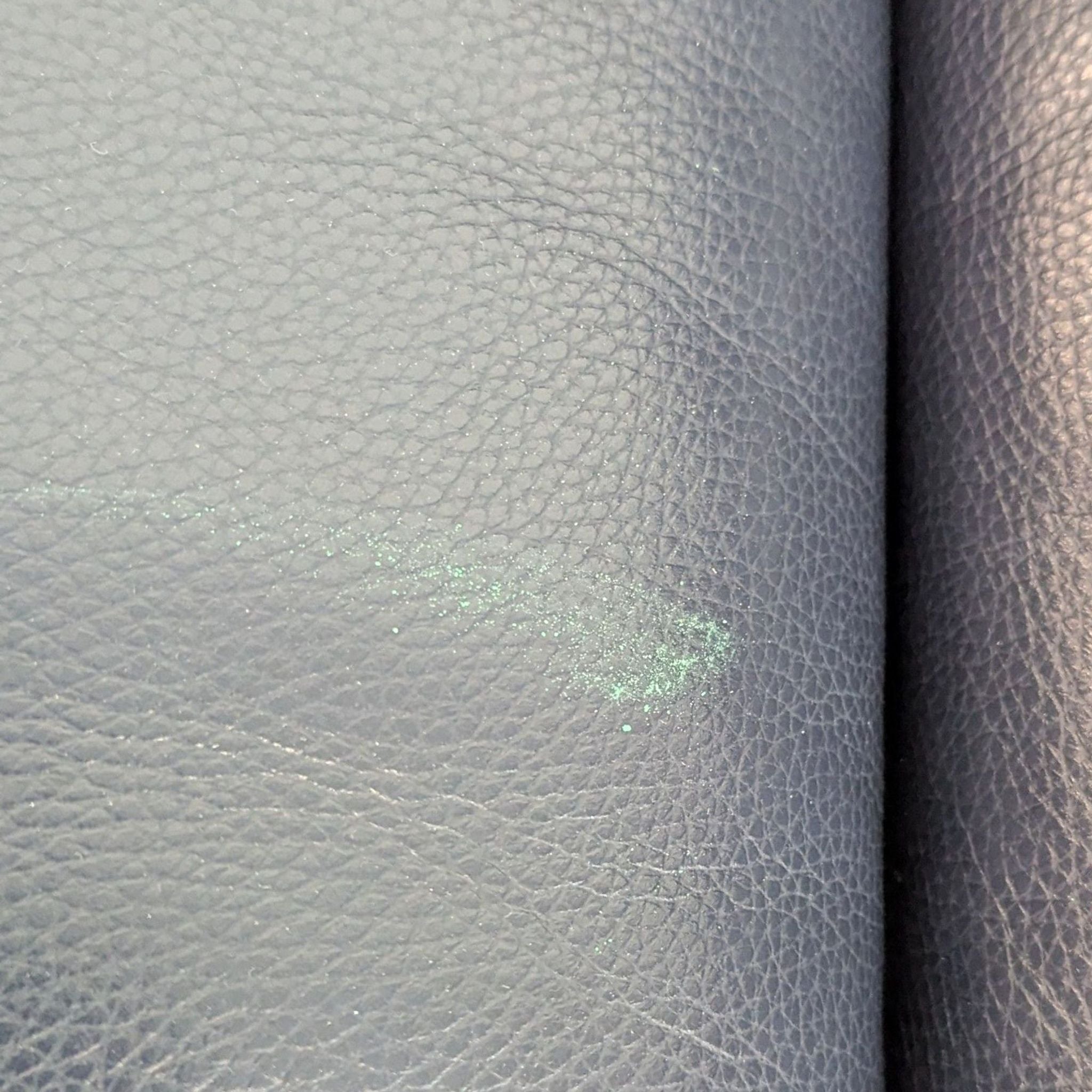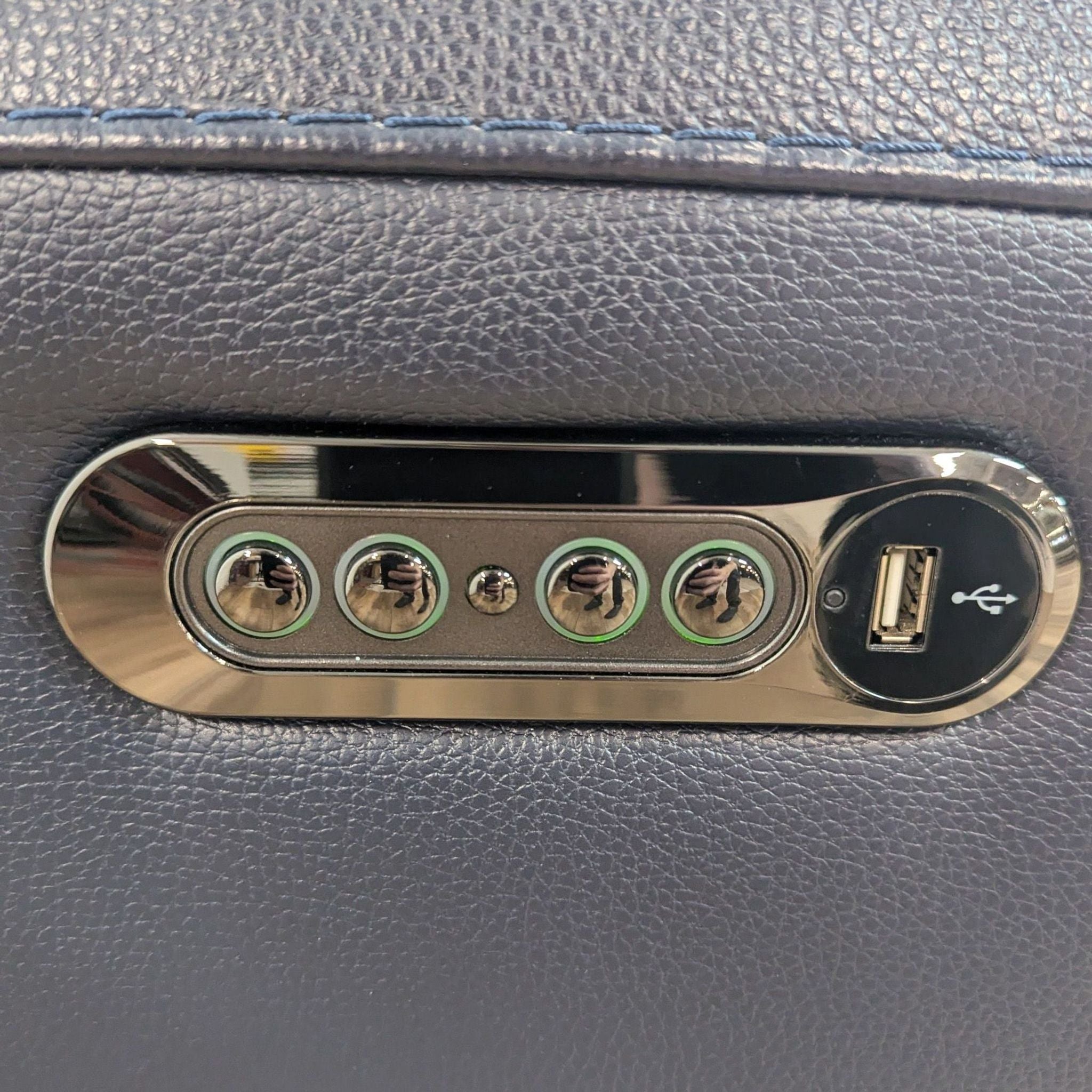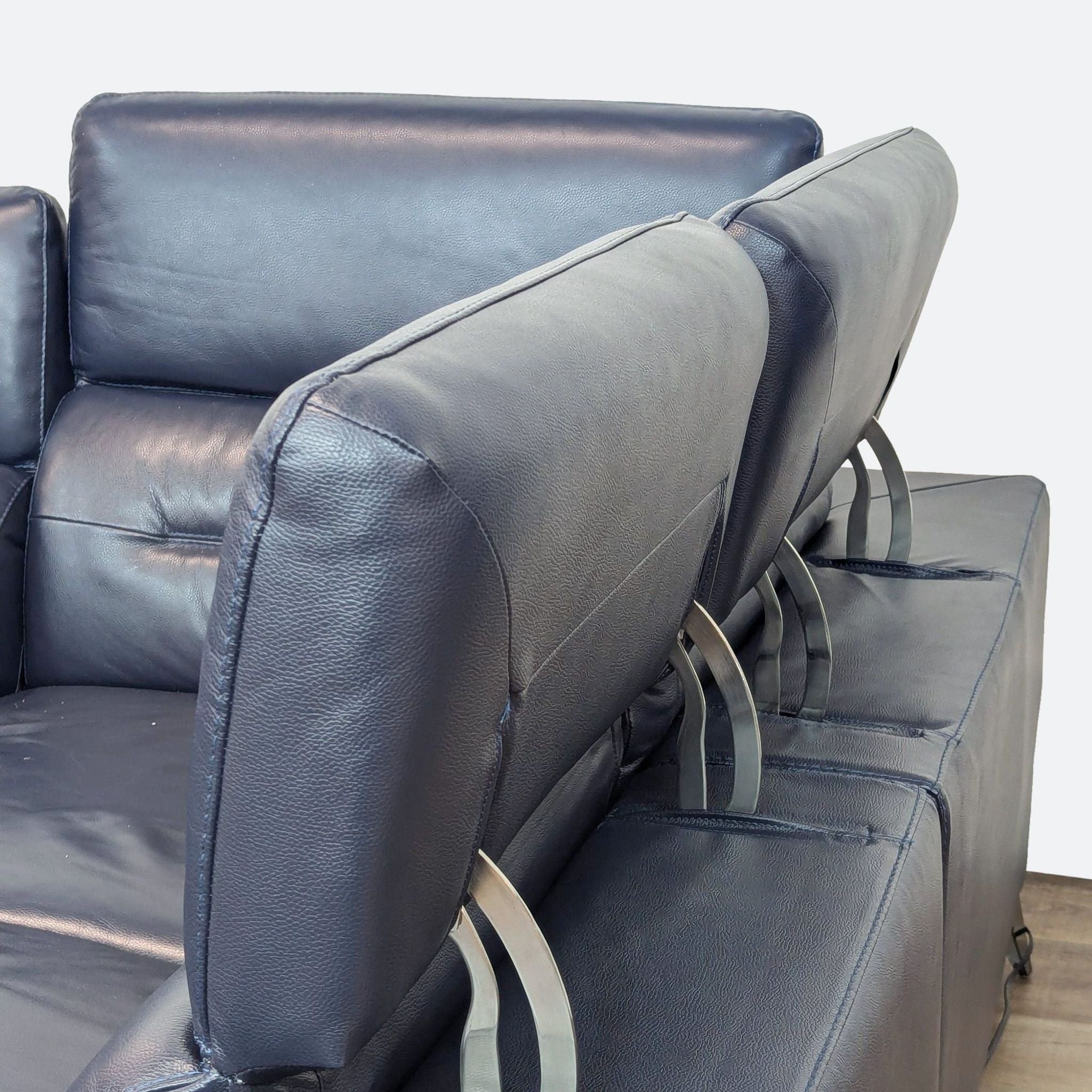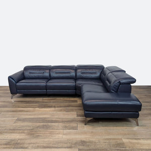 This navy leather sectional sofa features power recliners, adjustable headrests and stainless feet.