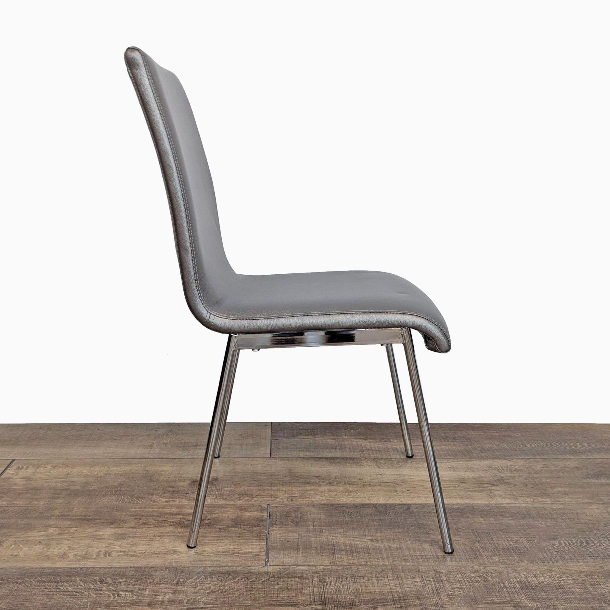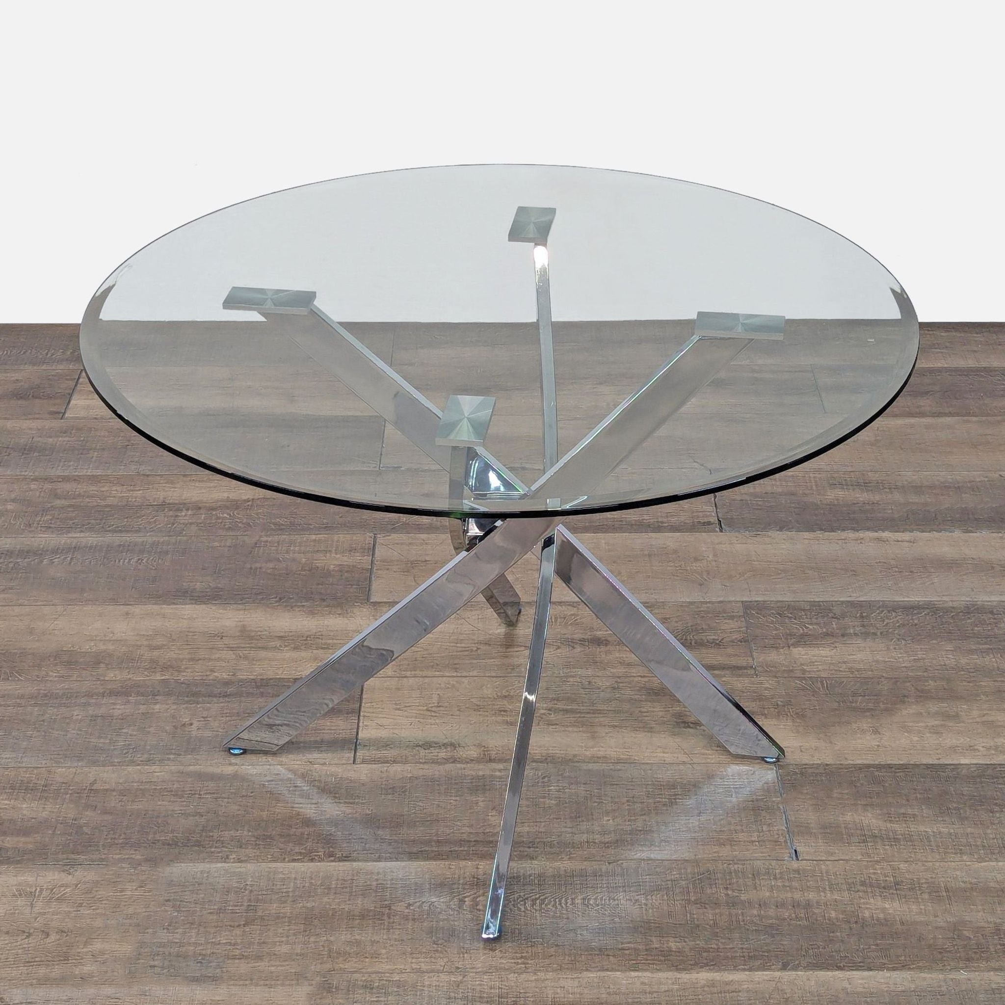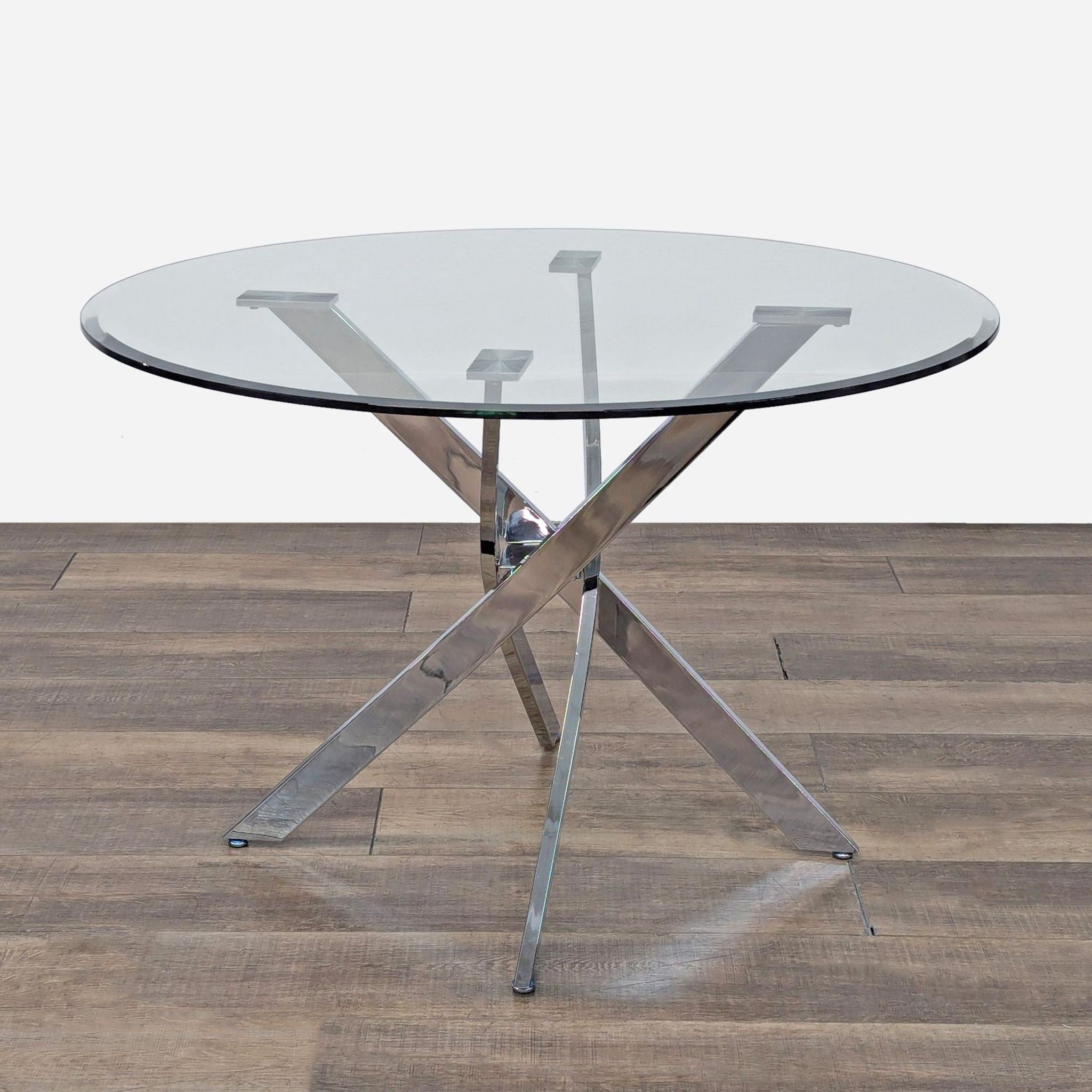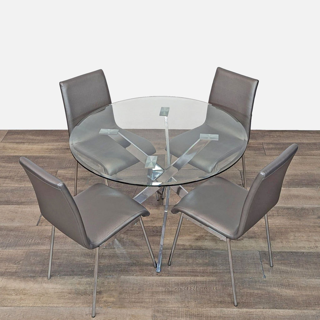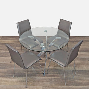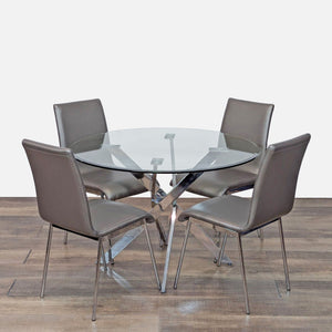 The Putnam 5-Piece Dining Set features a round glass top table with a uniquely designed sculptural base. The four chairs feature a sturdy chrome metal frame with a slim waterfall silver metallic faux leather profile.