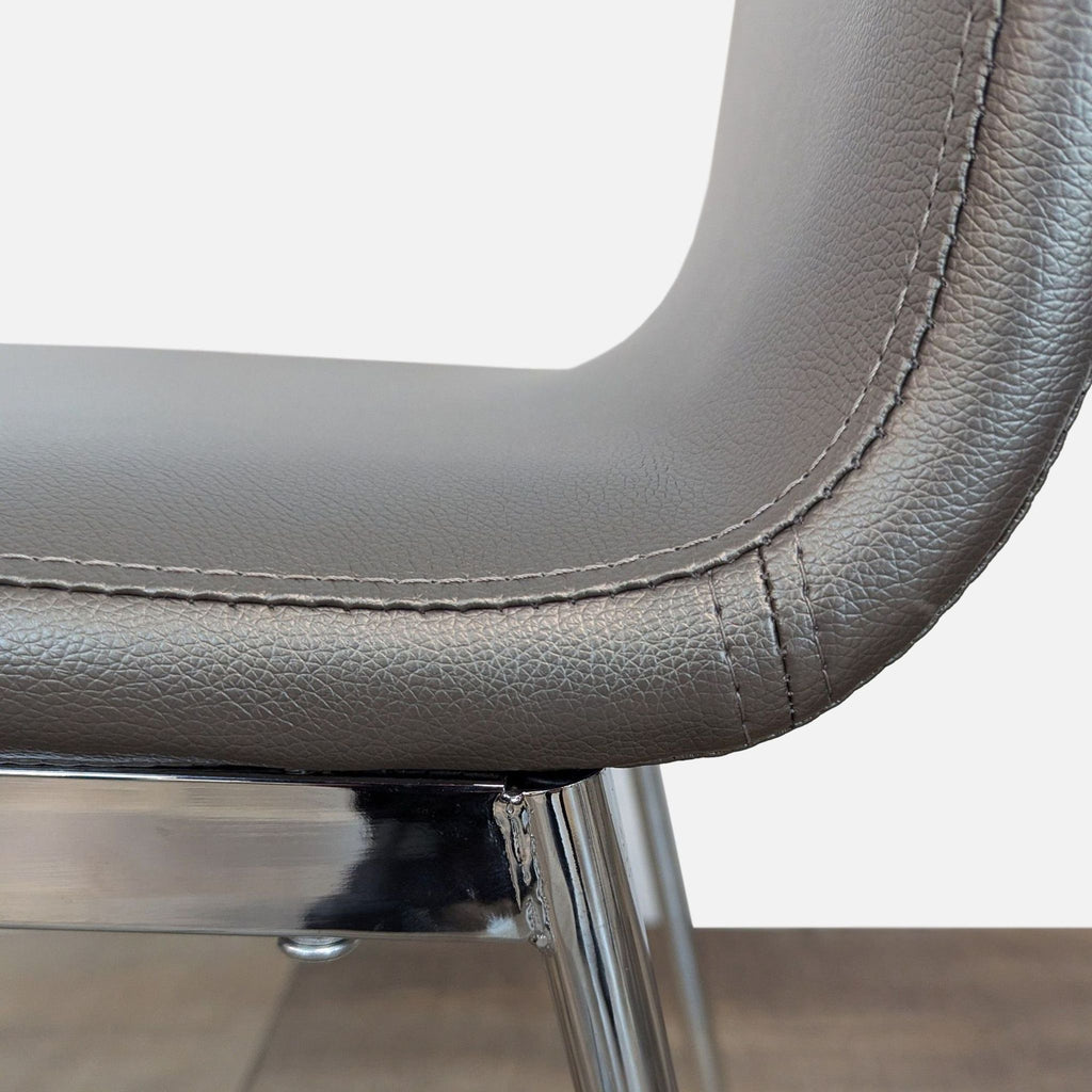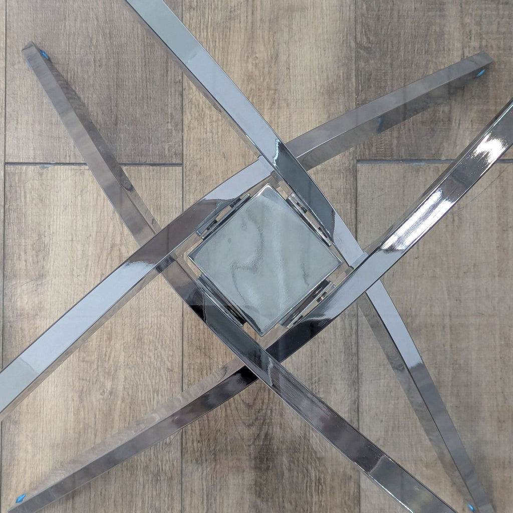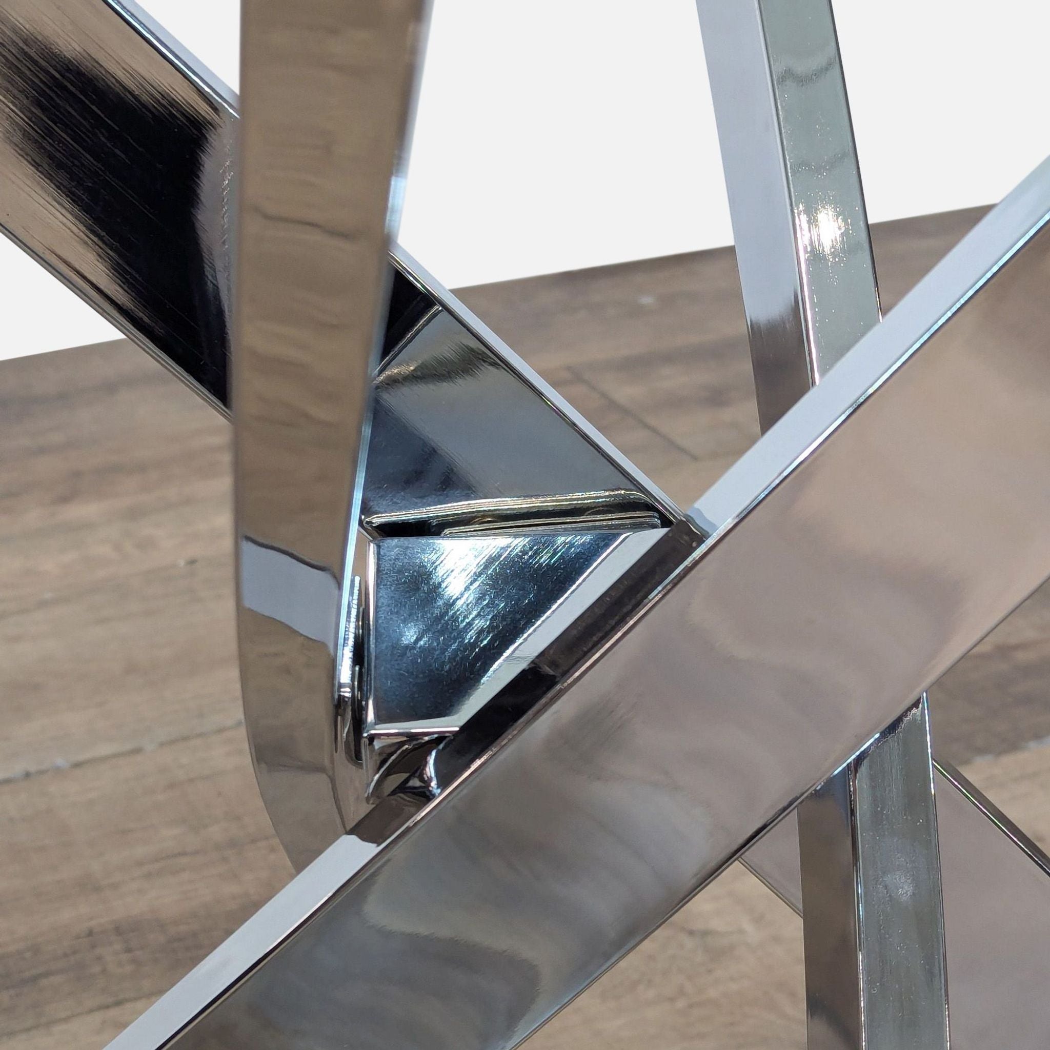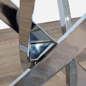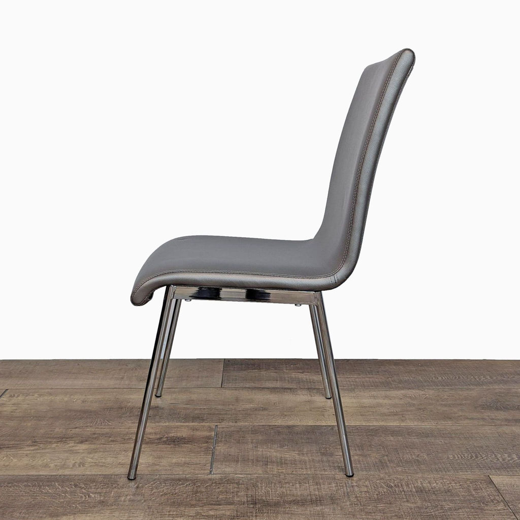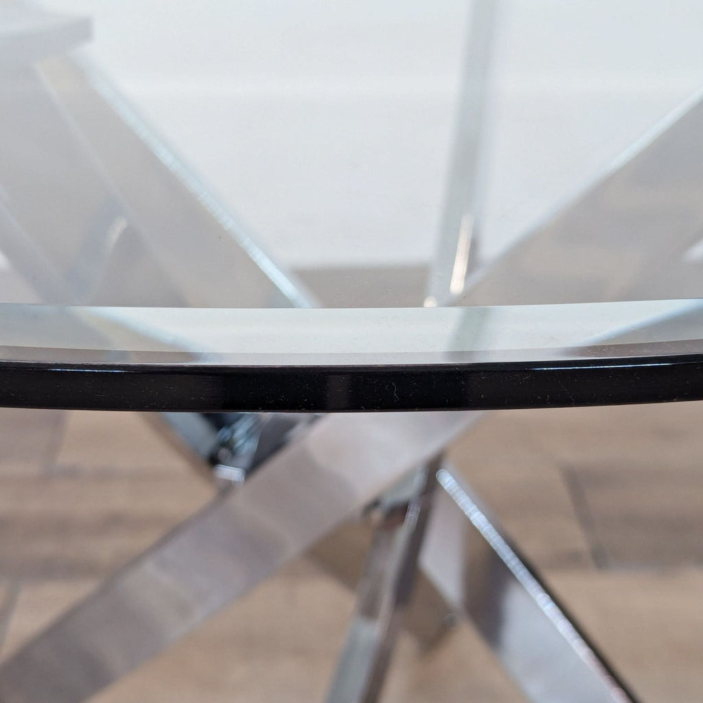 The Putnam 5-Piece Dining Set features a round glass top table with a uniquely designed sculptural base. The four chairs feature a sturdy chrome metal frame with a slim waterfall silver metallic faux leather profile.