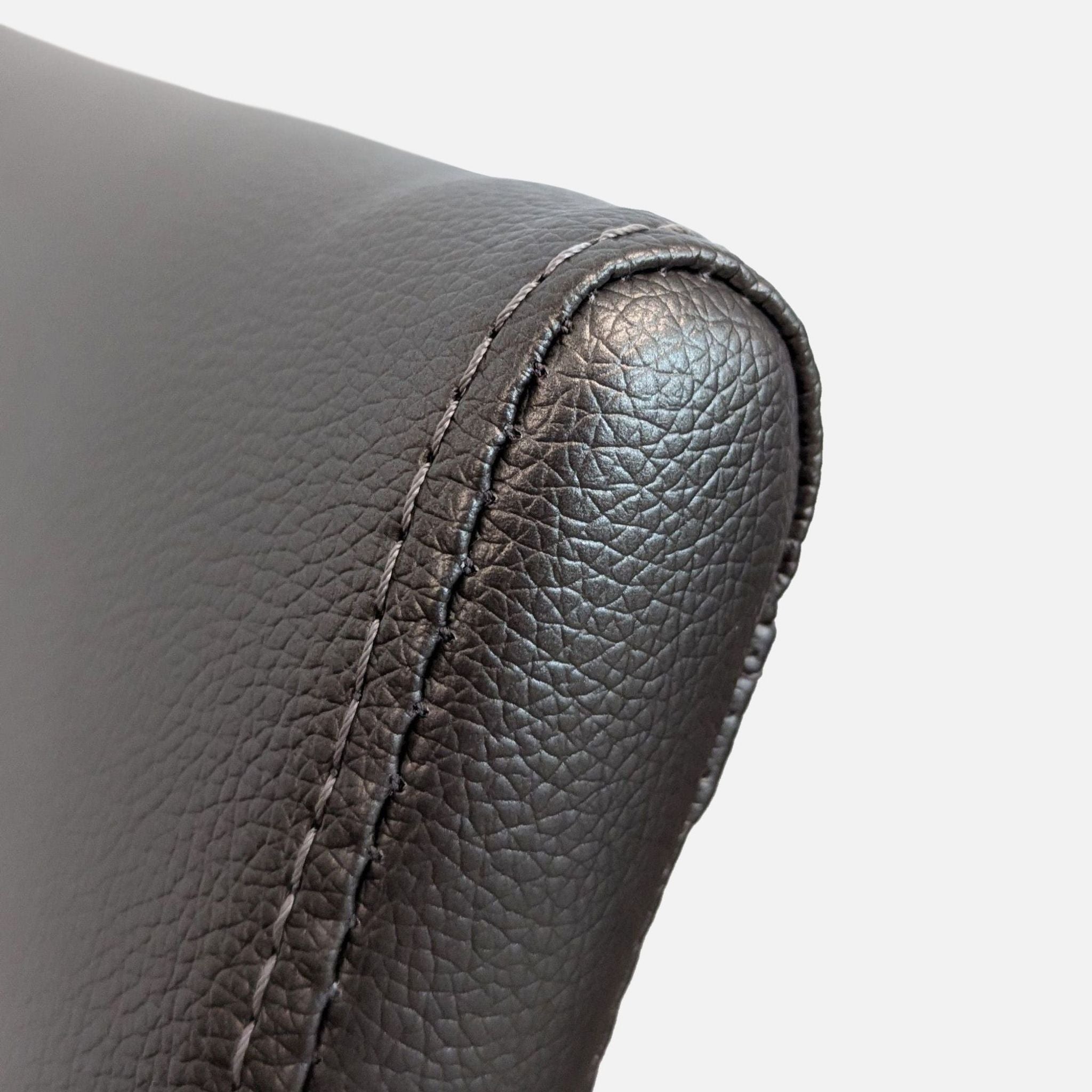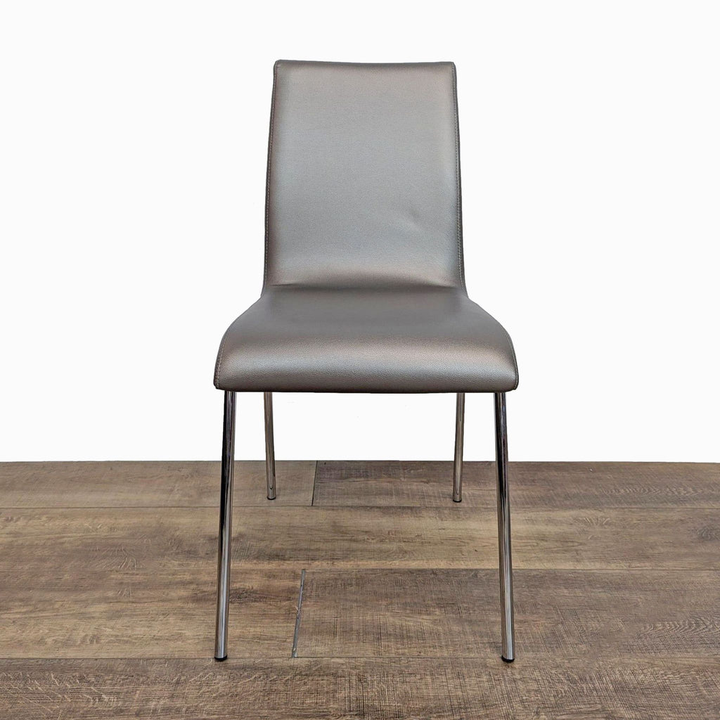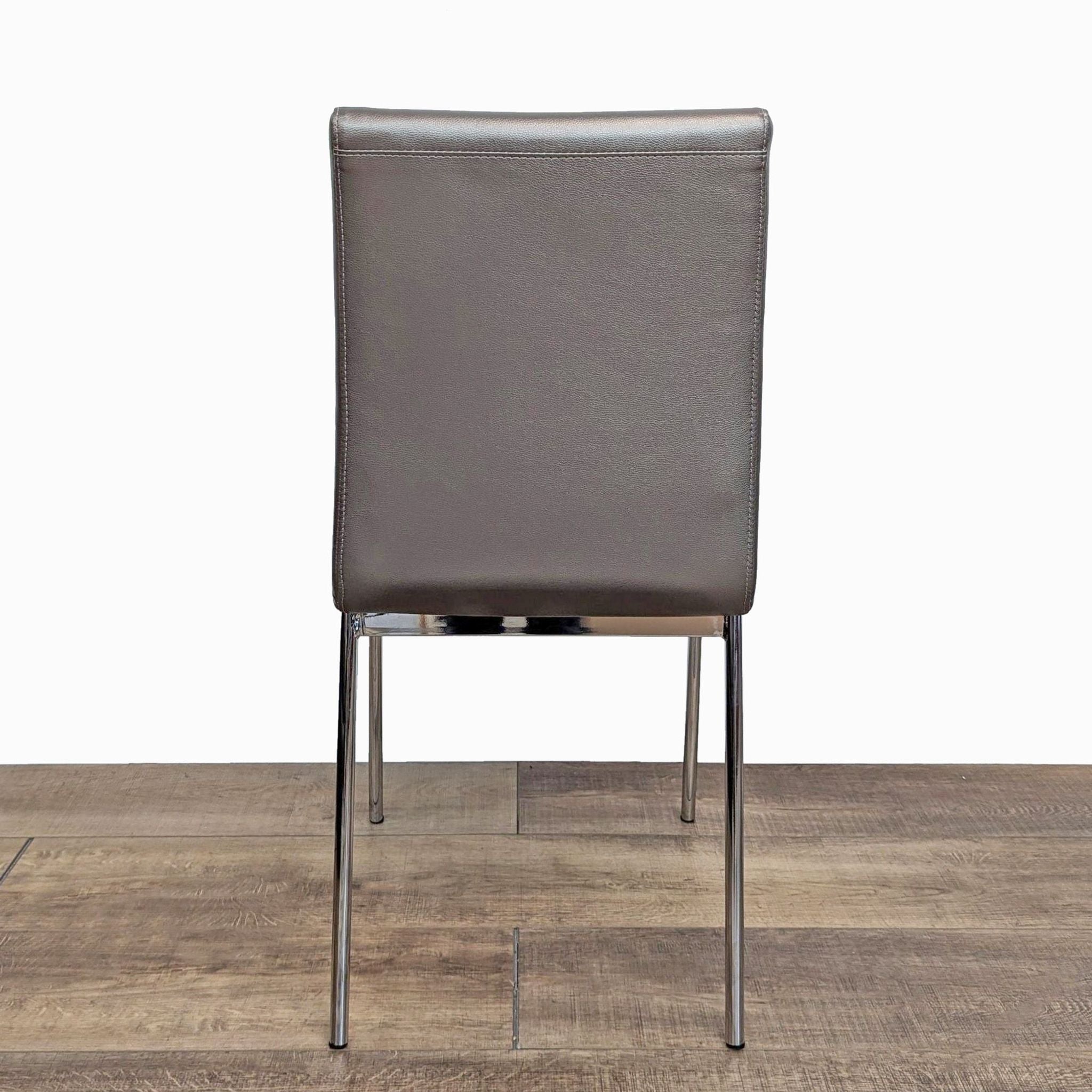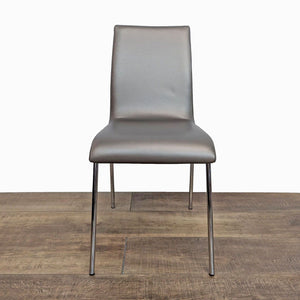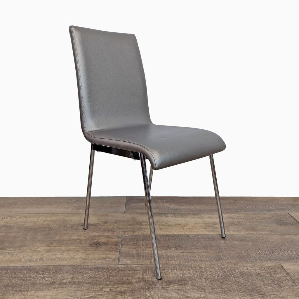 The Putnam 5-Piece Dining Set features a round glass top table with a uniquely designed sculptural base. The four chairs feature a sturdy chrome metal frame with a slim waterfall silver metallic faux leather profile.