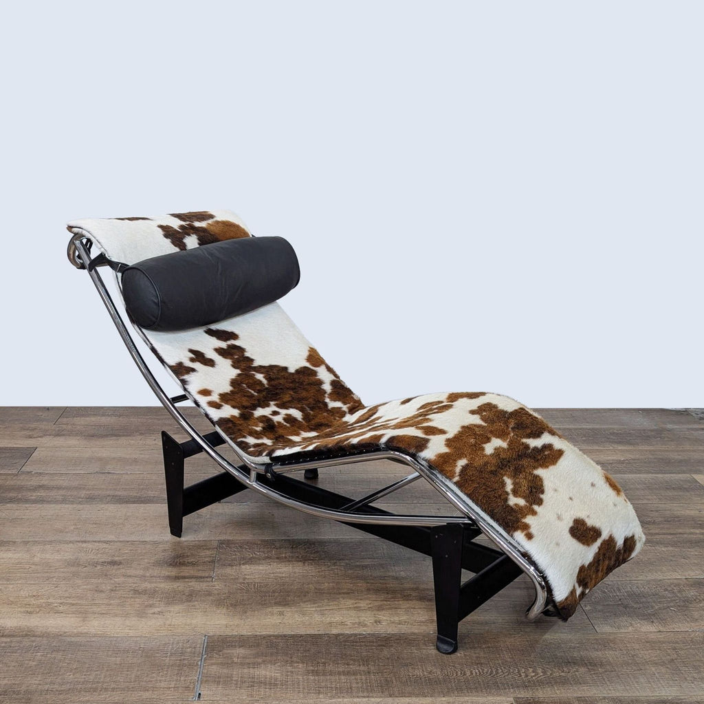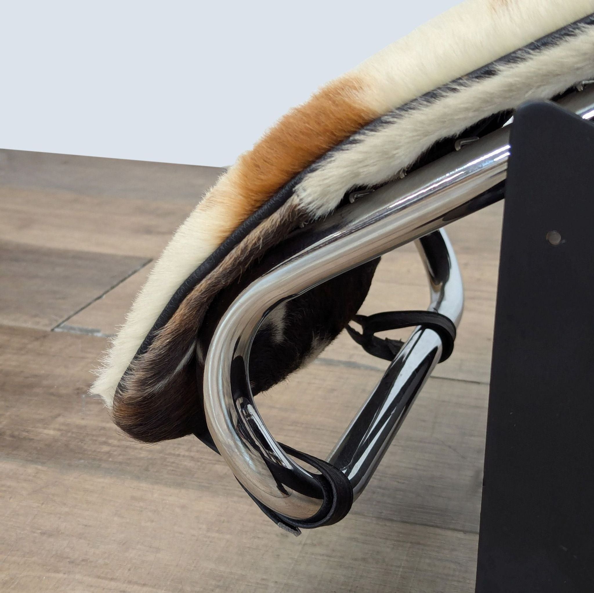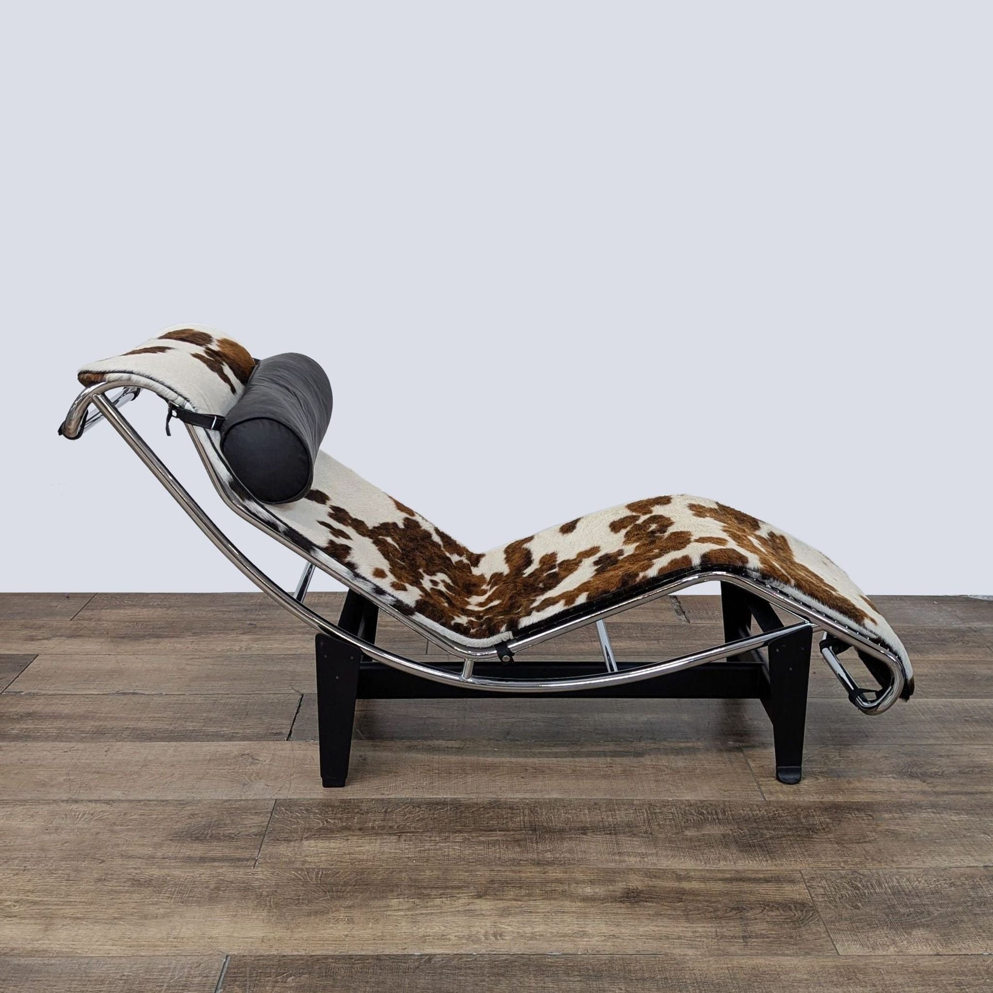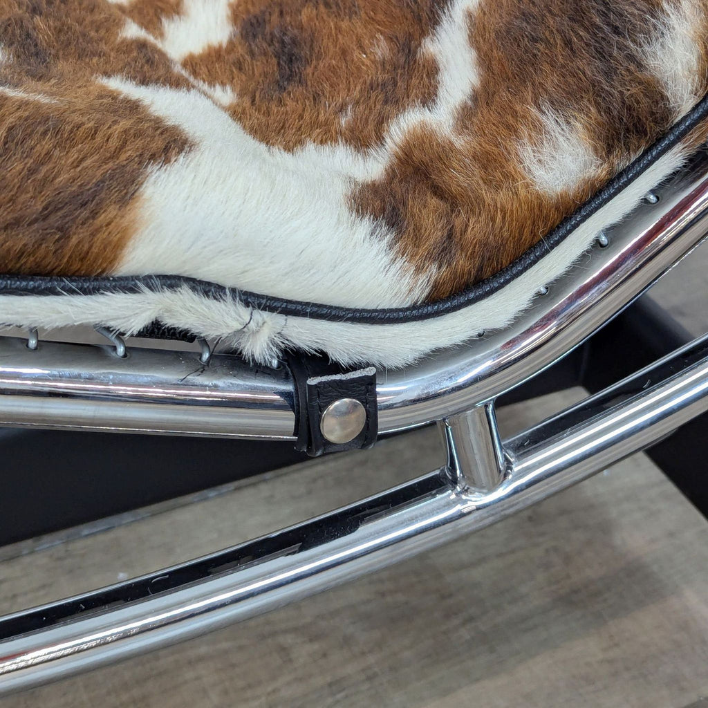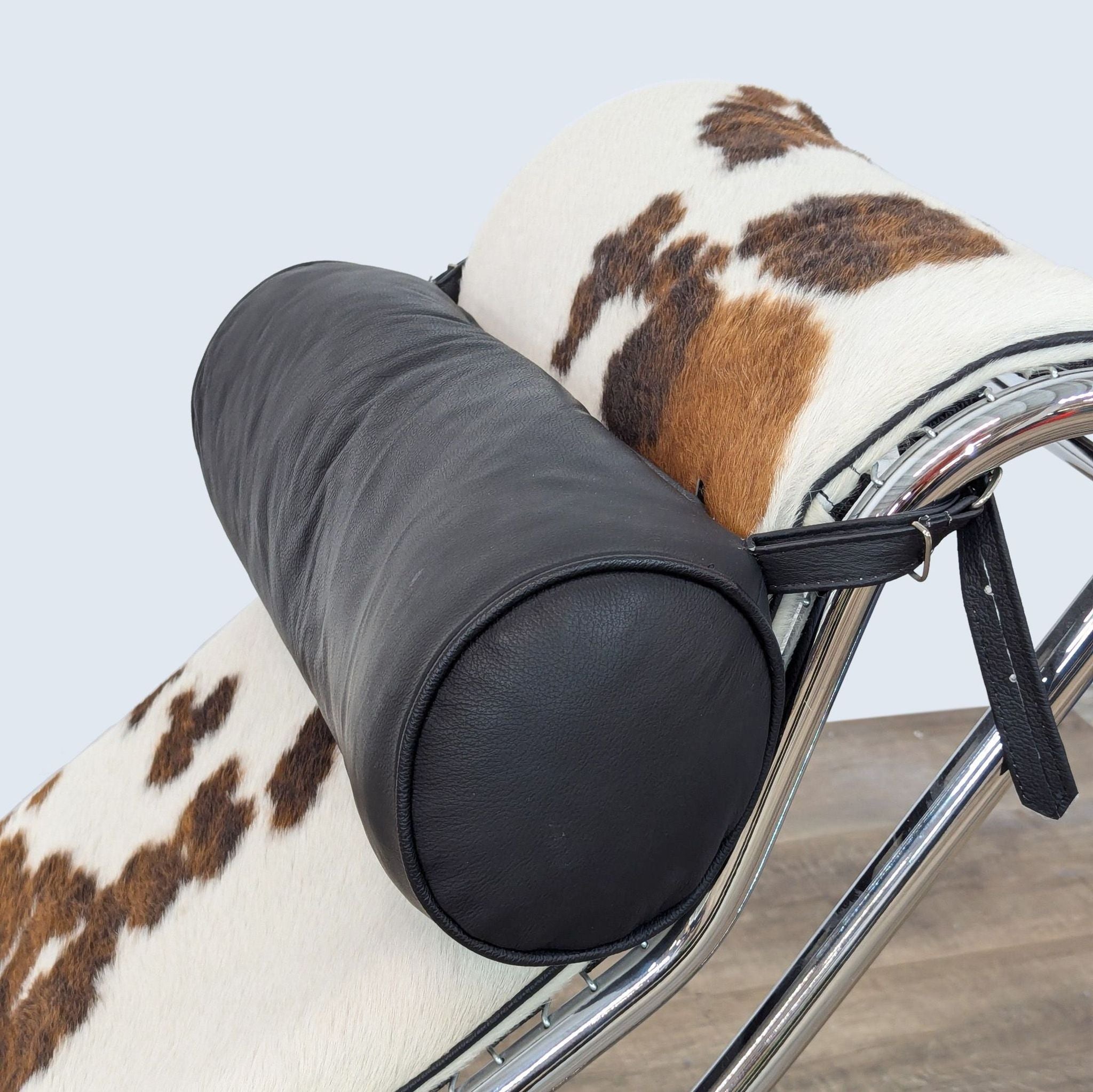 This lounge chair features a black steel base with a tubular chrome frame. The cushion is upholstered in cowhide and includes an adjustable pillow. One leg missing rubber foot cover.