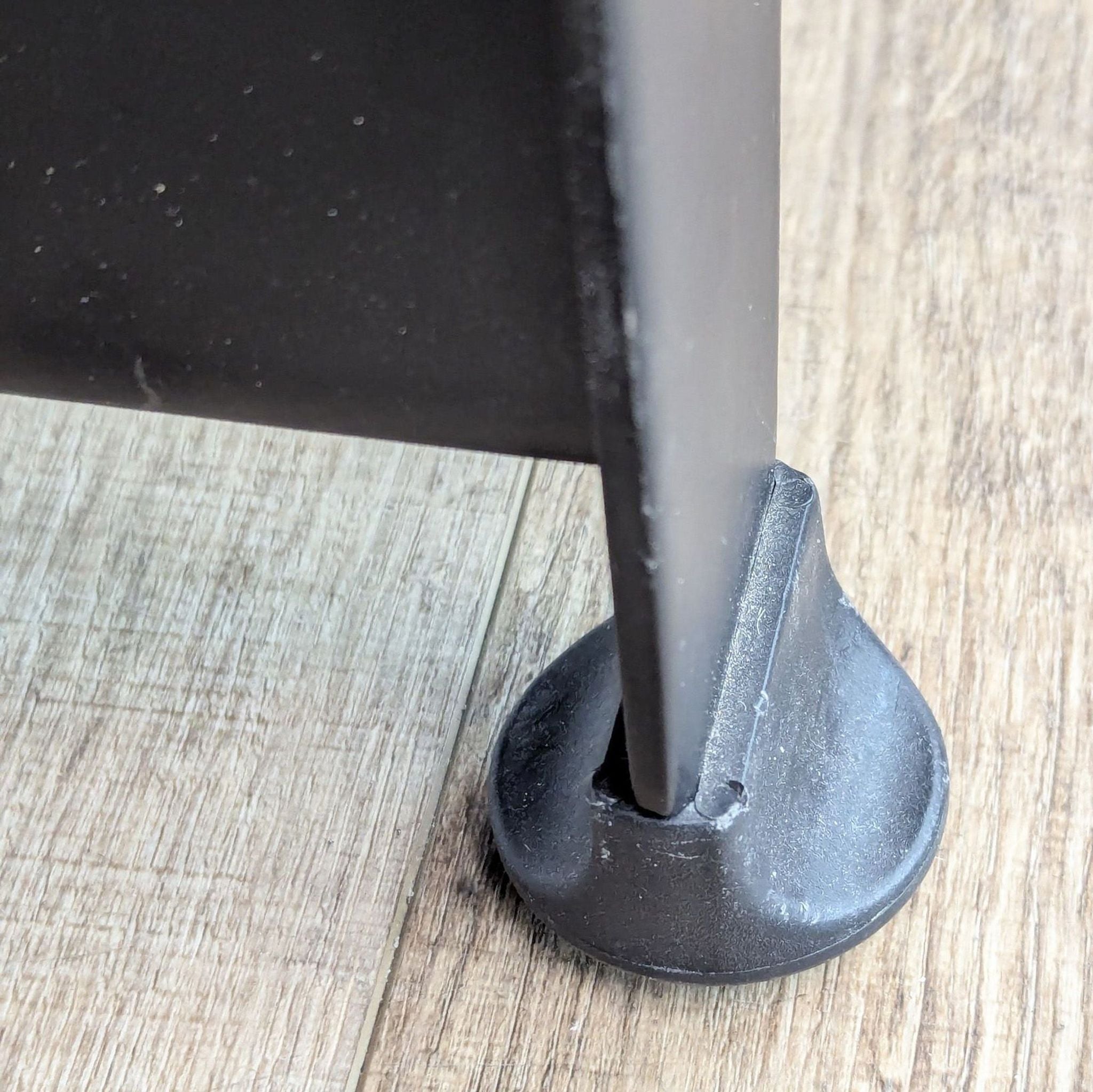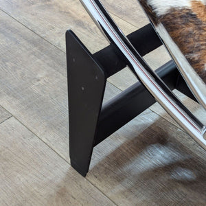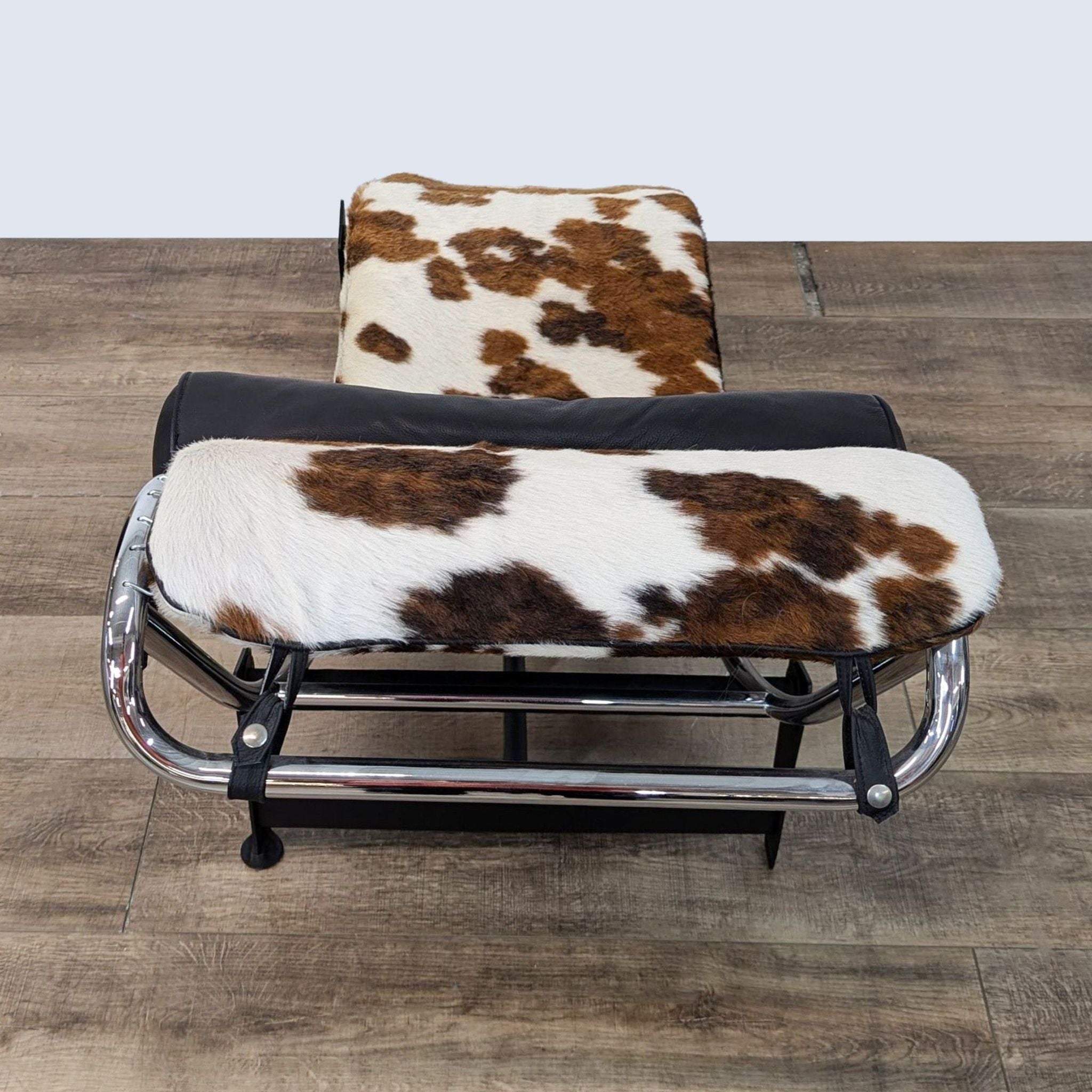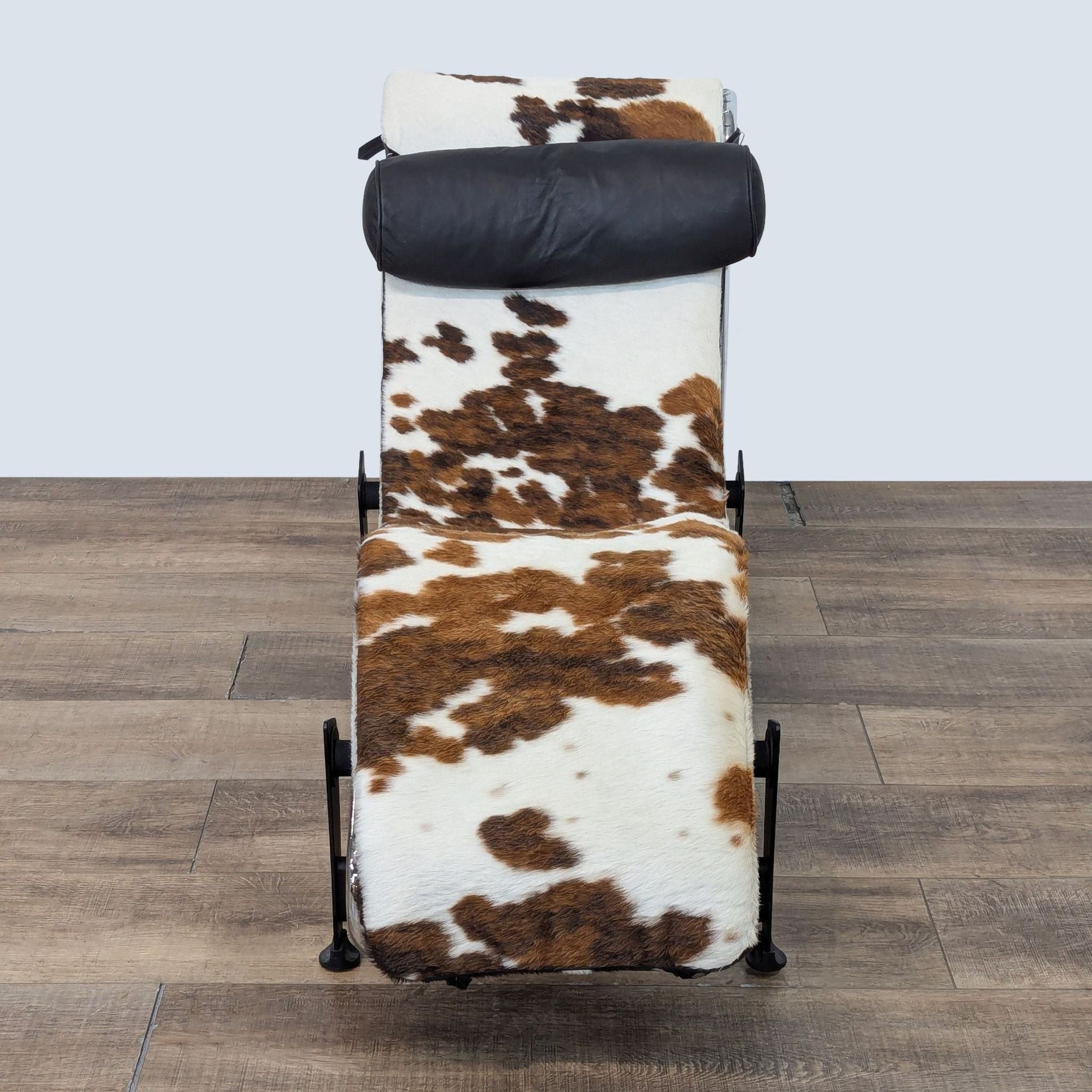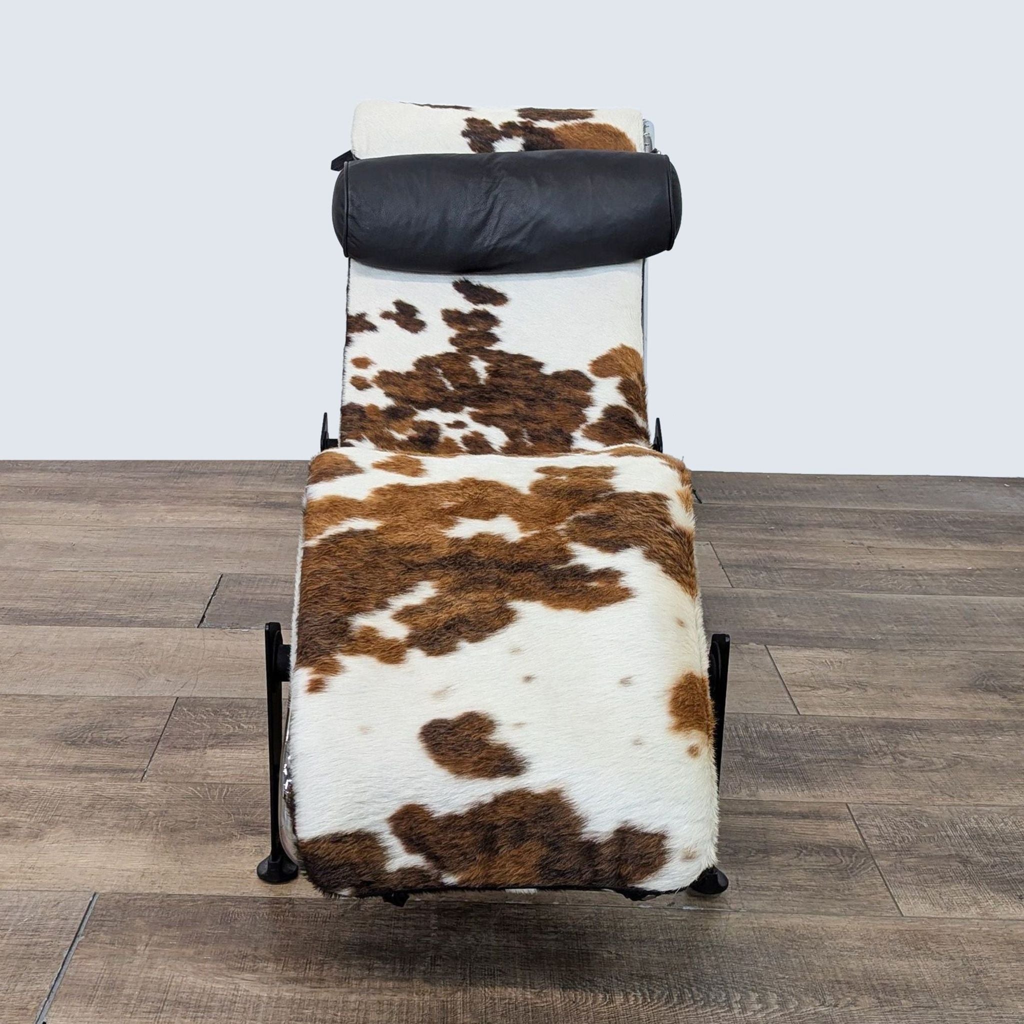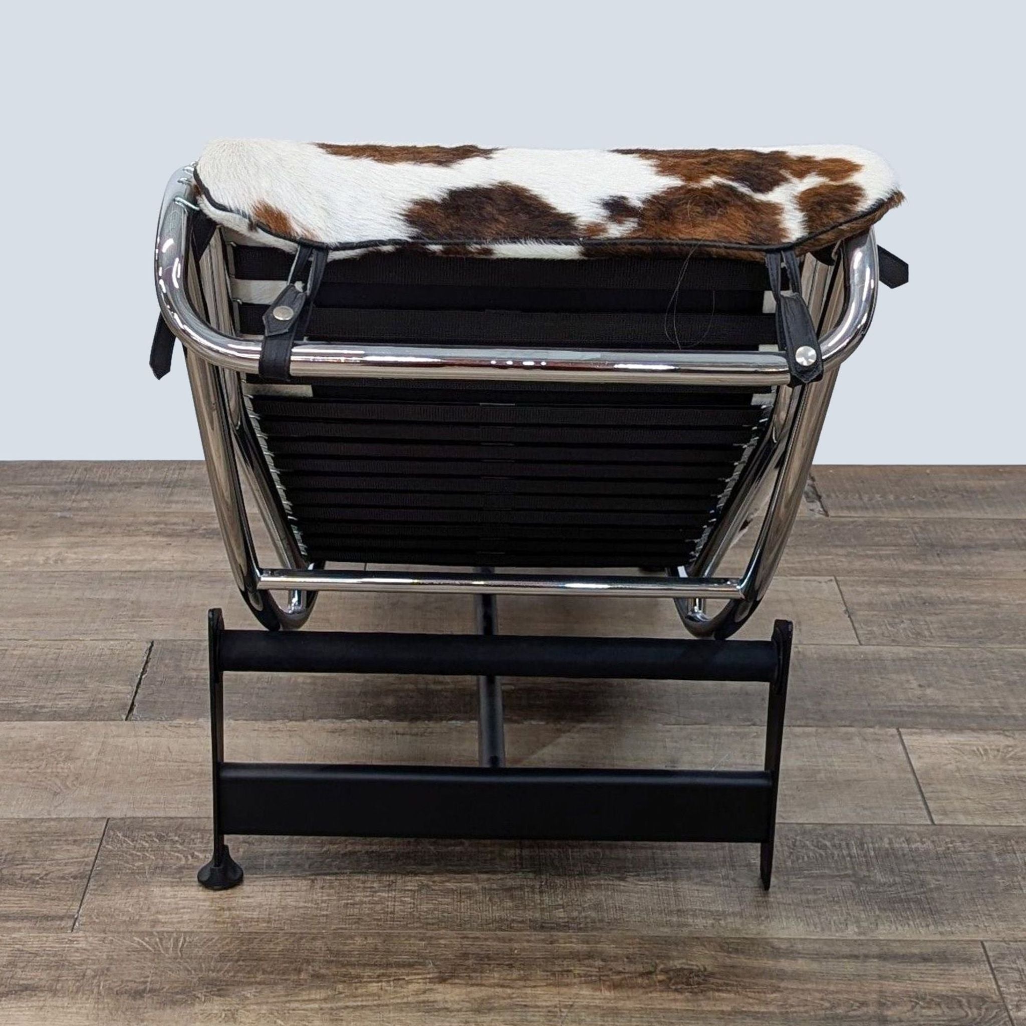 This lounge chair features a black steel base with a tubular chrome frame. The cushion is upholstered in cowhide and includes an adjustable pillow. One leg missing rubber foot cover.