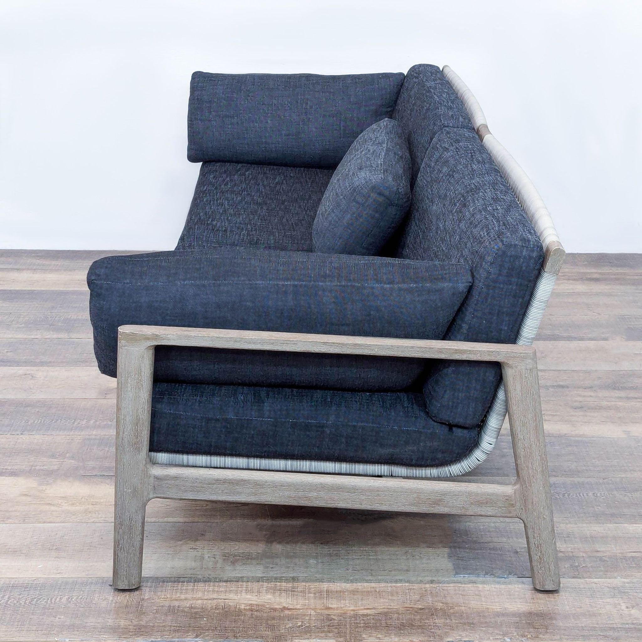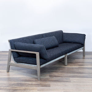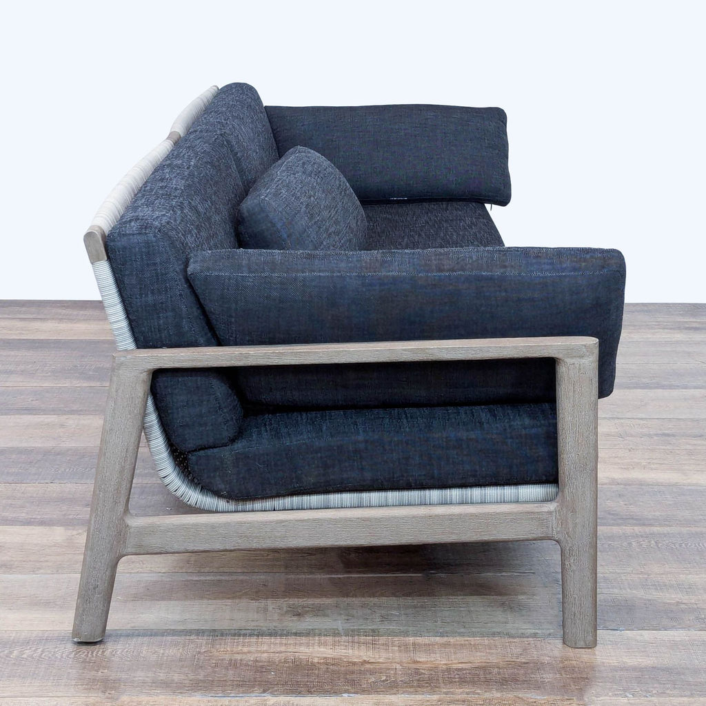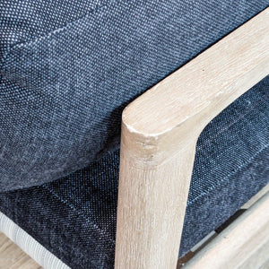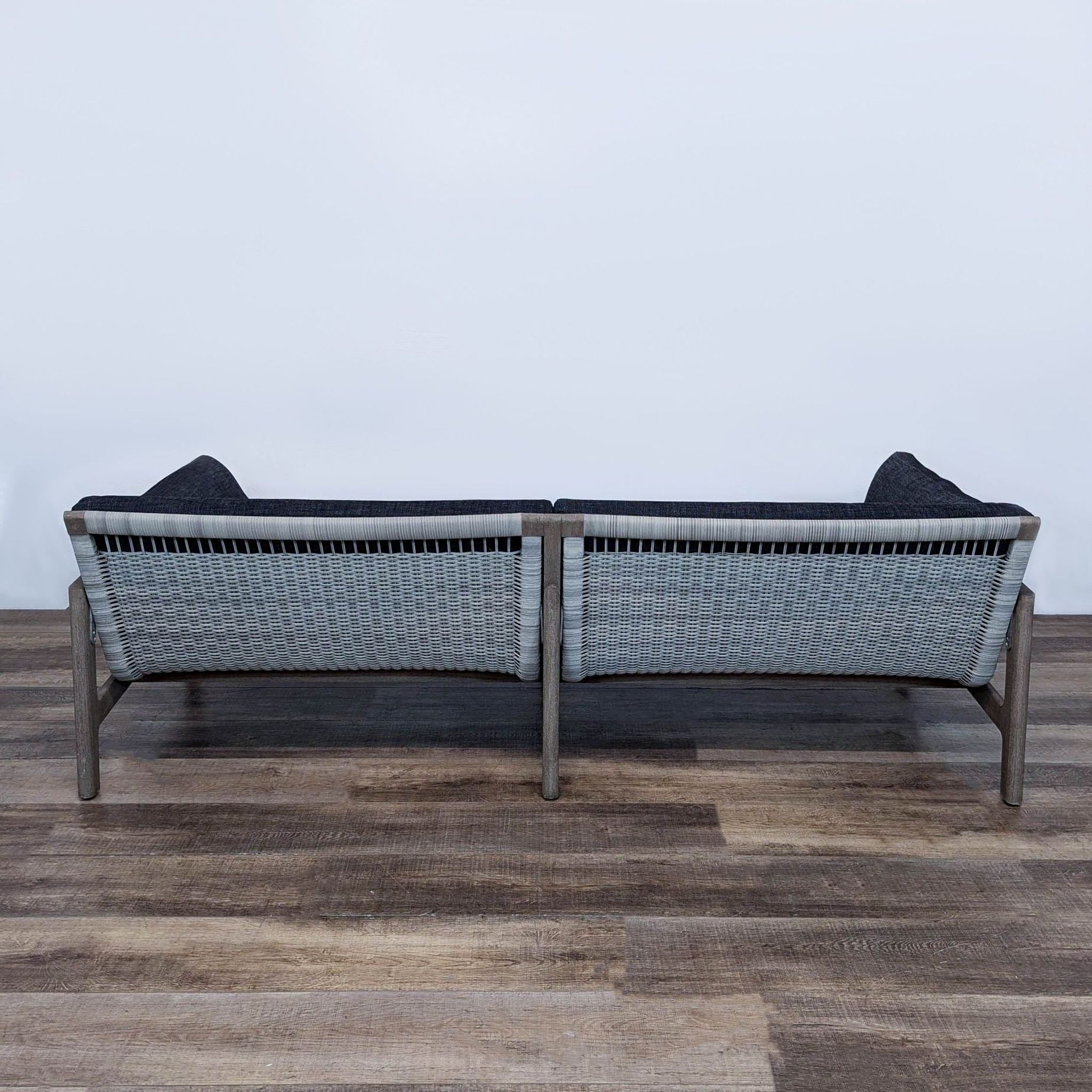 The Mesa sofa features an open and architectural weathered teak frame with handwoven all-weather wicker on the back and has quick dry upholstered cushions.