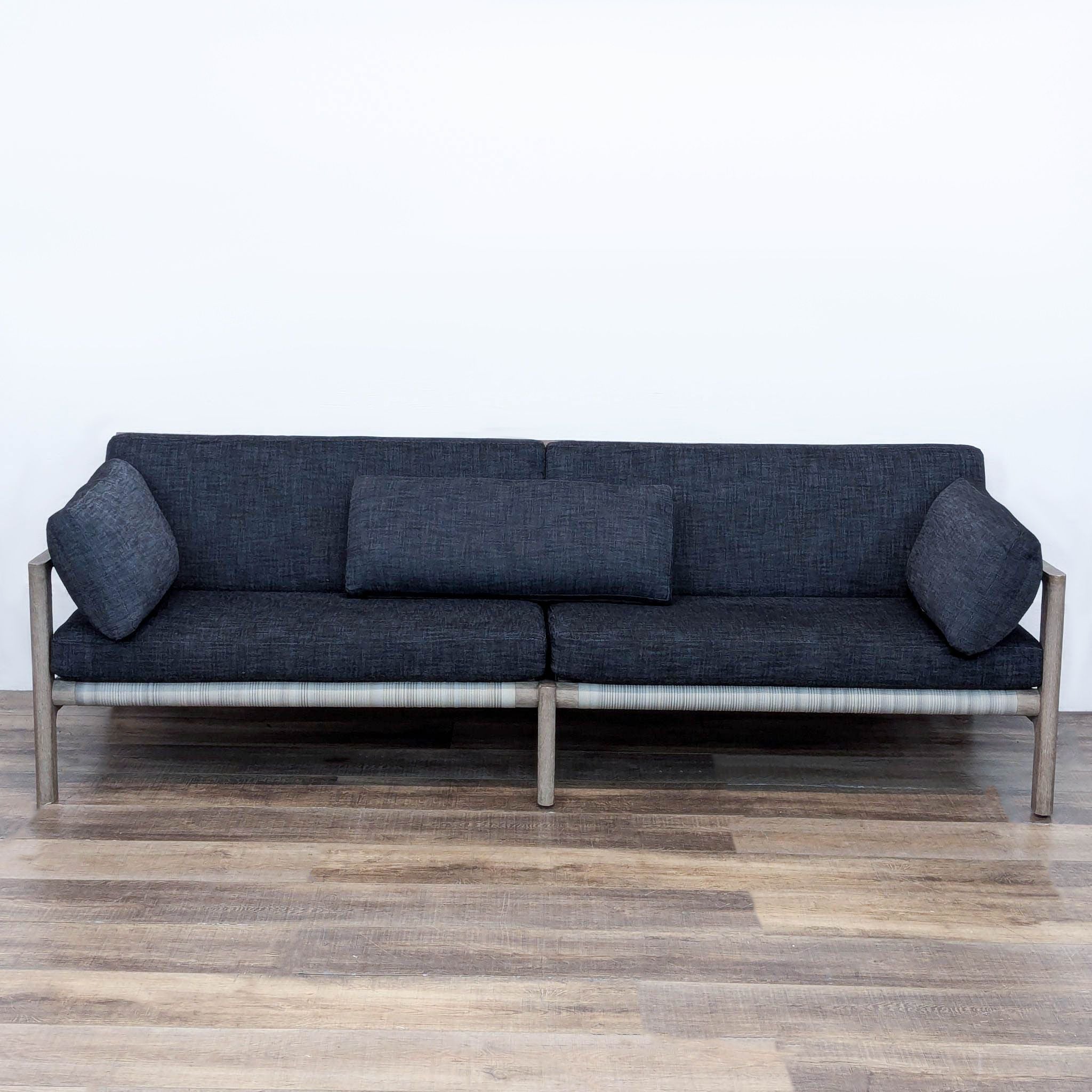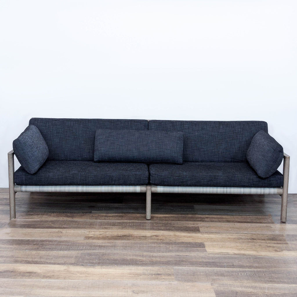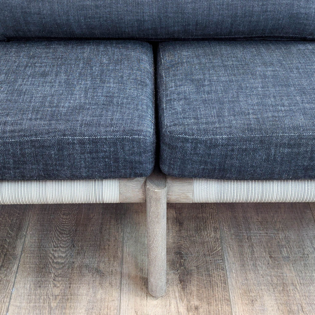 The Mesa sofa features an open and architectural weathered teak frame with handwoven all-weather wicker on the back and has quick dry upholstered cushions.