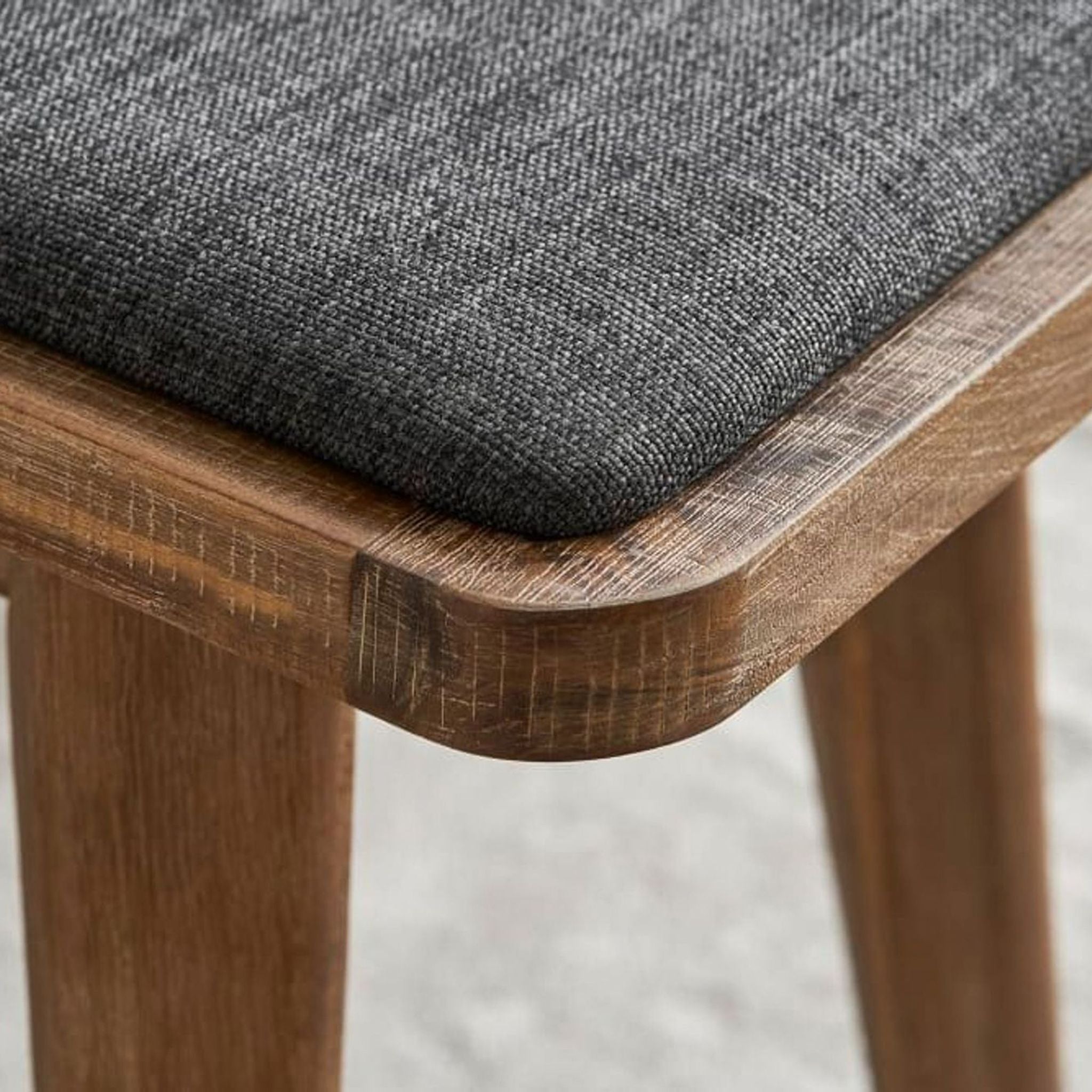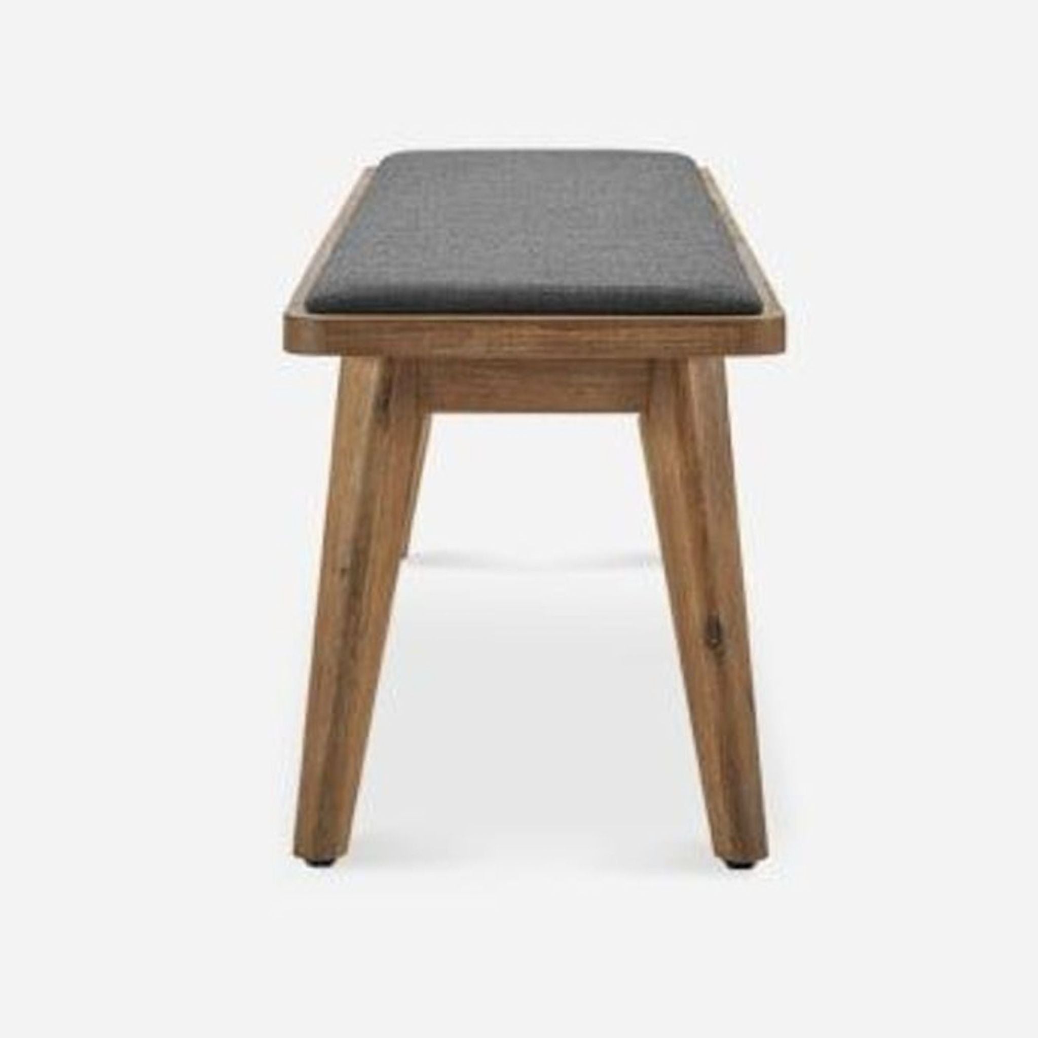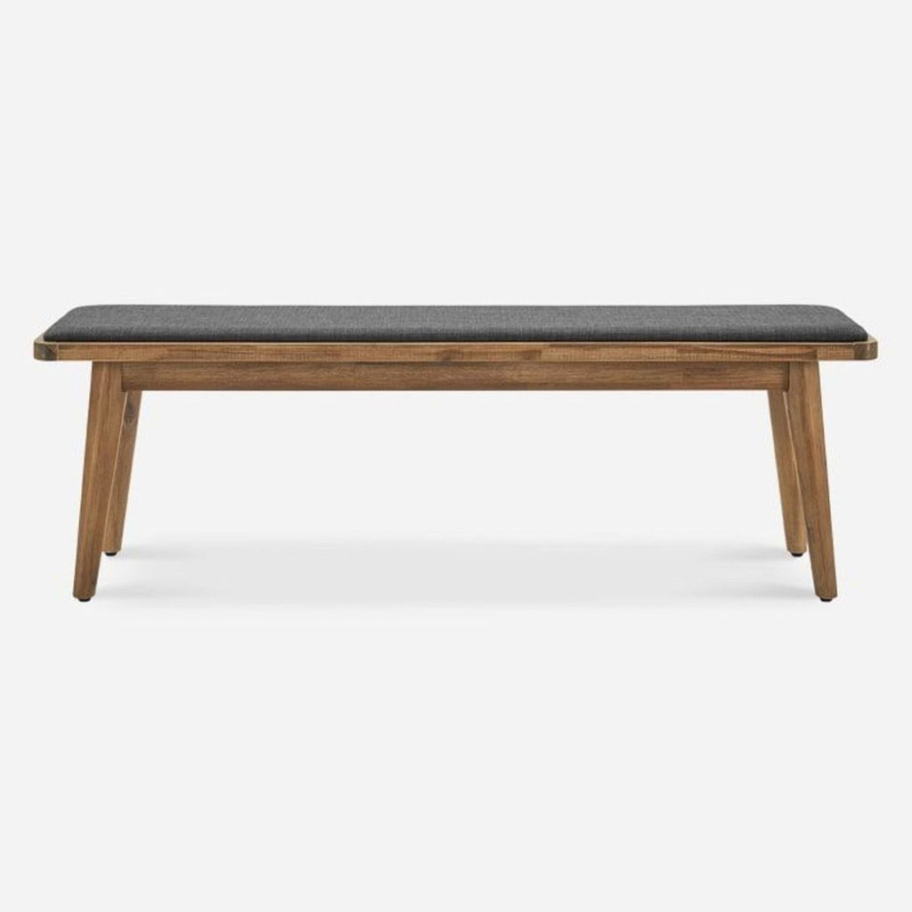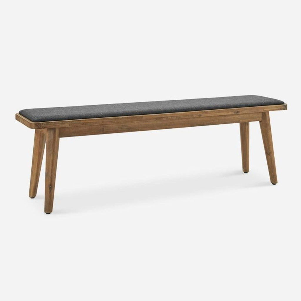 The Seb bench features mid century style with a wood frame and upholstered seat.