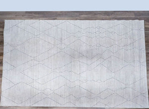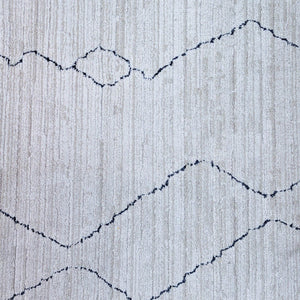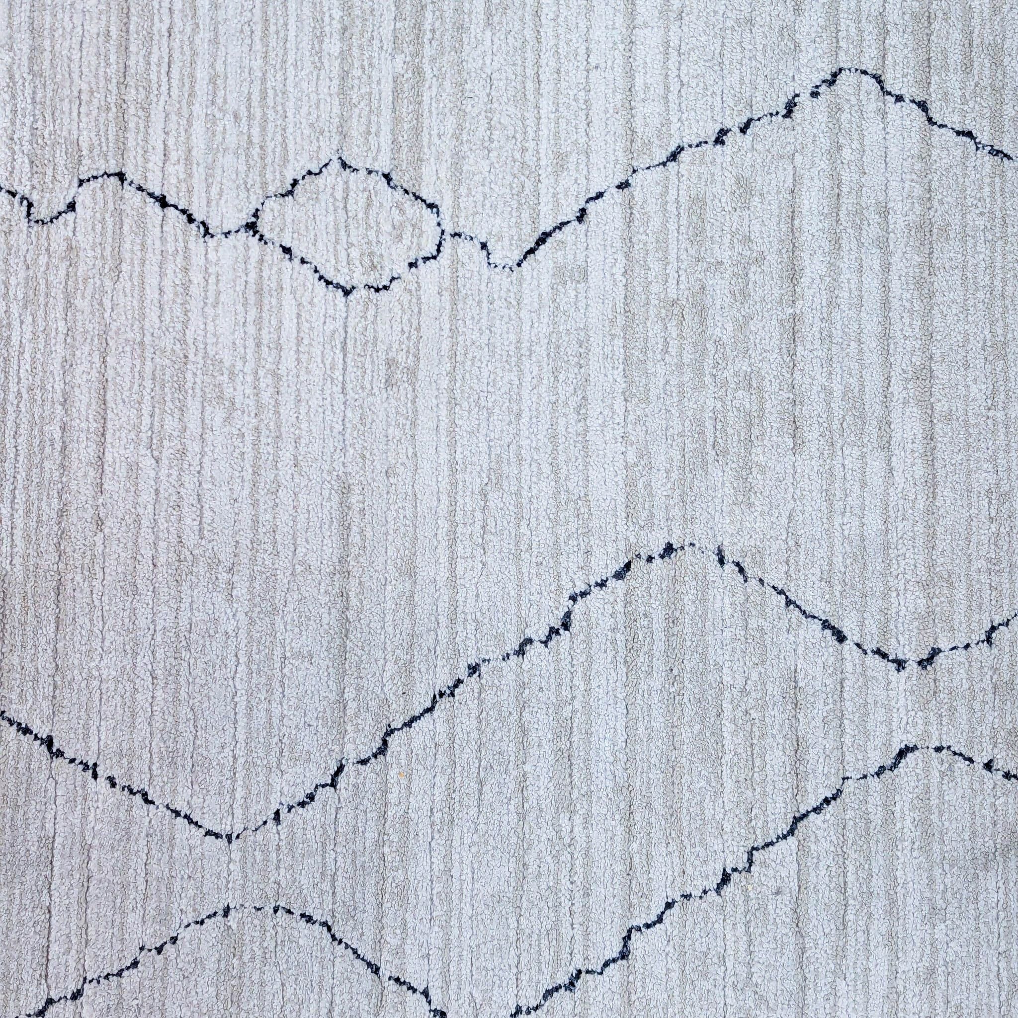 Machine woven polyester rug with wavering lines in a diamond pattern.