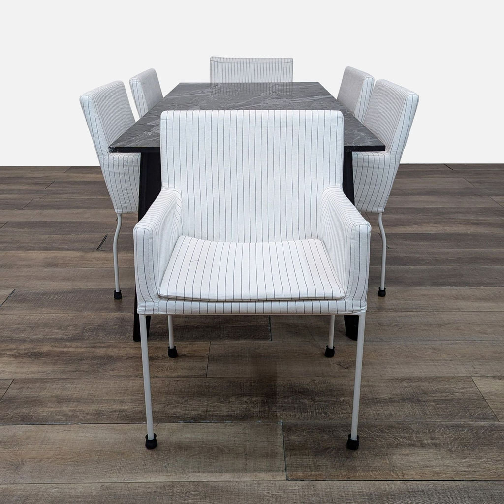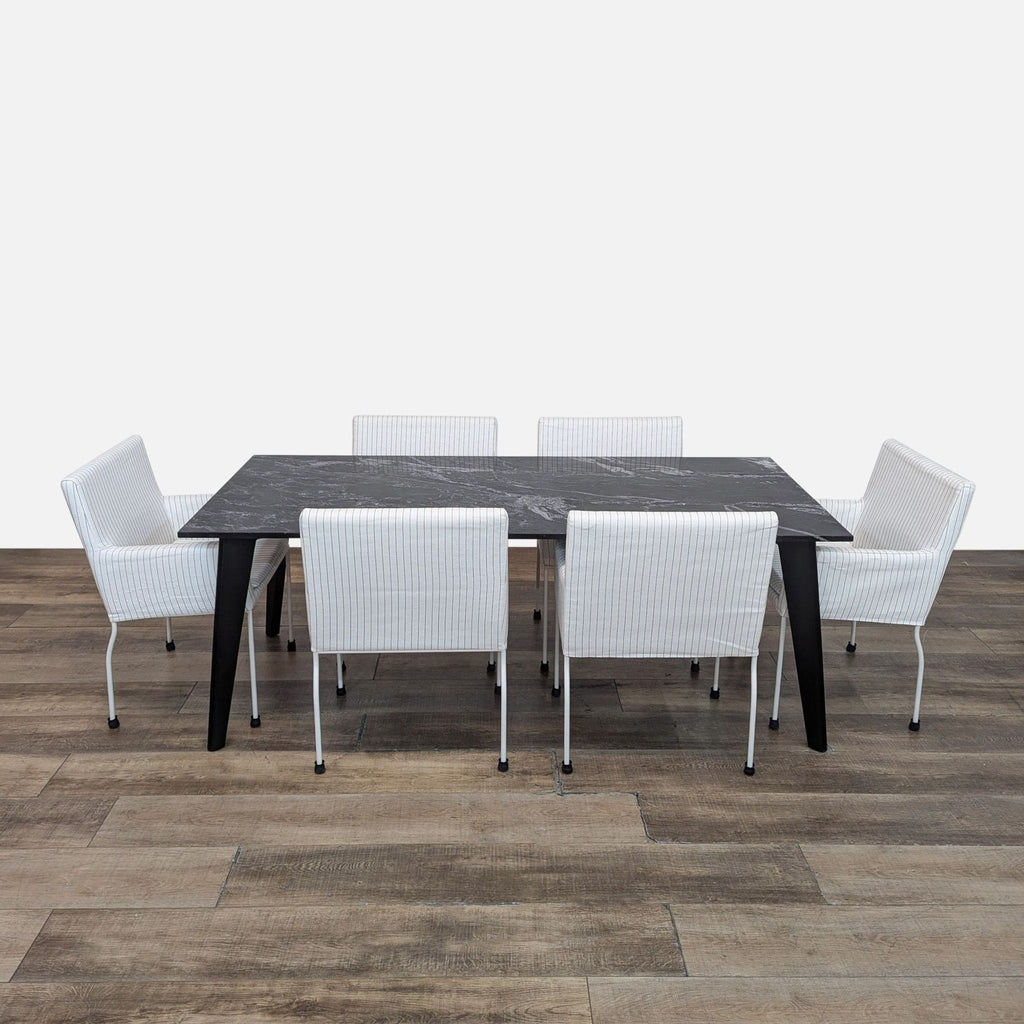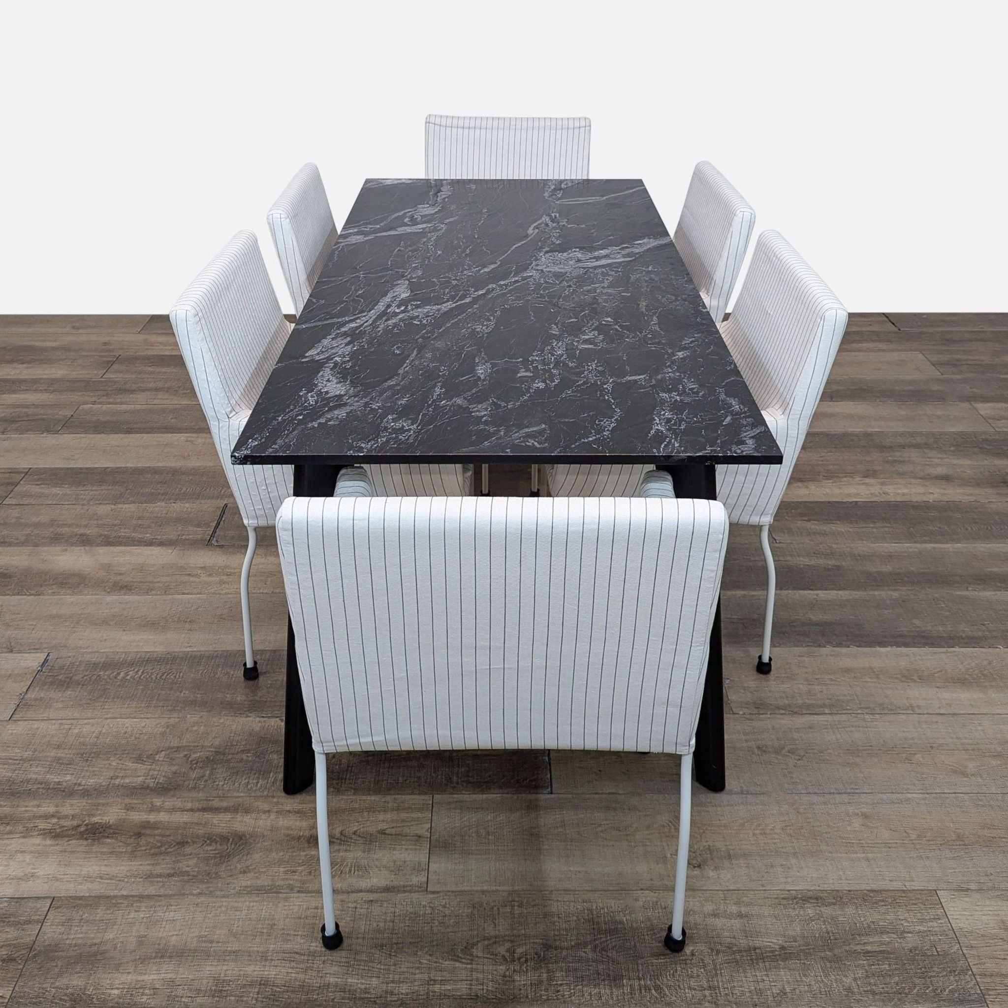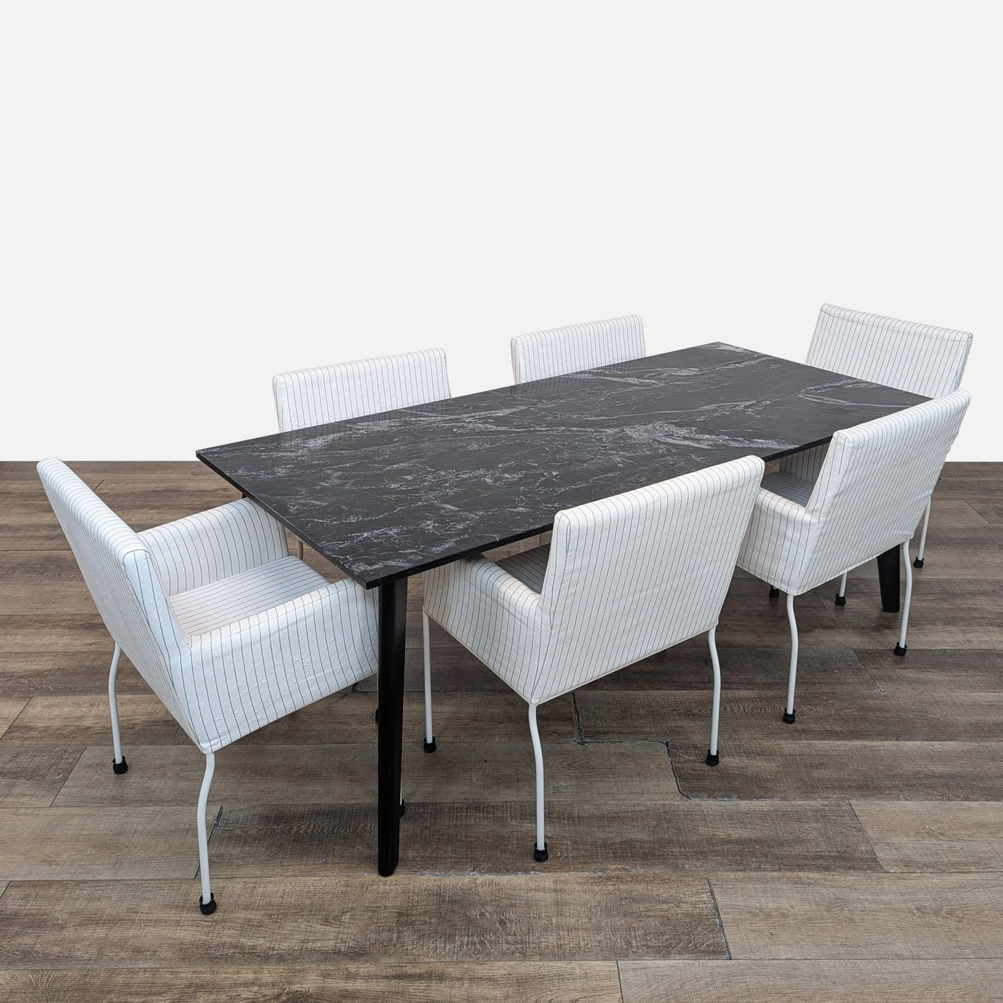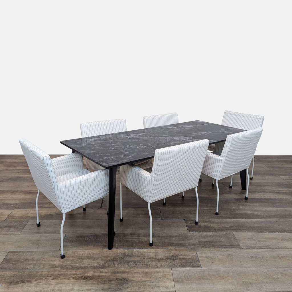 Harper black marble dining table with 6 Drop ivory and black strip dining chairs with metal frame.